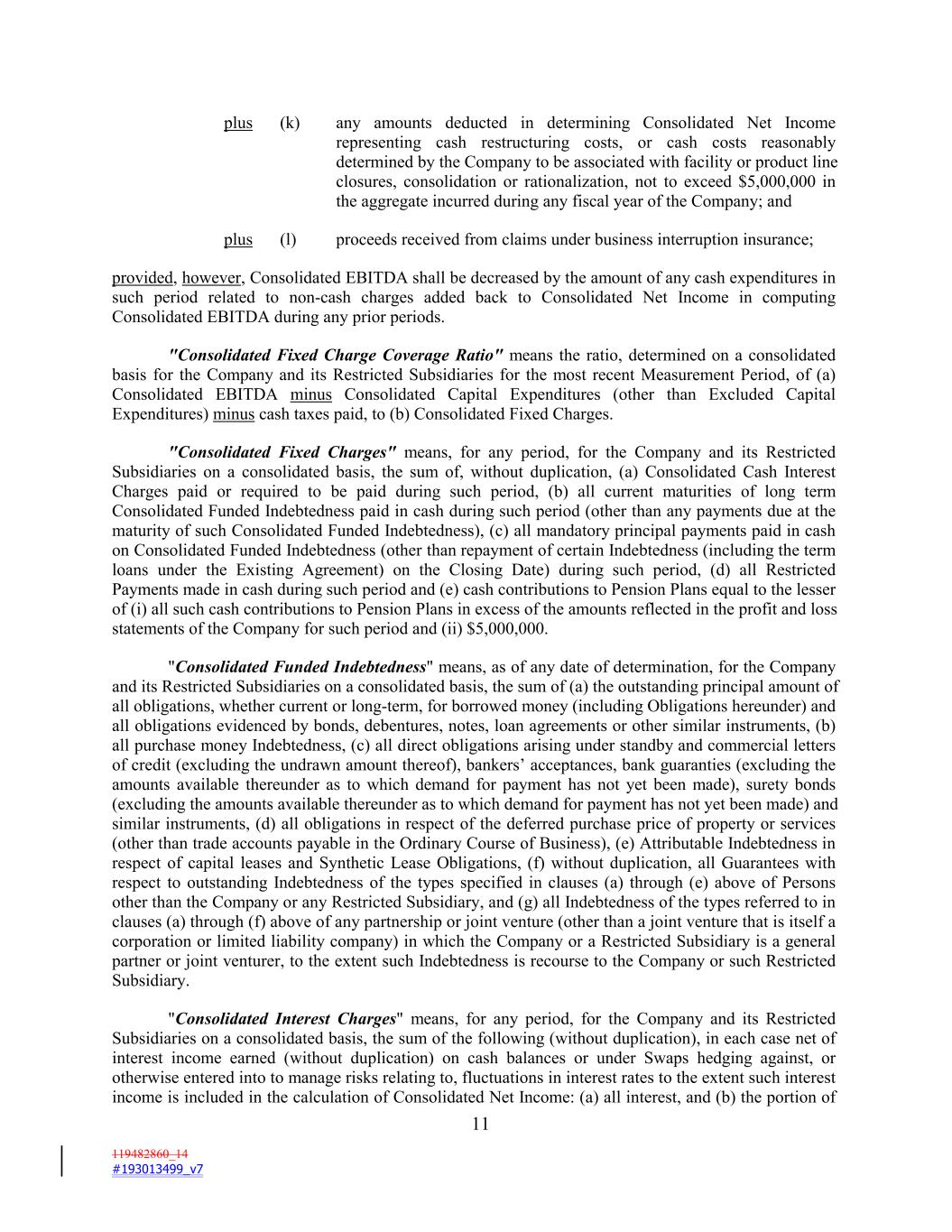 plus (k) any amounts deducted in determining Consolidated Net Income representing cash restructuring costs, or cash costs reasonably determined by the Company to be associated with facility or product line closures, consolidation or rationalization, not to exceed $5,000,000 in the aggregate incurred during any fiscal year of the Company; and plus (l) proceeds received from claims under business interruption insurance; provided, however, Consolidated EBITDA shall be decreased by the amount of any cash expenditures in such period related to non-cash charges added back to Consolidated Net Income in computing Consolidated EBITDA during any prior periods. "Consolidated Fixed Charge Coverage Ratio" means the ratio, determined on a consolidated basis for the Company and its Restricted Subsidiaries for the most recent Measurement Period, of (a) Consolidated EBITDA minus Consolidated Capital Expenditures (other than Excluded Capital Expenditures) minus cash taxes paid, to (b) Consolidated Fixed Charges. "Consolidated Fixed Charges" means, for any period, for the Company and its Restricted Subsidiaries on a consolidated basis, the sum of, without duplication, (a) Consolidated Cash Interest Charges paid or required to be paid during such period, (b) all current maturities of long term Consolidated Funded Indebtedness paid in cash during such period (other than any payments due at the maturity of such Consolidated Funded Indebtedness), (c) all mandatory principal payments paid in cash on Consolidated Funded Indebtedness (other than repayment of certain Indebtedness (including the term loans under the Existing Agreement) on the Closing Date) during such period, (d) all Restricted Payments made in cash during such period and (e) cash contributions to Pension Plans equal to the lesser of (i) all such cash contributions to Pension Plans in excess of the amounts reflected in the profit and loss statements of the Company for such period and (ii) $5,000,000. "Consolidated Funded Indebtedness" means, as of any date of determination, for the Company and its Restricted Subsidiaries on a consolidated basis, the sum of (a) the outstanding principal amount of all obligations, whether current or long-term, for borrowed money (including Obligations hereunder) and all obligations evidenced by bonds, debentures, notes, loan agreements or other similar instruments, (b) all purchase money Indebtedness, (c) all direct obligations arising under standby and commercial letters of credit (excluding the undrawn amount thereof), bankers’ acceptances, bank guaranties (excluding the amounts available thereunder as to which demand for payment has not yet been made), surety bonds (excluding the amounts available thereunder as to which demand for payment has not yet been made) and similar instruments, (d) all obligations in respect of the deferred purchase price of property or services (other than trade accounts payable in the Ordinary Course of Business), (e) Attributable Indebtedness in respect of capital leases and Synthetic Lease Obligations, (f) without duplication, all Guarantees with respect to outstanding Indebtedness of the types specified in clauses (a) through (e) above of Persons other than the Company or any Restricted Subsidiary, and (g) all Indebtedness of the types referred to in clauses (a) through (f) above of any partnership or joint venture (other than a joint venture that is itself a corporation or limited liability company) in which the Company or a Restricted Subsidiary is a general partner or joint venturer, to the extent such Indebtedness is recourse to the Company or such Restricted Subsidiary. "Consolidated Interest Charges" means, for any period, for the Company and its Restricted Subsidiaries on a consolidated basis, the sum of the following (without duplication), in each case net of interest income earned (without duplication) on cash balances or under Swaps hedging against, or otherwise entered into to manage risks relating to, fluctuations in interest rates to the extent such interest income is included in the calculation of Consolidated Net Income: (a) all interest, and (b) the portion of 11 119482860_14 #193013499_v7
