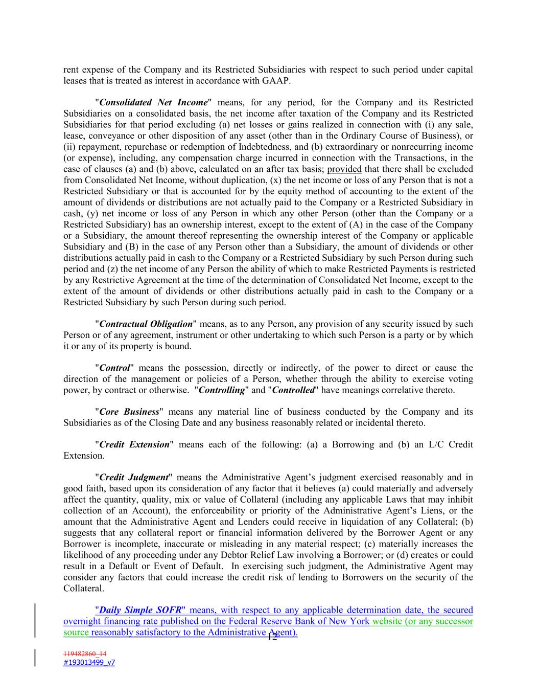 rent expense of the Company and its Restricted Subsidiaries with respect to such period under capital leases that is treated as interest in accordance with GAAP. "Consolidated Net Income" means, for any period, for the Company and its Restricted Subsidiaries on a consolidated basis, the net income after taxation of the Company and its Restricted Subsidiaries for that period excluding (a) net losses or gains realized in connection with (i) any sale, lease, conveyance or other disposition of any asset (other than in the Ordinary Course of Business), or (ii) repayment, repurchase or redemption of Indebtedness, and (b) extraordinary or nonrecurring income (or expense), including, any compensation charge incurred in connection with the Transactions, in the case of clauses (a) and (b) above, calculated on an after tax basis; provided that there shall be excluded from Consolidated Net Income, without duplication, (x) the net income or loss of any Person that is not a Restricted Subsidiary or that is accounted for by the equity method of accounting to the extent of the amount of dividends or distributions are not actually paid to the Company or a Restricted Subsidiary in cash, (y) net income or loss of any Person in which any other Person (other than the Company or a Restricted Subsidiary) has an ownership interest, except to the extent of (A) in the case of the Company or a Subsidiary, the amount thereof representing the ownership interest of the Company or applicable Subsidiary and (B) in the case of any Person other than a Subsidiary, the amount of dividends or other distributions actually paid in cash to the Company or a Restricted Subsidiary by such Person during such period and (z) the net income of any Person the ability of which to make Restricted Payments is restricted by any Restrictive Agreement at the time of the determination of Consolidated Net Income, except to the extent of the amount of dividends or other distributions actually paid in cash to the Company or a Restricted Subsidiary by such Person during such period. "Contractual Obligation" means, as to any Person, any provision of any security issued by such Person or of any agreement, instrument or other undertaking to which such Person is a party or by which it or any of its property is bound. "Control" means the possession, directly or indirectly, of the power to direct or cause the direction of the management or policies of a Person, whether through the ability to exercise voting power, by contract or otherwise. "Controlling" and "Controlled" have meanings correlative thereto. "Core Business" means any material line of business conducted by the Company and its Subsidiaries as of the Closing Date and any business reasonably related or incidental thereto. "Credit Extension" means each of the following: (a) a Borrowing and (b) an L/C Credit Extension. "Credit Judgment" means the Administrative Agent’s judgment exercised reasonably and in good faith, based upon its consideration of any factor that it believes (a) could materially and adversely affect the quantity, quality, mix or value of Collateral (including any applicable Laws that may inhibit collection of an Account), the enforceability or priority of the Administrative Agent’s Liens, or the amount that the Administrative Agent and Lenders could receive in liquidation of any Collateral; (b) suggests that any collateral report or financial information delivered by the Borrower Agent or any Borrower is incomplete, inaccurate or misleading in any material respect; (c) materially increases the likelihood of any proceeding under any Debtor Relief Law involving a Borrower; or (d) creates or could result in a Default or Event of Default. In exercising such judgment, the Administrative Agent may consider any factors that could increase the credit risk of lending to Borrowers on the security of the Collateral. "Daily Simple SOFR" means, with respect to any applicable determination date, the secured overnight financing rate published on the Federal Reserve Bank of New York website (or any successor source reasonably satisfactory to the Administrative Agent).12 119482860_14 #193013499_v7
