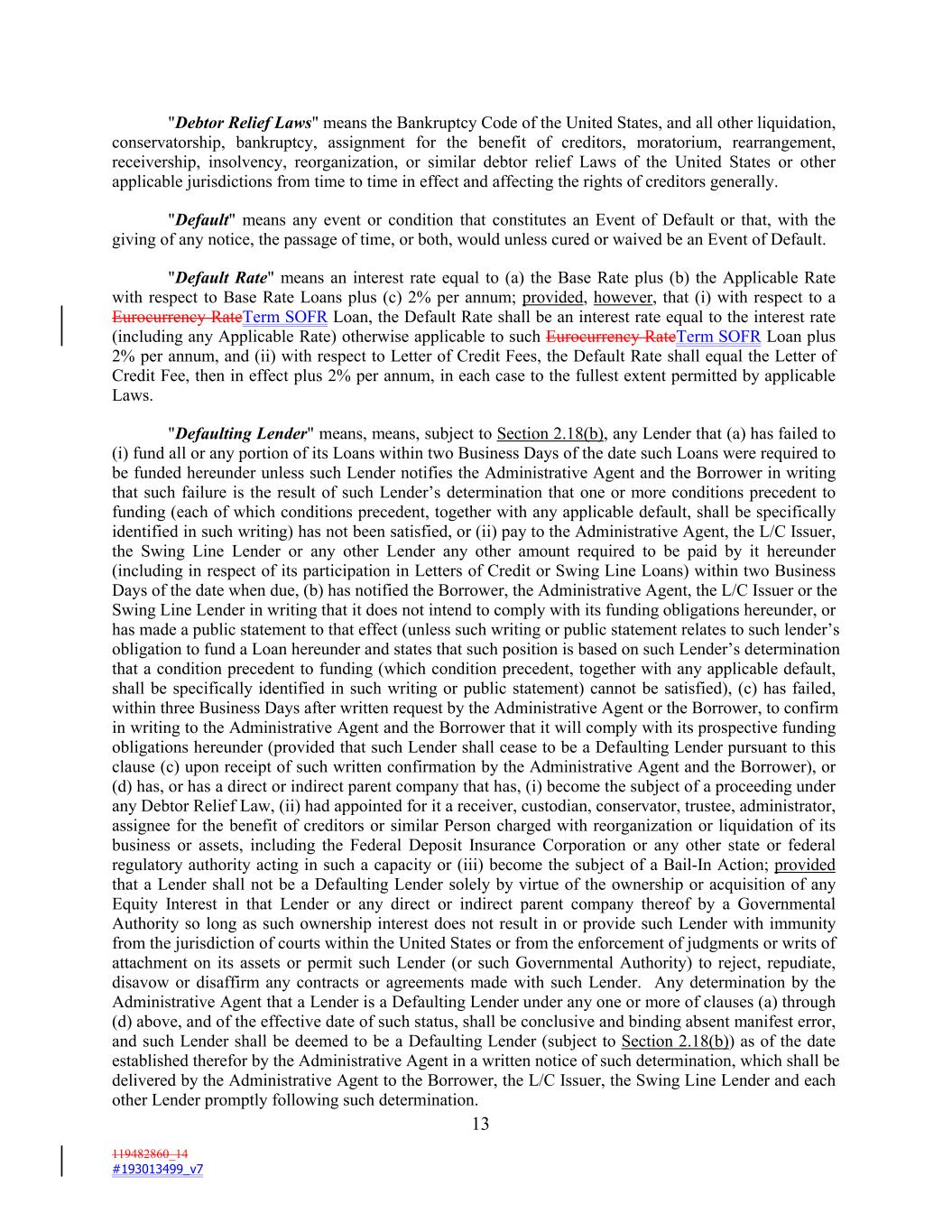 "Debtor Relief Laws" means the Bankruptcy Code of the United States, and all other liquidation, conservatorship, bankruptcy, assignment for the benefit of creditors, moratorium, rearrangement, receivership, insolvency, reorganization, or similar debtor relief Laws of the United States or other applicable jurisdictions from time to time in effect and affecting the rights of creditors generally. "Default" means any event or condition that constitutes an Event of Default or that, with the giving of any notice, the passage of time, or both, would unless cured or waived be an Event of Default. "Default Rate" means an interest rate equal to (a) the Base Rate plus (b) the Applicable Rate with respect to Base Rate Loans plus (c) 2% per annum; provided, however, that (i) with respect to a Eurocurrency RateTerm SOFR Loan, the Default Rate shall be an interest rate equal to the interest rate (including any Applicable Rate) otherwise applicable to such Eurocurrency RateTerm SOFR Loan plus 2% per annum, and (ii) with respect to Letter of Credit Fees, the Default Rate shall equal the Letter of Credit Fee, then in effect plus 2% per annum, in each case to the fullest extent permitted by applicable Laws. "Defaulting Lender" means, means, subject to Section 2.18(b), any Lender that (a) has failed to (i) fund all or any portion of its Loans within two Business Days of the date such Loans were required to be funded hereunder unless such Lender notifies the Administrative Agent and the Borrower in writing that such failure is the result of such Lender’s determination that one or more conditions precedent to funding (each of which conditions precedent, together with any applicable default, shall be specifically identified in such writing) has not been satisfied, or (ii) pay to the Administrative Agent, the L/C Issuer, the Swing Line Lender or any other Lender any other amount required to be paid by it hereunder (including in respect of its participation in Letters of Credit or Swing Line Loans) within two Business Days of the date when due, (b) has notified the Borrower, the Administrative Agent, the L/C Issuer or the Swing Line Lender in writing that it does not intend to comply with its funding obligations hereunder, or has made a public statement to that effect (unless such writing or public statement relates to such lender’s obligation to fund a Loan hereunder and states that such position is based on such Lender’s determination that a condition precedent to funding (which condition precedent, together with any applicable default, shall be specifically identified in such writing or public statement) cannot be satisfied), (c) has failed, within three Business Days after written request by the Administrative Agent or the Borrower, to confirm in writing to the Administrative Agent and the Borrower that it will comply with its prospective funding obligations hereunder (provided that such Lender shall cease to be a Defaulting Lender pursuant to this clause (c) upon receipt of such written confirmation by the Administrative Agent and the Borrower), or (d) has, or has a direct or indirect parent company that has, (i) become the subject of a proceeding under any Debtor Relief Law, (ii) had appointed for it a receiver, custodian, conservator, trustee, administrator, assignee for the benefit of creditors or similar Person charged with reorganization or liquidation of its business or assets, including the Federal Deposit Insurance Corporation or any other state or federal regulatory authority acting in such a capacity or (iii) become the subject of a Bail-In Action; provided that a Lender shall not be a Defaulting Lender solely by virtue of the ownership or acquisition of any Equity Interest in that Lender or any direct or indirect parent company thereof by a Governmental Authority so long as such ownership interest does not result in or provide such Lender with immunity from the jurisdiction of courts within the United States or from the enforcement of judgments or writs of attachment on its assets or permit such Lender (or such Governmental Authority) to reject, repudiate, disavow or disaffirm any contracts or agreements made with such Lender. Any determination by the Administrative Agent that a Lender is a Defaulting Lender under any one or more of clauses (a) through (d) above, and of the effective date of such status, shall be conclusive and binding absent manifest error, and such Lender shall be deemed to be a Defaulting Lender (subject to Section 2.18(b)) as of the date established therefor by the Administrative Agent in a written notice of such determination, which shall be delivered by the Administrative Agent to the Borrower, the L/C Issuer, the Swing Line Lender and each other Lender promptly following such determination. 13 119482860_14 #193013499_v7