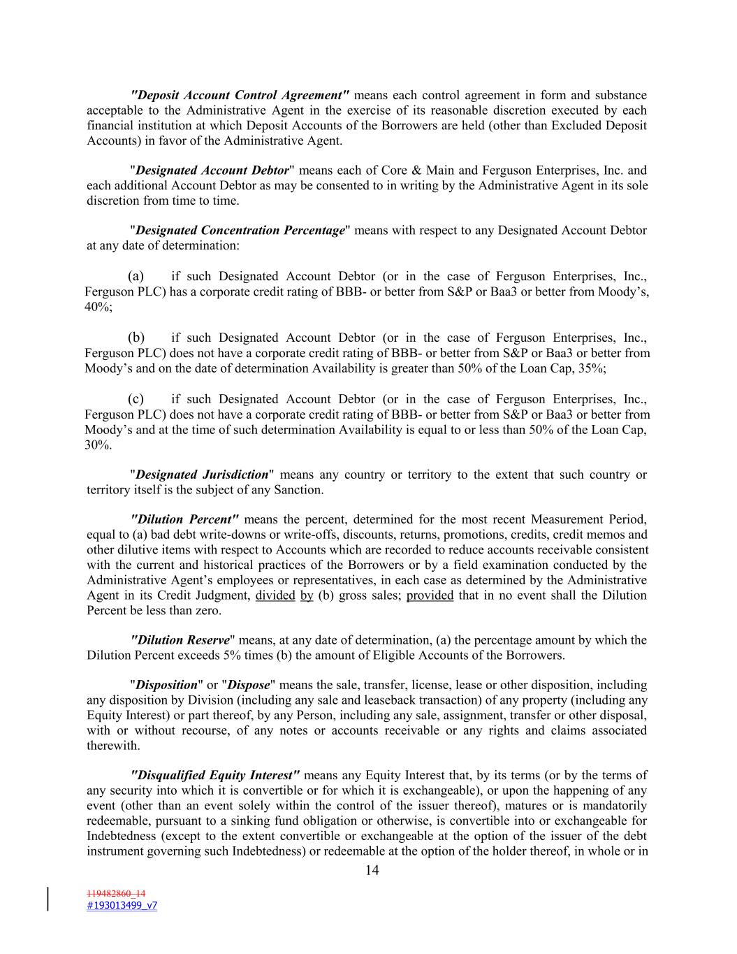 "Deposit Account Control Agreement" means each control agreement in form and substance acceptable to the Administrative Agent in the exercise of its reasonable discretion executed by each financial institution at which Deposit Accounts of the Borrowers are held (other than Excluded Deposit Accounts) in favor of the Administrative Agent. "Designated Account Debtor" means each of Core & Main and Ferguson Enterprises, Inc. and each additional Account Debtor as may be consented to in writing by the Administrative Agent in its sole discretion from time to time. "Designated Concentration Percentage" means with respect to any Designated Account Debtor at any date of determination: (a) if such Designated Account Debtor (or in the case of Ferguson Enterprises, Inc., Ferguson PLC) has a corporate credit rating of BBB- or better from S&P or Baa3 or better from Moody’s, 40%; (b) if such Designated Account Debtor (or in the case of Ferguson Enterprises, Inc., Ferguson PLC) does not have a corporate credit rating of BBB- or better from S&P or Baa3 or better from Moody’s and on the date of determination Availability is greater than 50% of the Loan Cap, 35%; (c) if such Designated Account Debtor (or in the case of Ferguson Enterprises, Inc., Ferguson PLC) does not have a corporate credit rating of BBB- or better from S&P or Baa3 or better from Moody’s and at the time of such determination Availability is equal to or less than 50% of the Loan Cap, 30%. "Designated Jurisdiction" means any country or territory to the extent that such country or territory itself is the subject of any Sanction. "Dilution Percent" means the percent, determined for the most recent Measurement Period, equal to (a) bad debt write-downs or write-offs, discounts, returns, promotions, credits, credit memos and other dilutive items with respect to Accounts which are recorded to reduce accounts receivable consistent with the current and historical practices of the Borrowers or by a field examination conducted by the Administrative Agent’s employees or representatives, in each case as determined by the Administrative Agent in its Credit Judgment, divided by (b) gross sales; provided that in no event shall the Dilution Percent be less than zero. "Dilution Reserve" means, at any date of determination, (a) the percentage amount by which the Dilution Percent exceeds 5% times (b) the amount of Eligible Accounts of the Borrowers. "Disposition" or "Dispose" means the sale, transfer, license, lease or other disposition, including any disposition by Division (including any sale and leaseback transaction) of any property (including any Equity Interest) or part thereof, by any Person, including any sale, assignment, transfer or other disposal, with or without recourse, of any notes or accounts receivable or any rights and claims associated therewith. "Disqualified Equity Interest" means any Equity Interest that, by its terms (or by the terms of any security into which it is convertible or for which it is exchangeable), or upon the happening of any event (other than an event solely within the control of the issuer thereof), matures or is mandatorily redeemable, pursuant to a sinking fund obligation or otherwise, is convertible into or exchangeable for Indebtedness (except to the extent convertible or exchangeable at the option of the issuer of the debt instrument governing such Indebtedness) or redeemable at the option of the holder thereof, in whole or in 14 119482860_14 #193013499_v7