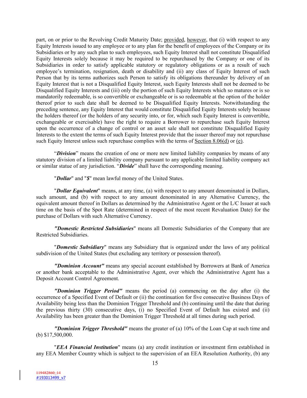 part, on or prior to the Revolving Credit Maturity Date; provided, however, that (i) with respect to any Equity Interests issued to any employee or to any plan for the benefit of employees of the Company or its Subsidiaries or by any such plan to such employees, such Equity Interest shall not constitute Disqualified Equity Interests solely because it may be required to be repurchased by the Company or one of its Subsidiaries in order to satisfy applicable statutory or regulatory obligations or as a result of such employee’s termination, resignation, death or disability and (ii) any class of Equity Interest of such Person that by its terms authorizes such Person to satisfy its obligations thereunder by delivery of an Equity Interest that is not a Disqualified Equity Interest, such Equity Interests shall not be deemed to be Disqualified Equity Interests and (iii) only the portion of such Equity Interests which so matures or is so mandatorily redeemable, is so convertible or exchangeable or is so redeemable at the option of the holder thereof prior to such date shall be deemed to be Disqualified Equity Interests. Notwithstanding the preceding sentence, any Equity Interest that would constitute Disqualified Equity Interests solely because the holders thereof (or the holders of any security into, or for, which such Equity Interest is convertible, exchangeable or exercisable) have the right to require a Borrower to repurchase such Equity Interest upon the occurrence of a change of control or an asset sale shall not constitute Disqualified Equity Interests to the extent the terms of such Equity Interest provide that the issuer thereof may not repurchase such Equity Interest unless such repurchase complies with the terms of Section 8.06(d) or (e). “Division” means the creation of one or more new limited liability companies by means of any statutory division of a limited liability company pursuant to any applicable limited liability company act or similar statue of any jurisdiction. “Divide” shall have the corresponding meaning. "Dollar" and "$" mean lawful money of the United States. "Dollar Equivalent" means, at any time, (a) with respect to any amount denominated in Dollars, such amount, and (b) with respect to any amount denominated in any Alternative Currency, the equivalent amount thereof in Dollars as determined by the Administrative Agent or the L/C Issuer at such time on the basis of the Spot Rate (determined in respect of the most recent Revaluation Date) for the purchase of Dollars with such Alternative Currency. "Domestic Restricted Subsidiaries" means all Domestic Subsidiaries of the Company that are Restricted Subsidiaries. "Domestic Subsidiary" means any Subsidiary that is organized under the laws of any political subdivision of the United States (but excluding any territory or possession thereof). "Dominion Account" means any special account established by Borrowers at Bank of America or another bank acceptable to the Administrative Agent, over which the Administrative Agent has a Deposit Account Control Agreement. "Dominion Trigger Period" means the period (a) commencing on the day after (i) the occurrence of a Specified Event of Default or (ii) the continuation for five consecutive Business Days of Availability being less than the Dominion Trigger Threshold and (b) continuing until the date that during the previous thirty (30) consecutive days, (i) no Specified Event of Default has existed and (ii) Availability has been greater than the Dominion Trigger Threshold at all times during such period. "Dominion Trigger Threshold" means the greater of (a) 10% of the Loan Cap at such time and (b) $17,500,000. "EEA Financial Institution" means (a) any credit institution or investment firm established in any EEA Member Country which is subject to the supervision of an EEA Resolution Authority, (b) any 15 119482860_14 #193013499_v7
