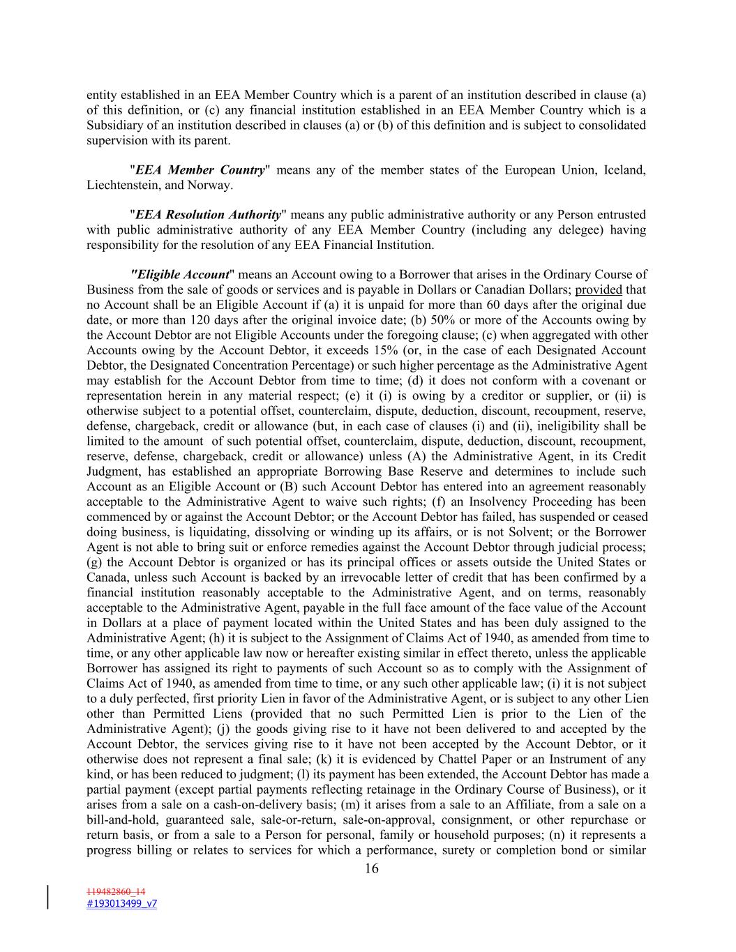 entity established in an EEA Member Country which is a parent of an institution described in clause (a) of this definition, or (c) any financial institution established in an EEA Member Country which is a Subsidiary of an institution described in clauses (a) or (b) of this definition and is subject to consolidated supervision with its parent. "EEA Member Country" means any of the member states of the European Union, Iceland, Liechtenstein, and Norway. "EEA Resolution Authority" means any public administrative authority or any Person entrusted with public administrative authority of any EEA Member Country (including any delegee) having responsibility for the resolution of any EEA Financial Institution. "Eligible Account" means an Account owing to a Borrower that arises in the Ordinary Course of Business from the sale of goods or services and is payable in Dollars or Canadian Dollars; provided that no Account shall be an Eligible Account if (a) it is unpaid for more than 60 days after the original due date, or more than 120 days after the original invoice date; (b) 50% or more of the Accounts owing by the Account Debtor are not Eligible Accounts under the foregoing clause; (c) when aggregated with other Accounts owing by the Account Debtor, it exceeds 15% (or, in the case of each Designated Account Debtor, the Designated Concentration Percentage) or such higher percentage as the Administrative Agent may establish for the Account Debtor from time to time; (d) it does not conform with a covenant or representation herein in any material respect; (e) it (i) is owing by a creditor or supplier, or (ii) is otherwise subject to a potential offset, counterclaim, dispute, deduction, discount, recoupment, reserve, defense, chargeback, credit or allowance (but, in each case of clauses (i) and (ii), ineligibility shall be limited to the amount of such potential offset, counterclaim, dispute, deduction, discount, recoupment, reserve, defense, chargeback, credit or allowance) unless (A) the Administrative Agent, in its Credit Judgment, has established an appropriate Borrowing Base Reserve and determines to include such Account as an Eligible Account or (B) such Account Debtor has entered into an agreement reasonably acceptable to the Administrative Agent to waive such rights; (f) an Insolvency Proceeding has been commenced by or against the Account Debtor; or the Account Debtor has failed, has suspended or ceased doing business, is liquidating, dissolving or winding up its affairs, or is not Solvent; or the Borrower Agent is not able to bring suit or enforce remedies against the Account Debtor through judicial process; (g) the Account Debtor is organized or has its principal offices or assets outside the United States or Canada, unless such Account is backed by an irrevocable letter of credit that has been confirmed by a financial institution reasonably acceptable to the Administrative Agent, and on terms, reasonably acceptable to the Administrative Agent, payable in the full face amount of the face value of the Account in Dollars at a place of payment located within the United States and has been duly assigned to the Administrative Agent; (h) it is subject to the Assignment of Claims Act of 1940, as amended from time to time, or any other applicable law now or hereafter existing similar in effect thereto, unless the applicable Borrower has assigned its right to payments of such Account so as to comply with the Assignment of Claims Act of 1940, as amended from time to time, or any such other applicable law; (i) it is not subject to a duly perfected, first priority Lien in favor of the Administrative Agent, or is subject to any other Lien other than Permitted Liens (provided that no such Permitted Lien is prior to the Lien of the Administrative Agent); (j) the goods giving rise to it have not been delivered to and accepted by the Account Debtor, the services giving rise to it have not been accepted by the Account Debtor, or it otherwise does not represent a final sale; (k) it is evidenced by Chattel Paper or an Instrument of any kind, or has been reduced to judgment; (l) its payment has been extended, the Account Debtor has made a partial payment (except partial payments reflecting retainage in the Ordinary Course of Business), or it arises from a sale on a cash-on-delivery basis; (m) it arises from a sale to an Affiliate, from a sale on a bill-and-hold, guaranteed sale, sale-or-return, sale-on-approval, consignment, or other repurchase or return basis, or from a sale to a Person for personal, family or household purposes; (n) it represents a progress billing or relates to services for which a performance, surety or completion bond or similar 16 119482860_14 #193013499_v7