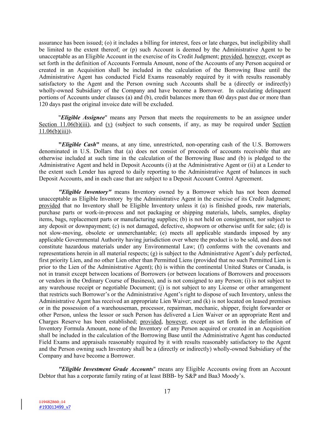 assurance has been issued; (o) it includes a billing for interest, fees or late charges, but ineligibility shall be limited to the extent thereof; or (p) such Account is deemed by the Administrative Agent to be unacceptable as an Eligible Account in the exercise of its Credit Judgment; provided, however, except as set forth in the definition of Accounts Formula Amount, none of the Accounts of any Person acquired or created in an Acquisition shall be included in the calculation of the Borrowing Base until the Administrative Agent has conducted Field Exams reasonably required by it with results reasonably satisfactory to the Agent and the Person owning such Accounts shall be a (directly or indirectly) wholly-owned Subsidiary of the Company and have become a Borrower. In calculating delinquent portions of Accounts under clauses (a) and (b), credit balances more than 60 days past due or more than 120 days past the original invoice date will be excluded. "Eligible Assignee" means any Person that meets the requirements to be an assignee under Section 11.06(b)(iii), and (v) (subject to such consents, if any, as may be required under Section 11.06(b)(iii)). "Eligible Cash" means, at any time, unrestricted, non-operating cash of the U.S. Borrowers denominated in U.S. Dollars that (a) does not consist of proceeds of accounts receivable that are otherwise included at such time in the calculation of the Borrowing Base and (b) is pledged to the Administrative Agent and held in Deposit Accounts (i) at the Administrative Agent or (ii) at a Lender to the extent such Lender has agreed to daily reporting to the Administrative Agent of balances in such Deposit Accounts, and in each case that are subject to a Deposit Account Control Agreement. "Eligible Inventory" means Inventory owned by a Borrower which has not been deemed unacceptable as Eligible Inventory by the Administrative Agent in the exercise of its Credit Judgment; provided that no Inventory shall be Eligible Inventory unless it (a) is finished goods, raw materials, purchase parts or work-in-process and not packaging or shipping materials, labels, samples, display items, bags, replacement parts or manufacturing supplies; (b) is not held on consignment, nor subject to any deposit or downpayment; (c) is not damaged, defective, shopworn or otherwise unfit for sale; (d) is not slow-moving, obsolete or unmerchantable; (e) meets all applicable standards imposed by any applicable Governmental Authority having jurisdiction over where the product is to be sold, and does not constitute hazardous materials under any Environmental Law; (f) conforms with the covenants and representations herein in all material respects; (g) is subject to the Administrative Agent’s duly perfected, first priority Lien, and no other Lien other than Permitted Liens (provided that no such Permitted Lien is prior to the Lien of the Administrative Agent); (h) is within the continental United States or Canada, is not in transit except between locations of Borrowers (or between locations of Borrowers and processors or vendors in the Ordinary Course of Business), and is not consigned to any Person; (i) is not subject to any warehouse receipt or negotiable Document; (j) is not subject to any License or other arrangement that restricts such Borrower’s or the Administrative Agent’s right to dispose of such Inventory, unless the Administrative Agent has received an appropriate Lien Waiver; and (k) is not located on leased premises or in the possession of a warehouseman, processor, repairman, mechanic, shipper, freight forwarder or other Person, unless the lessor or such Person has delivered a Lien Waiver or an appropriate Rent and Charges Reserve has been established; provided, however, except as set forth in the definition of Inventory Formula Amount, none of the Inventory of any Person acquired or created in an Acquisition shall be included in the calculation of the Borrowing Base until the Administrative Agent has conducted Field Exams and appraisals reasonably required by it with results reasonably satisfactory to the Agent and the Person owning such Inventory shall be a (directly or indirectly) wholly-owned Subsidiary of the Company and have become a Borrower. "Eligible Investment Grade Accounts" means any Eligible Accounts owing from an Account Debtor that has a corporate family rating of at least BBB- by S&P and Baa3 Moody’s. 17 119482860_14 #193013499_v7
