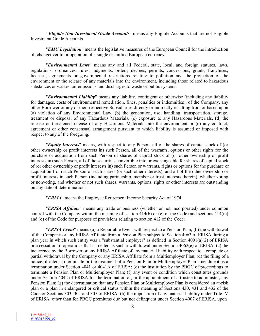 "Eligible Non-Investment Grade Accounts" means any Eligible Accounts that are not Eligible Investment Grade Accounts. "EMU Legislation" means the legislative measures of the European Council for the introduction of, changeover to or operation of a single or unified European currency. "Environmental Laws" means any and all Federal, state, local, and foreign statutes, laws, regulations, ordinances, rules, judgments, orders, decrees, permits, concessions, grants, franchises, licenses, agreements or governmental restrictions relating to pollution and the protection of the environment or the release of any materials into the environment, including those related to hazardous substances or wastes, air emissions and discharges to waste or public systems. "Environmental Liability" means any liability, contingent or otherwise (including any liability for damages, costs of environmental remediation, fines, penalties or indemnities), of the Company, any other Borrower or any of their respective Subsidiaries directly or indirectly resulting from or based upon (a) violation of any Environmental Law, (b) the generation, use, handling, transportation, storage, treatment or disposal of any Hazardous Materials, (c) exposure to any Hazardous Materials, (d) the release or threatened release of any Hazardous Materials into the environment or (e) any contract, agreement or other consensual arrangement pursuant to which liability is assumed or imposed with respect to any of the foregoing. "Equity Interests" means, with respect to any Person, all of the shares of capital stock of (or other ownership or profit interests in) such Person, all of the warrants, options or other rights for the purchase or acquisition from such Person of shares of capital stock of (or other ownership or profit interests in) such Person, all of the securities convertible into or exchangeable for shares of capital stock of (or other ownership or profit interests in) such Person or warrants, rights or options for the purchase or acquisition from such Person of such shares (or such other interests), and all of the other ownership or profit interests in such Person (including partnership, member or trust interests therein), whether voting or nonvoting, and whether or not such shares, warrants, options, rights or other interests are outstanding on any date of determination. "ERISA" means the Employee Retirement Income Security Act of 1974. "ERISA Affiliate" means any trade or business (whether or not incorporated) under common control with the Company within the meaning of section 414(b) or (c) of the Code (and sections 414(m) and (o) of the Code for purposes of provisions relating to section 412 of the Code). "ERISA Event" means (a) a Reportable Event with respect to a Pension Plan; (b) the withdrawal of the Company or any ERISA Affiliate from a Pension Plan subject to Section 4063 of ERISA during a plan year in which such entity was a "substantial employer" as defined in Section 4001(a)(2) of ERISA or a cessation of operations that is treated as such a withdrawal under Section 4062(e) of ERISA; (c) the incurrence by the Borrower or any ERISA Affiliate of any material liability with respect to a complete or partial withdrawal by the Company or any ERISA Affiliate from a Multiemployer Plan; (d) the filing of a notice of intent to terminate or the treatment of a Pension Plan or Multiemployer Plan amendment as a termination under Section 4041 or 4041A of ERISA; (e) the institution by the PBGC of proceedings to terminate a Pension Plan or Multiemployer Plan; (f) any event or condition which constitutes grounds under Section 4042 of ERISA for the termination of, or the appointment of a trustee to administer, any Pension Plan; (g) the determination that any Pension Plan or Multiemployer Plan is considered an at-risk plan or a plan in endangered or critical status within the meaning of Sections 430, 431 and 432 of the Code or Sections 303, 304 and 305 of ERISA; (h) the imposition of any material liability under Title IV of ERISA, other than for PBGC premiums due but not delinquent under Section 4007 of ERISA, upon 18 119482860_14 #193013499_v7