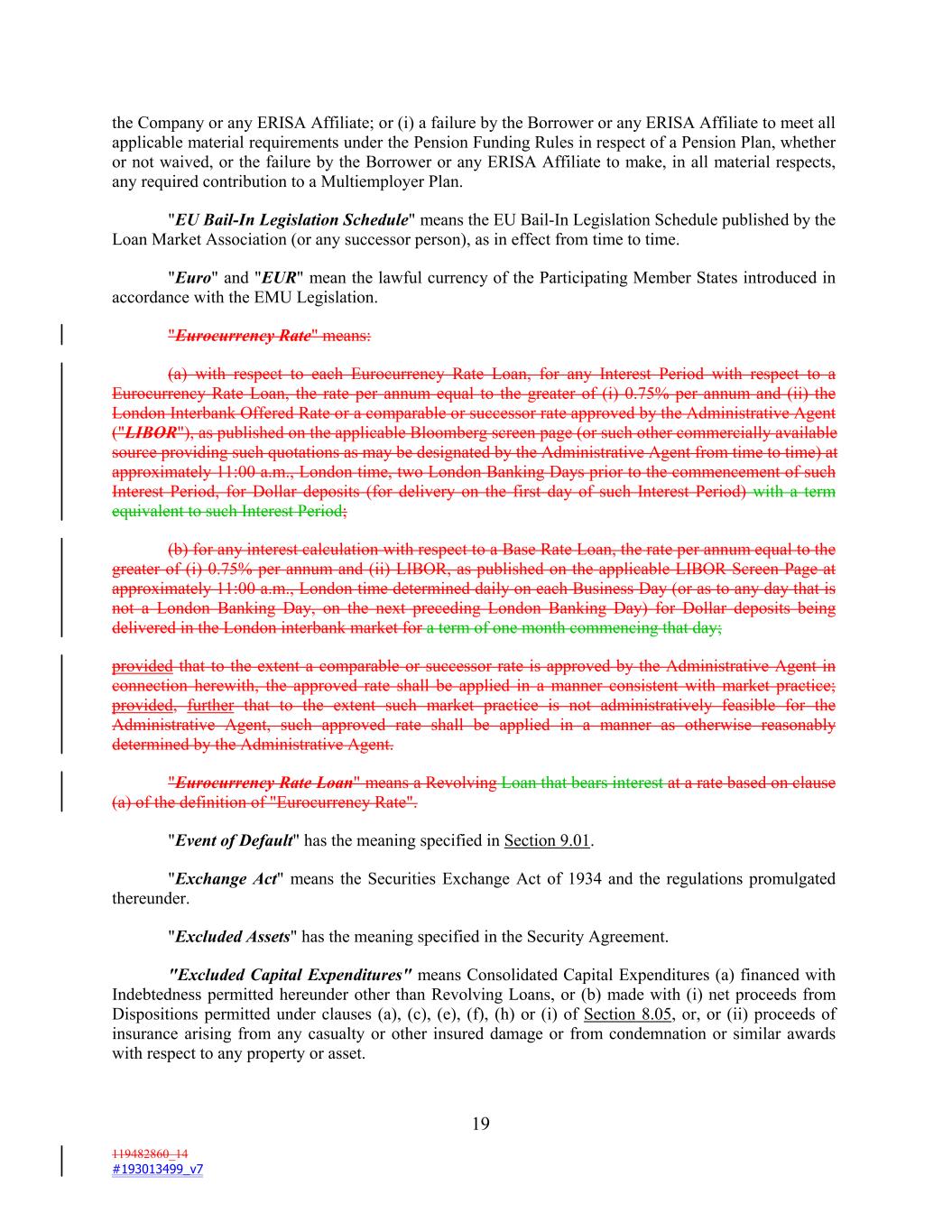 the Company or any ERISA Affiliate; or (i) a failure by the Borrower or any ERISA Affiliate to meet all applicable material requirements under the Pension Funding Rules in respect of a Pension Plan, whether or not waived, or the failure by the Borrower or any ERISA Affiliate to make, in all material respects, any required contribution to a Multiemployer Plan. "EU Bail-In Legislation Schedule" means the EU Bail-In Legislation Schedule published by the Loan Market Association (or any successor person), as in effect from time to time. "Euro" and "EUR" mean the lawful currency of the Participating Member States introduced in accordance with the EMU Legislation. "Eurocurrency Rate" means: (a) with respect to each Eurocurrency Rate Loan, for any Interest Period with respect to a Eurocurrency Rate Loan, the rate per annum equal to the greater of (i) 0.75% per annum and (ii) the London Interbank Offered Rate or a comparable or successor rate approved by the Administrative Agent ("LIBOR"), as published on the applicable Bloomberg screen page (or such other commercially available source providing such quotations as may be designated by the Administrative Agent from time to time) at approximately 11:00 a.m., London time, two London Banking Days prior to the commencement of such Interest Period, for Dollar deposits (for delivery on the first day of such Interest Period) with a term equivalent to such Interest Period; (b) for any interest calculation with respect to a Base Rate Loan, the rate per annum equal to the greater of (i) 0.75% per annum and (ii) LIBOR, as published on the applicable LIBOR Screen Page at approximately 11:00 a.m., London time determined daily on each Business Day (or as to any day that is not a London Banking Day, on the next preceding London Banking Day) for Dollar deposits being delivered in the London interbank market for a term of one month commencing that day; provided that to the extent a comparable or successor rate is approved by the Administrative Agent in connection herewith, the approved rate shall be applied in a manner consistent with market practice; provided, further that to the extent such market practice is not administratively feasible for the Administrative Agent, such approved rate shall be applied in a manner as otherwise reasonably determined by the Administrative Agent. "Eurocurrency Rate Loan" means a Revolving Loan that bears interest at a rate based on clause (a) of the definition of "Eurocurrency Rate". "Event of Default" has the meaning specified in Section 9.01. "Exchange Act" means the Securities Exchange Act of 1934 and the regulations promulgated thereunder. "Excluded Assets" has the meaning specified in the Security Agreement. "Excluded Capital Expenditures" means Consolidated Capital Expenditures (a) financed with Indebtedness permitted hereunder other than Revolving Loans, or (b) made with (i) net proceeds from Dispositions permitted under clauses (a), (c), (e), (f), (h) or (i) of Section 8.05, or, or (ii) proceeds of insurance arising from any casualty or other insured damage or from condemnation or similar awards with respect to any property or asset. 19 119482860_14 #193013499_v7