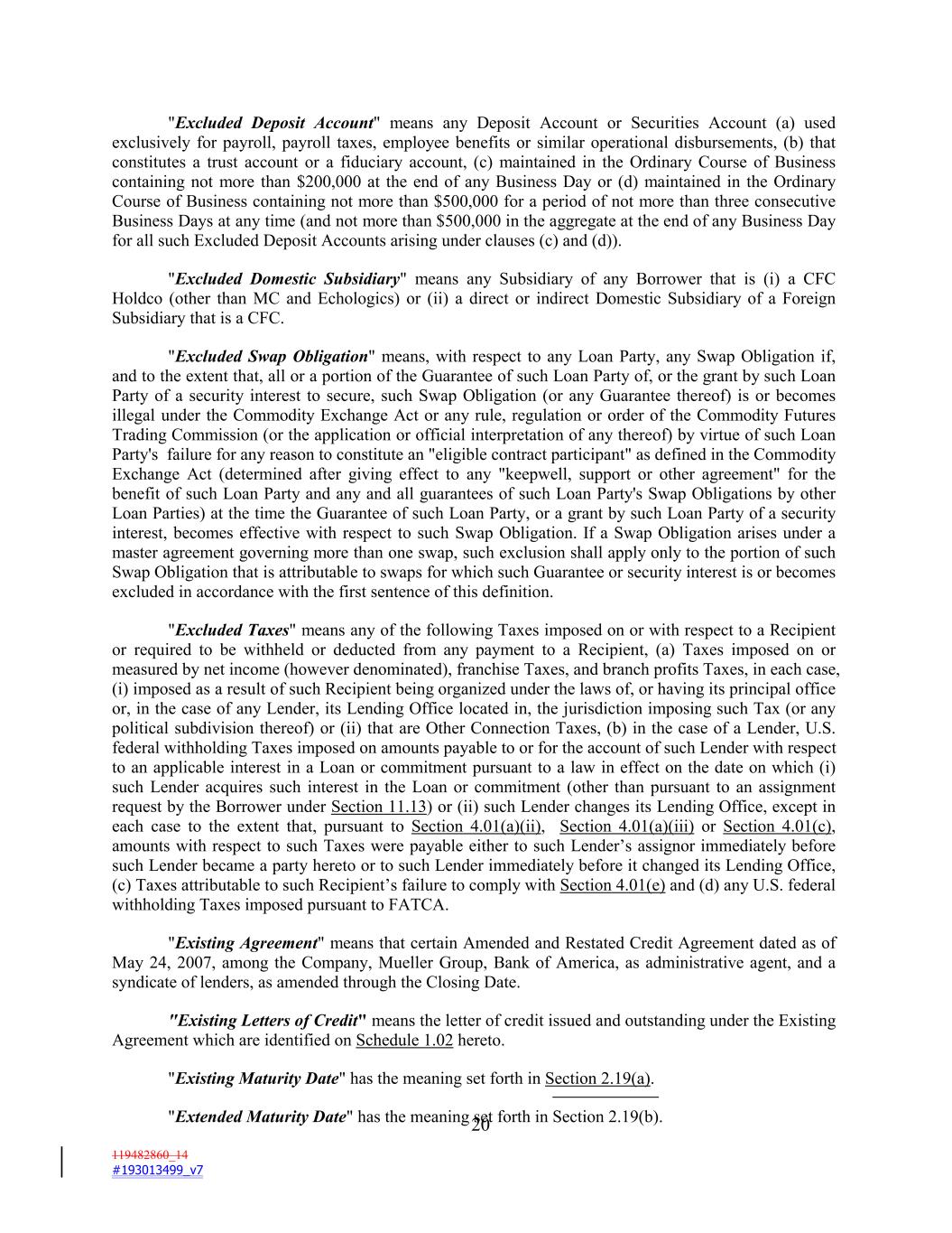 "Excluded Deposit Account" means any Deposit Account or Securities Account (a) used exclusively for payroll, payroll taxes, employee benefits or similar operational disbursements, (b) that constitutes a trust account or a fiduciary account, (c) maintained in the Ordinary Course of Business containing not more than $200,000 at the end of any Business Day or (d) maintained in the Ordinary Course of Business containing not more than $500,000 for a period of not more than three consecutive Business Days at any time (and not more than $500,000 in the aggregate at the end of any Business Day for all such Excluded Deposit Accounts arising under clauses (c) and (d)). "Excluded Domestic Subsidiary" means any Subsidiary of any Borrower that is (i) a CFC Holdco (other than MC and Echologics) or (ii) a direct or indirect Domestic Subsidiary of a Foreign Subsidiary that is a CFC. "Excluded Swap Obligation" means, with respect to any Loan Party, any Swap Obligation if, and to the extent that, all or a portion of the Guarantee of such Loan Party of, or the grant by such Loan Party of a security interest to secure, such Swap Obligation (or any Guarantee thereof) is or becomes illegal under the Commodity Exchange Act or any rule, regulation or order of the Commodity Futures Trading Commission (or the application or official interpretation of any thereof) by virtue of such Loan Party's failure for any reason to constitute an "eligible contract participant" as defined in the Commodity Exchange Act (determined after giving effect to any "keepwell, support or other agreement" for the benefit of such Loan Party and any and all guarantees of such Loan Party's Swap Obligations by other Loan Parties) at the time the Guarantee of such Loan Party, or a grant by such Loan Party of a security interest, becomes effective with respect to such Swap Obligation. If a Swap Obligation arises under a master agreement governing more than one swap, such exclusion shall apply only to the portion of such Swap Obligation that is attributable to swaps for which such Guarantee or security interest is or becomes excluded in accordance with the first sentence of this definition. "Excluded Taxes" means any of the following Taxes imposed on or with respect to a Recipient or required to be withheld or deducted from any payment to a Recipient, (a) Taxes imposed on or measured by net income (however denominated), franchise Taxes, and branch profits Taxes, in each case, (i) imposed as a result of such Recipient being organized under the laws of, or having its principal office or, in the case of any Lender, its Lending Office located in, the jurisdiction imposing such Tax (or any political subdivision thereof) or (ii) that are Other Connection Taxes, (b) in the case of a Lender, U.S. federal withholding Taxes imposed on amounts payable to or for the account of such Lender with respect to an applicable interest in a Loan or commitment pursuant to a law in effect on the date on which (i) such Lender acquires such interest in the Loan or commitment (other than pursuant to an assignment request by the Borrower under Section 11.13) or (ii) such Lender changes its Lending Office, except in each case to the extent that, pursuant to Section 4.01(a)(ii), Section 4.01(a)(iii) or Section 4.01(c), amounts with respect to such Taxes were payable either to such Lender’s assignor immediately before such Lender became a party hereto or to such Lender immediately before it changed its Lending Office, (c) Taxes attributable to such Recipient’s failure to comply with Section 4.01(e) and (d) any U.S. federal withholding Taxes imposed pursuant to FATCA. "Existing Agreement" means that certain Amended and Restated Credit Agreement dated as of May 24, 2007, among the Company, Mueller Group, Bank of America, as administrative agent, and a syndicate of lenders, as amended through the Closing Date. "Existing Letters of Credit" means the letter of credit issued and outstanding under the Existing Agreement which are identified on Schedule 1.02 hereto. "Existing Maturity Date" has the meaning set forth in Section 2.19(a). "Extended Maturity Date" has the meaning set forth in Section 2.19(b).20 119482860_14 #193013499_v7