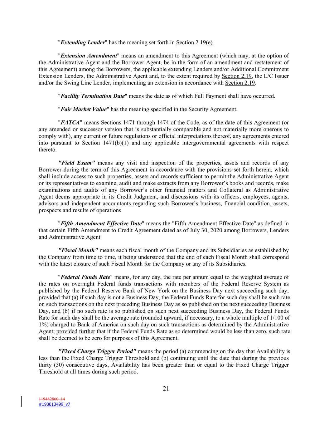 "Extending Lender" has the meaning set forth in Section 2.19(e). "Extension Amendment" means an amendment to this Agreement (which may, at the option of the Administrative Agent and the Borrower Agent, be in the form of an amendment and restatement of this Agreement) among the Borrowers, the applicable extending Lenders and/or Additional Commitment Extension Lenders, the Administrative Agent and, to the extent required by Section 2.19, the L/C Issuer and/or the Swing Line Lender, implementing an extension in accordance with Section 2.19. "Facility Termination Date" means the date as of which Full Payment shall have occurred. "Fair Market Value" has the meaning specified in the Security Agreement. "FATCA" means Sections 1471 through 1474 of the Code, as of the date of this Agreement (or any amended or successor version that is substantially comparable and not materially more onerous to comply with), any current or future regulations or official interpretations thereof, any agreements entered into pursuant to Section 1471(b)(1) and any applicable intergovernmental agreements with respect thereto. "Field Exam" means any visit and inspection of the properties, assets and records of any Borrower during the term of this Agreement in accordance with the provisions set forth herein, which shall include access to such properties, assets and records sufficient to permit the Administrative Agent or its representatives to examine, audit and make extracts from any Borrower’s books and records, make examinations and audits of any Borrower’s other financial matters and Collateral as Administrative Agent deems appropriate in its Credit Judgment, and discussions with its officers, employees, agents, advisors and independent accountants regarding such Borrower’s business, financial condition, assets, prospects and results of operations. "Fifth Amendment Effective Date" means the "Fifth Amendment Effective Date" as defined in that certain Fifth Amendment to Credit Agreement dated as of July 30, 2020 among Borrowers, Lenders and Administrative Agent. "Fiscal Month" means each fiscal month of the Company and its Subsidiaries as established by the Company from time to time, it being understood that the end of each Fiscal Month shall correspond with the latest closure of such Fiscal Month for the Company or any of its Subsidiaries. "Federal Funds Rate" means, for any day, the rate per annum equal to the weighted average of the rates on overnight Federal funds transactions with members of the Federal Reserve System as published by the Federal Reserve Bank of New York on the Business Day next succeeding such day; provided that (a) if such day is not a Business Day, the Federal Funds Rate for such day shall be such rate on such transactions on the next preceding Business Day as so published on the next succeeding Business Day, and (b) if no such rate is so published on such next succeeding Business Day, the Federal Funds Rate for such day shall be the average rate (rounded upward, if necessary, to a whole multiple of 1/100 of 1%) charged to Bank of America on such day on such transactions as determined by the Administrative Agent; provided further that if the Federal Funds Rate as so determined would be less than zero, such rate shall be deemed to be zero for purposes of this Agreement. "Fixed Charge Trigger Period" means the period (a) commencing on the day that Availability is less than the Fixed Charge Trigger Threshold and (b) continuing until the date that during the previous thirty (30) consecutive days, Availability has been greater than or equal to the Fixed Charge Trigger Threshold at all times during such period. 21 119482860_14 #193013499_v7