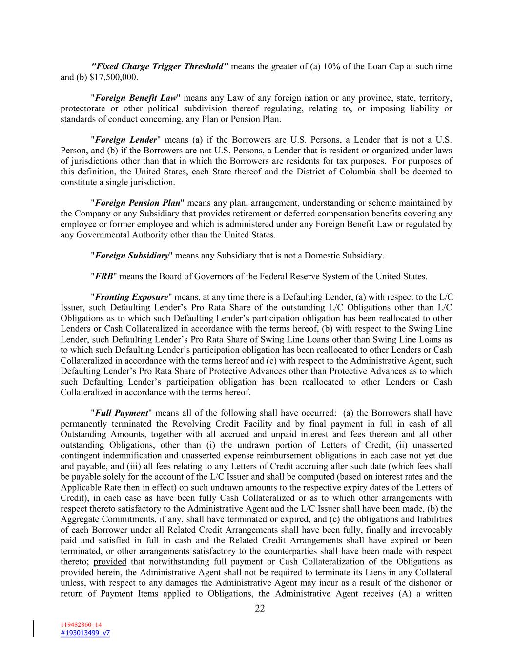"Fixed Charge Trigger Threshold" means the greater of (a) 10% of the Loan Cap at such time and (b) $17,500,000. "Foreign Benefit Law" means any Law of any foreign nation or any province, state, territory, protectorate or other political subdivision thereof regulating, relating to, or imposing liability or standards of conduct concerning, any Plan or Pension Plan. "Foreign Lender" means (a) if the Borrowers are U.S. Persons, a Lender that is not a U.S. Person, and (b) if the Borrowers are not U.S. Persons, a Lender that is resident or organized under laws of jurisdictions other than that in which the Borrowers are residents for tax purposes. For purposes of this definition, the United States, each State thereof and the District of Columbia shall be deemed to constitute a single jurisdiction. "Foreign Pension Plan" means any plan, arrangement, understanding or scheme maintained by the Company or any Subsidiary that provides retirement or deferred compensation benefits covering any employee or former employee and which is administered under any Foreign Benefit Law or regulated by any Governmental Authority other than the United States. "Foreign Subsidiary" means any Subsidiary that is not a Domestic Subsidiary. "FRB" means the Board of Governors of the Federal Reserve System of the United States. "Fronting Exposure" means, at any time there is a Defaulting Lender, (a) with respect to the L/C Issuer, such Defaulting Lender’s Pro Rata Share of the outstanding L/C Obligations other than L/C Obligations as to which such Defaulting Lender’s participation obligation has been reallocated to other Lenders or Cash Collateralized in accordance with the terms hereof, (b) with respect to the Swing Line Lender, such Defaulting Lender’s Pro Rata Share of Swing Line Loans other than Swing Line Loans as to which such Defaulting Lender’s participation obligation has been reallocated to other Lenders or Cash Collateralized in accordance with the terms hereof and (c) with respect to the Administrative Agent, such Defaulting Lender’s Pro Rata Share of Protective Advances other than Protective Advances as to which such Defaulting Lender’s participation obligation has been reallocated to other Lenders or Cash Collateralized in accordance with the terms hereof. "Full Payment" means all of the following shall have occurred: (a) the Borrowers shall have permanently terminated the Revolving Credit Facility and by final payment in full in cash of all Outstanding Amounts, together with all accrued and unpaid interest and fees thereon and all other outstanding Obligations, other than (i) the undrawn portion of Letters of Credit, (ii) unasserted contingent indemnification and unasserted expense reimbursement obligations in each case not yet due and payable, and (iii) all fees relating to any Letters of Credit accruing after such date (which fees shall be payable solely for the account of the L/C Issuer and shall be computed (based on interest rates and the Applicable Rate then in effect) on such undrawn amounts to the respective expiry dates of the Letters of Credit), in each case as have been fully Cash Collateralized or as to which other arrangements with respect thereto satisfactory to the Administrative Agent and the L/C Issuer shall have been made, (b) the Aggregate Commitments, if any, shall have terminated or expired, and (c) the obligations and liabilities of each Borrower under all Related Credit Arrangements shall have been fully, finally and irrevocably paid and satisfied in full in cash and the Related Credit Arrangements shall have expired or been terminated, or other arrangements satisfactory to the counterparties shall have been made with respect thereto; provided that notwithstanding full payment or Cash Collateralization of the Obligations as provided herein, the Administrative Agent shall not be required to terminate its Liens in any Collateral unless, with respect to any damages the Administrative Agent may incur as a result of the dishonor or return of Payment Items applied to Obligations, the Administrative Agent receives (A) a written 22 119482860_14 #193013499_v7