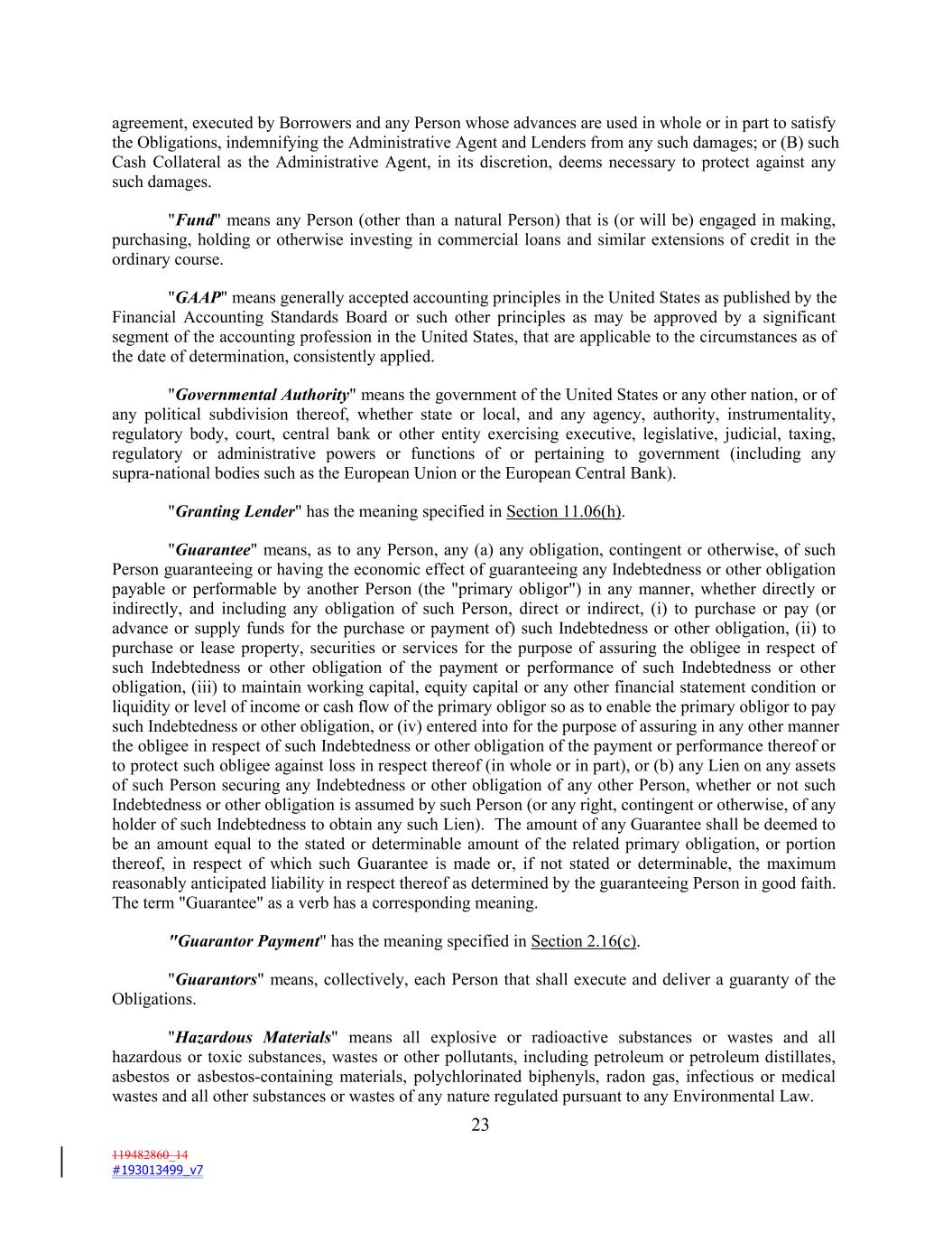 agreement, executed by Borrowers and any Person whose advances are used in whole or in part to satisfy the Obligations, indemnifying the Administrative Agent and Lenders from any such damages; or (B) such Cash Collateral as the Administrative Agent, in its discretion, deems necessary to protect against any such damages. "Fund" means any Person (other than a natural Person) that is (or will be) engaged in making, purchasing, holding or otherwise investing in commercial loans and similar extensions of credit in the ordinary course. "GAAP" means generally accepted accounting principles in the United States as published by the Financial Accounting Standards Board or such other principles as may be approved by a significant segment of the accounting profession in the United States, that are applicable to the circumstances as of the date of determination, consistently applied. "Governmental Authority" means the government of the United States or any other nation, or of any political subdivision thereof, whether state or local, and any agency, authority, instrumentality, regulatory body, court, central bank or other entity exercising executive, legislative, judicial, taxing, regulatory or administrative powers or functions of or pertaining to government (including any supra-national bodies such as the European Union or the European Central Bank). "Granting Lender" has the meaning specified in Section 11.06(h). "Guarantee" means, as to any Person, any (a) any obligation, contingent or otherwise, of such Person guaranteeing or having the economic effect of guaranteeing any Indebtedness or other obligation payable or performable by another Person (the "primary obligor") in any manner, whether directly or indirectly, and including any obligation of such Person, direct or indirect, (i) to purchase or pay (or advance or supply funds for the purchase or payment of) such Indebtedness or other obligation, (ii) to purchase or lease property, securities or services for the purpose of assuring the obligee in respect of such Indebtedness or other obligation of the payment or performance of such Indebtedness or other obligation, (iii) to maintain working capital, equity capital or any other financial statement condition or liquidity or level of income or cash flow of the primary obligor so as to enable the primary obligor to pay such Indebtedness or other obligation, or (iv) entered into for the purpose of assuring in any other manner the obligee in respect of such Indebtedness or other obligation of the payment or performance thereof or to protect such obligee against loss in respect thereof (in whole or in part), or (b) any Lien on any assets of such Person securing any Indebtedness or other obligation of any other Person, whether or not such Indebtedness or other obligation is assumed by such Person (or any right, contingent or otherwise, of any holder of such Indebtedness to obtain any such Lien). The amount of any Guarantee shall be deemed to be an amount equal to the stated or determinable amount of the related primary obligation, or portion thereof, in respect of which such Guarantee is made or, if not stated or determinable, the maximum reasonably anticipated liability in respect thereof as determined by the guaranteeing Person in good faith. The term "Guarantee" as a verb has a corresponding meaning. "Guarantor Payment" has the meaning specified in Section 2.16(c). "Guarantors" means, collectively, each Person that shall execute and deliver a guaranty of the Obligations. "Hazardous Materials" means all explosive or radioactive substances or wastes and all hazardous or toxic substances, wastes or other pollutants, including petroleum or petroleum distillates, asbestos or asbestos-containing materials, polychlorinated biphenyls, radon gas, infectious or medical wastes and all other substances or wastes of any nature regulated pursuant to any Environmental Law. 23 119482860_14 #193013499_v7