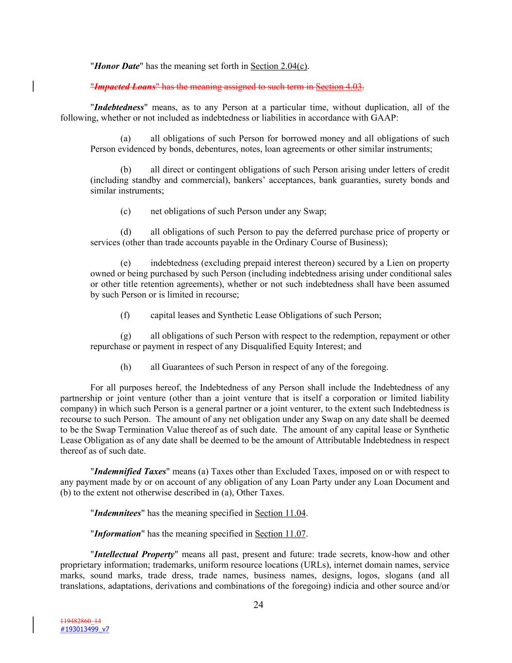 "Honor Date" has the meaning set forth in Section 2.04(c). "Impacted Loans" has the meaning assigned to such term in Section 4.03. "Indebtedness" means, as to any Person at a particular time, without duplication, all of the following, whether or not included as indebtedness or liabilities in accordance with GAAP: (a) all obligations of such Person for borrowed money and all obligations of such Person evidenced by bonds, debentures, notes, loan agreements or other similar instruments; (b) all direct or contingent obligations of such Person arising under letters of credit (including standby and commercial), bankers’ acceptances, bank guaranties, surety bonds and similar instruments; (c) net obligations of such Person under any Swap; (d) all obligations of such Person to pay the deferred purchase price of property or services (other than trade accounts payable in the Ordinary Course of Business); (e) indebtedness (excluding prepaid interest thereon) secured by a Lien on property owned or being purchased by such Person (including indebtedness arising under conditional sales or other title retention agreements), whether or not such indebtedness shall have been assumed by such Person or is limited in recourse; (f) capital leases and Synthetic Lease Obligations of such Person; (g) all obligations of such Person with respect to the redemption, repayment or other repurchase or payment in respect of any Disqualified Equity Interest; and (h) all Guarantees of such Person in respect of any of the foregoing. For all purposes hereof, the Indebtedness of any Person shall include the Indebtedness of any partnership or joint venture (other than a joint venture that is itself a corporation or limited liability company) in which such Person is a general partner or a joint venturer, to the extent such Indebtedness is recourse to such Person. The amount of any net obligation under any Swap on any date shall be deemed to be the Swap Termination Value thereof as of such date. The amount of any capital lease or Synthetic Lease Obligation as of any date shall be deemed to be the amount of Attributable Indebtedness in respect thereof as of such date. "Indemnified Taxes" means (a) Taxes other than Excluded Taxes, imposed on or with respect to any payment made by or on account of any obligation of any Loan Party under any Loan Document and (b) to the extent not otherwise described in (a), Other Taxes. "Indemnitees" has the meaning specified in Section 11.04. "Information" has the meaning specified in Section 11.07. "Intellectual Property" means all past, present and future: trade secrets, know-how and other proprietary information; trademarks, uniform resource locations (URLs), internet domain names, service marks, sound marks, trade dress, trade names, business names, designs, logos, slogans (and all translations, adaptations, derivations and combinations of the foregoing) indicia and other source and/or 24 119482860_14 #193013499_v7