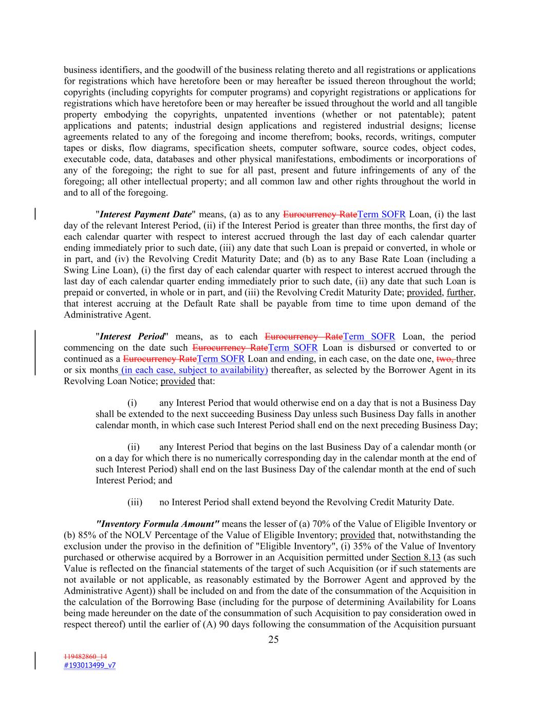 business identifiers, and the goodwill of the business relating thereto and all registrations or applications for registrations which have heretofore been or may hereafter be issued thereon throughout the world; copyrights (including copyrights for computer programs) and copyright registrations or applications for registrations which have heretofore been or may hereafter be issued throughout the world and all tangible property embodying the copyrights, unpatented inventions (whether or not patentable); patent applications and patents; industrial design applications and registered industrial designs; license agreements related to any of the foregoing and income therefrom; books, records, writings, computer tapes or disks, flow diagrams, specification sheets, computer software, source codes, object codes, executable code, data, databases and other physical manifestations, embodiments or incorporations of any of the foregoing; the right to sue for all past, present and future infringements of any of the foregoing; all other intellectual property; and all common law and other rights throughout the world in and to all of the foregoing. "Interest Payment Date" means, (a) as to any Eurocurrency RateTerm SOFR Loan, (i) the last day of the relevant Interest Period, (ii) if the Interest Period is greater than three months, the first day of each calendar quarter with respect to interest accrued through the last day of each calendar quarter ending immediately prior to such date, (iii) any date that such Loan is prepaid or converted, in whole or in part, and (iv) the Revolving Credit Maturity Date; and (b) as to any Base Rate Loan (including a Swing Line Loan), (i) the first day of each calendar quarter with respect to interest accrued through the last day of each calendar quarter ending immediately prior to such date, (ii) any date that such Loan is prepaid or converted, in whole or in part, and (iii) the Revolving Credit Maturity Date; provided, further, that interest accruing at the Default Rate shall be payable from time to time upon demand of the Administrative Agent. "Interest Period" means, as to each Eurocurrency RateTerm SOFR Loan, the period commencing on the date such Eurocurrency RateTerm SOFR Loan is disbursed or converted to or continued as a Eurocurrency RateTerm SOFR Loan and ending, in each case, on the date one, two, three or six months (in each case, subject to availability) thereafter, as selected by the Borrower Agent in its Revolving Loan Notice; provided that: (i) any Interest Period that would otherwise end on a day that is not a Business Day shall be extended to the next succeeding Business Day unless such Business Day falls in another calendar month, in which case such Interest Period shall end on the next preceding Business Day; (ii) any Interest Period that begins on the last Business Day of a calendar month (or on a day for which there is no numerically corresponding day in the calendar month at the end of such Interest Period) shall end on the last Business Day of the calendar month at the end of such Interest Period; and (iii) no Interest Period shall extend beyond the Revolving Credit Maturity Date. "Inventory Formula Amount" means the lesser of (a) 70% of the Value of Eligible Inventory or (b) 85% of the NOLV Percentage of the Value of Eligible Inventory; provided that, notwithstanding the exclusion under the proviso in the definition of "Eligible Inventory", (i) 35% of the Value of Inventory purchased or otherwise acquired by a Borrower in an Acquisition permitted under Section 8.13 (as such Value is reflected on the financial statements of the target of such Acquisition (or if such statements are not available or not applicable, as reasonably estimated by the Borrower Agent and approved by the Administrative Agent)) shall be included on and from the date of the consummation of the Acquisition in the calculation of the Borrowing Base (including for the purpose of determining Availability for Loans being made hereunder on the date of the consummation of such Acquisition to pay consideration owed in respect thereof) until the earlier of (A) 90 days following the consummation of the Acquisition pursuant 25 119482860_14 #193013499_v7