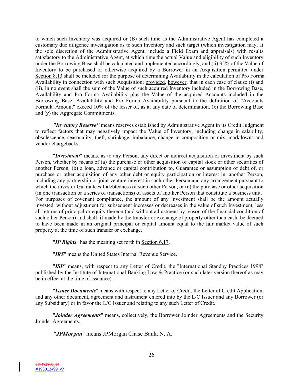 to which such Inventory was acquired or (B) such time as the Administrative Agent has completed a customary due diligence investigation as to such Inventory and such target (which investigation may, at the sole discretion of the Administrative Agent, include a Field Exam and appraisals) with results satisfactory to the Administrative Agent, at which time the actual Value and eligibility of such Inventory under the Borrowing Base shall be calculated and implemented accordingly, and (ii) 35% of the Value of Inventory to be purchased or otherwise acquired by a Borrower in an Acquisition permitted under Section 8.13 shall be included for the purpose of determining Availability in the calculation of Pro Forma Availability in connection with such Acquisition; provided, however, that in each case of clause (i) and (ii), in no event shall the sum of the Value of such acquired Inventory included in the Borrowing Base, Availability and Pro Forma Availability plus the Value of the acquired Accounts included in the Borrowing Base, Availability and Pro Forma Availability pursuant to the definition of "Accounts Formula Amount" exceed 10% of the lesser of, as at any date of determination, (x) the Borrowing Base and (y) the Aggregate Commitments. "Inventory Reserve" means reserves established by Administrative Agent in its Credit Judgment to reflect factors that may negatively impact the Value of Inventory, including change in salability, obsolescence, seasonality, theft, shrinkage, imbalance, change in composition or mix, markdowns and vendor chargebacks. "Investment" means, as to any Person, any direct or indirect acquisition or investment by such Person, whether by means of (a) the purchase or other acquisition of capital stock or other securities of another Person, (b) a loan, advance or capital contribution to, Guarantee or assumption of debt of, or purchase or other acquisition of any other debt or equity participation or interest in, another Person, including any partnership or joint venture interest in such other Person and any arrangement pursuant to which the investor Guarantees Indebtedness of such other Person, or (c) the purchase or other acquisition (in one transaction or a series of transactions) of assets of another Person that constitute a business unit. For purposes of covenant compliance, the amount of any Investment shall be the amount actually invested, without adjustment for subsequent increases or decreases in the value of such Investment, less all returns of principal or equity thereon (and without adjustment by reason of the financial condition of such other Person) and shall, if made by the transfer or exchange of property other than cash, be deemed to have been made in an original principal or capital amount equal to the fair market value of such property at the time of such transfer or exchange. "IP Rights" has the meaning set forth in Section 6.17. "IRS" means the United States Internal Revenue Service. "ISP" means, with respect to any Letter of Credit, the "International Standby Practices 1998" published by the Institute of International Banking Law & Practice (or such later version thereof as may be in effect at the time of issuance). "Issuer Documents" means with respect to any Letter of Credit, the Letter of Credit Application, and any other document, agreement and instrument entered into by the L/C Issuer and any Borrower (or any Subsidiary) or in favor the L/C Issuer and relating to any such Letter of Credit. "Joinder Agreements" means, collectively, the Borrower Joinder Agreements and the Security Joinder Agreements. "JPMorgan" means JPMorgan Chase Bank, N. A. 26 119482860_14 #193013499_v7