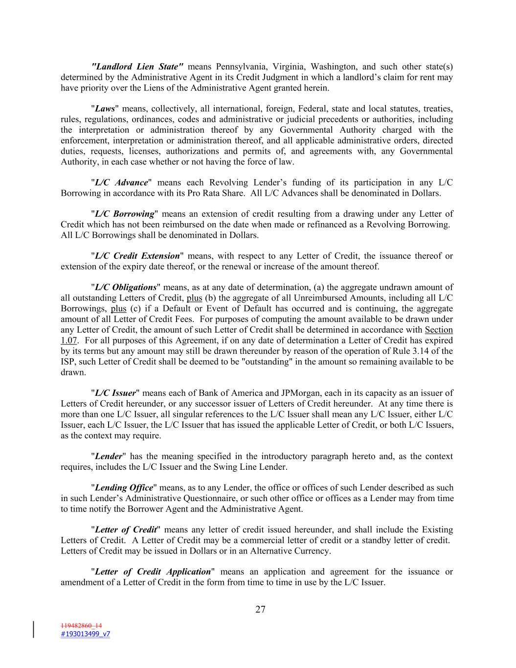 "Landlord Lien State" means Pennsylvania, Virginia, Washington, and such other state(s) determined by the Administrative Agent in its Credit Judgment in which a landlord’s claim for rent may have priority over the Liens of the Administrative Agent granted herein. "Laws" means, collectively, all international, foreign, Federal, state and local statutes, treaties, rules, regulations, ordinances, codes and administrative or judicial precedents or authorities, including the interpretation or administration thereof by any Governmental Authority charged with the enforcement, interpretation or administration thereof, and all applicable administrative orders, directed duties, requests, licenses, authorizations and permits of, and agreements with, any Governmental Authority, in each case whether or not having the force of law. "L/C Advance" means each Revolving Lender’s funding of its participation in any L/C Borrowing in accordance with its Pro Rata Share. All L/C Advances shall be denominated in Dollars. "L/C Borrowing" means an extension of credit resulting from a drawing under any Letter of Credit which has not been reimbursed on the date when made or refinanced as a Revolving Borrowing. All L/C Borrowings shall be denominated in Dollars. "L/C Credit Extension" means, with respect to any Letter of Credit, the issuance thereof or extension of the expiry date thereof, or the renewal or increase of the amount thereof. "L/C Obligations" means, as at any date of determination, (a) the aggregate undrawn amount of all outstanding Letters of Credit, plus (b) the aggregate of all Unreimbursed Amounts, including all L/C Borrowings, plus (c) if a Default or Event of Default has occurred and is continuing, the aggregate amount of all Letter of Credit Fees. For purposes of computing the amount available to be drawn under any Letter of Credit, the amount of such Letter of Credit shall be determined in accordance with Section 1.07. For all purposes of this Agreement, if on any date of determination a Letter of Credit has expired by its terms but any amount may still be drawn thereunder by reason of the operation of Rule 3.14 of the ISP, such Letter of Credit shall be deemed to be "outstanding" in the amount so remaining available to be drawn. "L/C Issuer" means each of Bank of America and JPMorgan, each in its capacity as an issuer of Letters of Credit hereunder, or any successor issuer of Letters of Credit hereunder. At any time there is more than one L/C Issuer, all singular references to the L/C Issuer shall mean any L/C Issuer, either L/C Issuer, each L/C Issuer, the L/C Issuer that has issued the applicable Letter of Credit, or both L/C Issuers, as the context may require. "Lender" has the meaning specified in the introductory paragraph hereto and, as the context requires, includes the L/C Issuer and the Swing Line Lender. "Lending Office" means, as to any Lender, the office or offices of such Lender described as such in such Lender’s Administrative Questionnaire, or such other office or offices as a Lender may from time to time notify the Borrower Agent and the Administrative Agent. "Letter of Credit" means any letter of credit issued hereunder, and shall include the Existing Letters of Credit. A Letter of Credit may be a commercial letter of credit or a standby letter of credit. Letters of Credit may be issued in Dollars or in an Alternative Currency. "Letter of Credit Application" means an application and agreement for the issuance or amendment of a Letter of Credit in the form from time to time in use by the L/C Issuer. 27 119482860_14 #193013499_v7