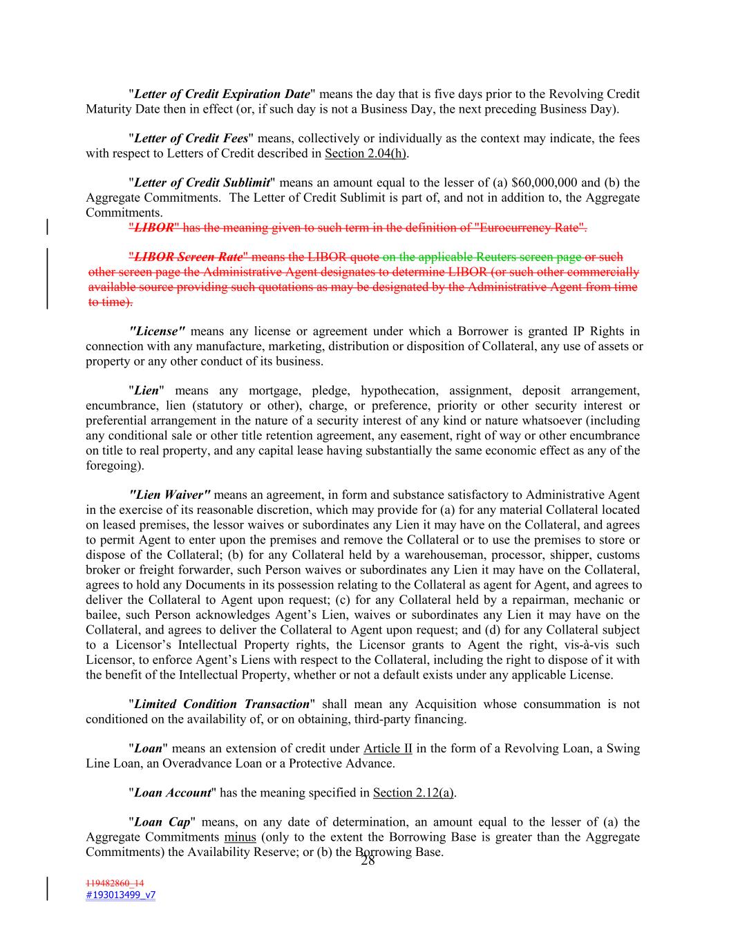 "Letter of Credit Expiration Date" means the day that is five days prior to the Revolving Credit Maturity Date then in effect (or, if such day is not a Business Day, the next preceding Business Day). "Letter of Credit Fees" means, collectively or individually as the context may indicate, the fees with respect to Letters of Credit described in Section 2.04(h). "Letter of Credit Sublimit" means an amount equal to the lesser of (a) $60,000,000 and (b) the Aggregate Commitments. The Letter of Credit Sublimit is part of, and not in addition to, the Aggregate Commitments. "LIBOR" has the meaning given to such term in the definition of "Eurocurrency Rate". "LIBOR Screen Rate" means the LIBOR quote on the applicable Reuters screen page or such other screen page the Administrative Agent designates to determine LIBOR (or such other commercially available source providing such quotations as may be designated by the Administrative Agent from time to time). "License" means any license or agreement under which a Borrower is granted IP Rights in connection with any manufacture, marketing, distribution or disposition of Collateral, any use of assets or property or any other conduct of its business. "Lien" means any mortgage, pledge, hypothecation, assignment, deposit arrangement, encumbrance, lien (statutory or other), charge, or preference, priority or other security interest or preferential arrangement in the nature of a security interest of any kind or nature whatsoever (including any conditional sale or other title retention agreement, any easement, right of way or other encumbrance on title to real property, and any capital lease having substantially the same economic effect as any of the foregoing). "Lien Waiver" means an agreement, in form and substance satisfactory to Administrative Agent in the exercise of its reasonable discretion, which may provide for (a) for any material Collateral located on leased premises, the lessor waives or subordinates any Lien it may have on the Collateral, and agrees to permit Agent to enter upon the premises and remove the Collateral or to use the premises to store or dispose of the Collateral; (b) for any Collateral held by a warehouseman, processor, shipper, customs broker or freight forwarder, such Person waives or subordinates any Lien it may have on the Collateral, agrees to hold any Documents in its possession relating to the Collateral as agent for Agent, and agrees to deliver the Collateral to Agent upon request; (c) for any Collateral held by a repairman, mechanic or bailee, such Person acknowledges Agent’s Lien, waives or subordinates any Lien it may have on the Collateral, and agrees to deliver the Collateral to Agent upon request; and (d) for any Collateral subject to a Licensor’s Intellectual Property rights, the Licensor grants to Agent the right, vis-à-vis such Licensor, to enforce Agent’s Liens with respect to the Collateral, including the right to dispose of it with the benefit of the Intellectual Property, whether or not a default exists under any applicable License. "Limited Condition Transaction" shall mean any Acquisition whose consummation is not conditioned on the availability of, or on obtaining, third-party financing. "Loan" means an extension of credit under Article II in the form of a Revolving Loan, a Swing Line Loan, an Overadvance Loan or a Protective Advance. "Loan Account" has the meaning specified in Section 2.12(a). "Loan Cap" means, on any date of determination, an amount equal to the lesser of (a) the Aggregate Commitments minus (only to the extent the Borrowing Base is greater than the Aggregate Commitments) the Availability Reserve; or (b) the Borrowing Base. 28 119482860_14 #193013499_v7
