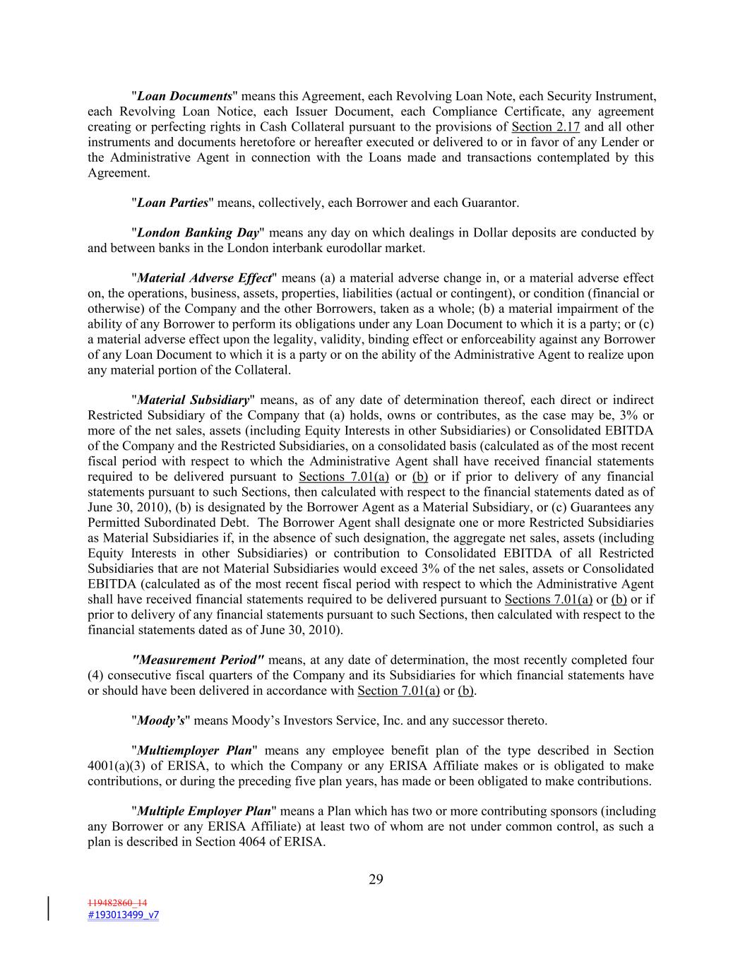 "Loan Documents" means this Agreement, each Revolving Loan Note, each Security Instrument, each Revolving Loan Notice, each Issuer Document, each Compliance Certificate, any agreement creating or perfecting rights in Cash Collateral pursuant to the provisions of Section 2.17 and all other instruments and documents heretofore or hereafter executed or delivered to or in favor of any Lender or the Administrative Agent in connection with the Loans made and transactions contemplated by this Agreement. "Loan Parties" means, collectively, each Borrower and each Guarantor. "London Banking Day" means any day on which dealings in Dollar deposits are conducted by and between banks in the London interbank eurodollar market. "Material Adverse Effect" means (a) a material adverse change in, or a material adverse effect on, the operations, business, assets, properties, liabilities (actual or contingent), or condition (financial or otherwise) of the Company and the other Borrowers, taken as a whole; (b) a material impairment of the ability of any Borrower to perform its obligations under any Loan Document to which it is a party; or (c) a material adverse effect upon the legality, validity, binding effect or enforceability against any Borrower of any Loan Document to which it is a party or on the ability of the Administrative Agent to realize upon any material portion of the Collateral. "Material Subsidiary" means, as of any date of determination thereof, each direct or indirect Restricted Subsidiary of the Company that (a) holds, owns or contributes, as the case may be, 3% or more of the net sales, assets (including Equity Interests in other Subsidiaries) or Consolidated EBITDA of the Company and the Restricted Subsidiaries, on a consolidated basis (calculated as of the most recent fiscal period with respect to which the Administrative Agent shall have received financial statements required to be delivered pursuant to Sections 7.01(a) or (b) or if prior to delivery of any financial statements pursuant to such Sections, then calculated with respect to the financial statements dated as of June 30, 2010), (b) is designated by the Borrower Agent as a Material Subsidiary, or (c) Guarantees any Permitted Subordinated Debt. The Borrower Agent shall designate one or more Restricted Subsidiaries as Material Subsidiaries if, in the absence of such designation, the aggregate net sales, assets (including Equity Interests in other Subsidiaries) or contribution to Consolidated EBITDA of all Restricted Subsidiaries that are not Material Subsidiaries would exceed 3% of the net sales, assets or Consolidated EBITDA (calculated as of the most recent fiscal period with respect to which the Administrative Agent shall have received financial statements required to be delivered pursuant to Sections 7.01(a) or (b) or if prior to delivery of any financial statements pursuant to such Sections, then calculated with respect to the financial statements dated as of June 30, 2010). "Measurement Period" means, at any date of determination, the most recently completed four (4) consecutive fiscal quarters of the Company and its Subsidiaries for which financial statements have or should have been delivered in accordance with Section 7.01(a) or (b). "Moody’s" means Moody’s Investors Service, Inc. and any successor thereto. "Multiemployer Plan" means any employee benefit plan of the type described in Section 4001(a)(3) of ERISA, to which the Company or any ERISA Affiliate makes or is obligated to make contributions, or during the preceding five plan years, has made or been obligated to make contributions. "Multiple Employer Plan" means a Plan which has two or more contributing sponsors (including any Borrower or any ERISA Affiliate) at least two of whom are not under common control, as such a plan is described in Section 4064 of ERISA. 29 119482860_14 #193013499_v7