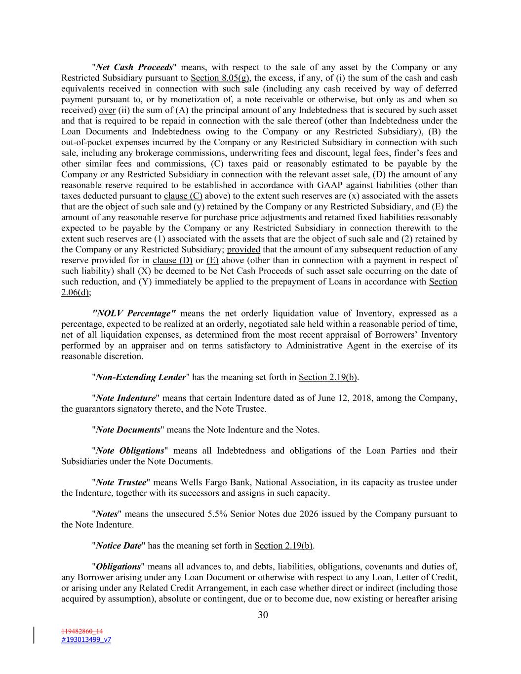 "Net Cash Proceeds" means, with respect to the sale of any asset by the Company or any Restricted Subsidiary pursuant to Section 8.05(g), the excess, if any, of (i) the sum of the cash and cash equivalents received in connection with such sale (including any cash received by way of deferred payment pursuant to, or by monetization of, a note receivable or otherwise, but only as and when so received) over (ii) the sum of (A) the principal amount of any Indebtedness that is secured by such asset and that is required to be repaid in connection with the sale thereof (other than Indebtedness under the Loan Documents and Indebtedness owing to the Company or any Restricted Subsidiary), (B) the out-of-pocket expenses incurred by the Company or any Restricted Subsidiary in connection with such sale, including any brokerage commissions, underwriting fees and discount, legal fees, finder’s fees and other similar fees and commissions, (C) taxes paid or reasonably estimated to be payable by the Company or any Restricted Subsidiary in connection with the relevant asset sale, (D) the amount of any reasonable reserve required to be established in accordance with GAAP against liabilities (other than taxes deducted pursuant to clause (C) above) to the extent such reserves are (x) associated with the assets that are the object of such sale and (y) retained by the Company or any Restricted Subsidiary, and (E) the amount of any reasonable reserve for purchase price adjustments and retained fixed liabilities reasonably expected to be payable by the Company or any Restricted Subsidiary in connection therewith to the extent such reserves are (1) associated with the assets that are the object of such sale and (2) retained by the Company or any Restricted Subsidiary; provided that the amount of any subsequent reduction of any reserve provided for in clause (D) or (E) above (other than in connection with a payment in respect of such liability) shall (X) be deemed to be Net Cash Proceeds of such asset sale occurring on the date of such reduction, and (Y) immediately be applied to the prepayment of Loans in accordance with Section 2.06(d); "NOLV Percentage" means the net orderly liquidation value of Inventory, expressed as a percentage, expected to be realized at an orderly, negotiated sale held within a reasonable period of time, net of all liquidation expenses, as determined from the most recent appraisal of Borrowers’ Inventory performed by an appraiser and on terms satisfactory to Administrative Agent in the exercise of its reasonable discretion. "Non-Extending Lender" has the meaning set forth in Section 2.19(b). "Note Indenture" means that certain Indenture dated as of June 12, 2018, among the Company, the guarantors signatory thereto, and the Note Trustee. "Note Documents" means the Note Indenture and the Notes. "Note Obligations" means all Indebtedness and obligations of the Loan Parties and their Subsidiaries under the Note Documents. "Note Trustee" means Wells Fargo Bank, National Association, in its capacity as trustee under the Indenture, together with its successors and assigns in such capacity. "Notes" means the unsecured 5.5% Senior Notes due 2026 issued by the Company pursuant to the Note Indenture. "Notice Date" has the meaning set forth in Section 2.19(b). "Obligations" means all advances to, and debts, liabilities, obligations, covenants and duties of, any Borrower arising under any Loan Document or otherwise with respect to any Loan, Letter of Credit, or arising under any Related Credit Arrangement, in each case whether direct or indirect (including those acquired by assumption), absolute or contingent, due or to become due, now existing or hereafter arising 30 119482860_14 #193013499_v7