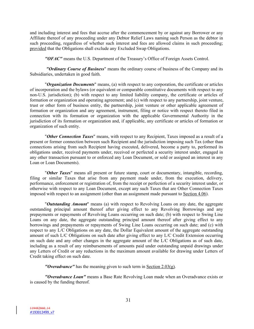 and including interest and fees that accrue after the commencement by or against any Borrower or any Affiliate thereof of any proceeding under any Debtor Relief Laws naming such Person as the debtor in such proceeding, regardless of whether such interest and fees are allowed claims in such proceeding; provided that the Obligations shall exclude any Excluded Swap Obligations. "OFAC" means the U.S. Department of the Treasury’s Office of Foreign Assets Control. "Ordinary Course of Business" means the ordinary course of business of the Company and its Subsidiaries, undertaken in good faith. "Organization Documents" means, (a) with respect to any corporation, the certificate or articles of incorporation and the bylaws (or equivalent or comparable constitutive documents with respect to any non-U.S. jurisdiction); (b) with respect to any limited liability company, the certificate or articles of formation or organization and operating agreement; and (c) with respect to any partnership, joint venture, trust or other form of business entity, the partnership, joint venture or other applicable agreement of formation or organization and any agreement, instrument, filing or notice with respect thereto filed in connection with its formation or organization with the applicable Governmental Authority in the jurisdiction of its formation or organization and, if applicable, any certificate or articles of formation or organization of such entity. "Other Connection Taxes" means, with respect to any Recipient, Taxes imposed as a result of a present or former connection between such Recipient and the jurisdiction imposing such Tax (other than connections arising from such Recipient having executed, delivered, become a party to, performed its obligations under, received payments under, received or perfected a security interest under, engaged in any other transaction pursuant to or enforced any Loan Document, or sold or assigned an interest in any Loan or Loan Documents). "Other Taxes" means all present or future stamp, court or documentary, intangible, recording, filing or similar Taxes that arise from any payment made under, from the execution, delivery, performance, enforcement or registration of, from the receipt or perfection of a security interest under, or otherwise with respect to any Loan Document, except any such Taxes that are Other Connection Taxes imposed with respect to an assignment (other than an assignment made pursuant to Section 4.06). "Outstanding Amount" means (a) with respect to Revolving Loans on any date, the aggregate outstanding principal amount thereof after giving effect to any Revolving Borrowings and any prepayments or repayments of Revolving Loans occurring on such date; (b) with respect to Swing Line Loans on any date, the aggregate outstanding principal amount thereof after giving effect to any borrowings and prepayments or repayments of Swing Line Loans occurring on such date; and (c) with respect to any L/C Obligations on any date, the Dollar Equivalent amount of the aggregate outstanding amount of such L/C Obligations on such date after giving effect to any L/C Credit Extension occurring on such date and any other changes in the aggregate amount of the L/C Obligations as of such date, including as a result of any reimbursements of amounts paid under outstanding unpaid drawings under any Letters of Credit or any reductions in the maximum amount available for drawing under Letters of Credit taking effect on such date. "Overadvance" has the meaning given to such term in Section 2.03(g). "Overadvance Loan" means a Base Rate Revolving Loan made when an Overadvance exists or is caused by the funding thereof. 31 119482860_14 #193013499_v7