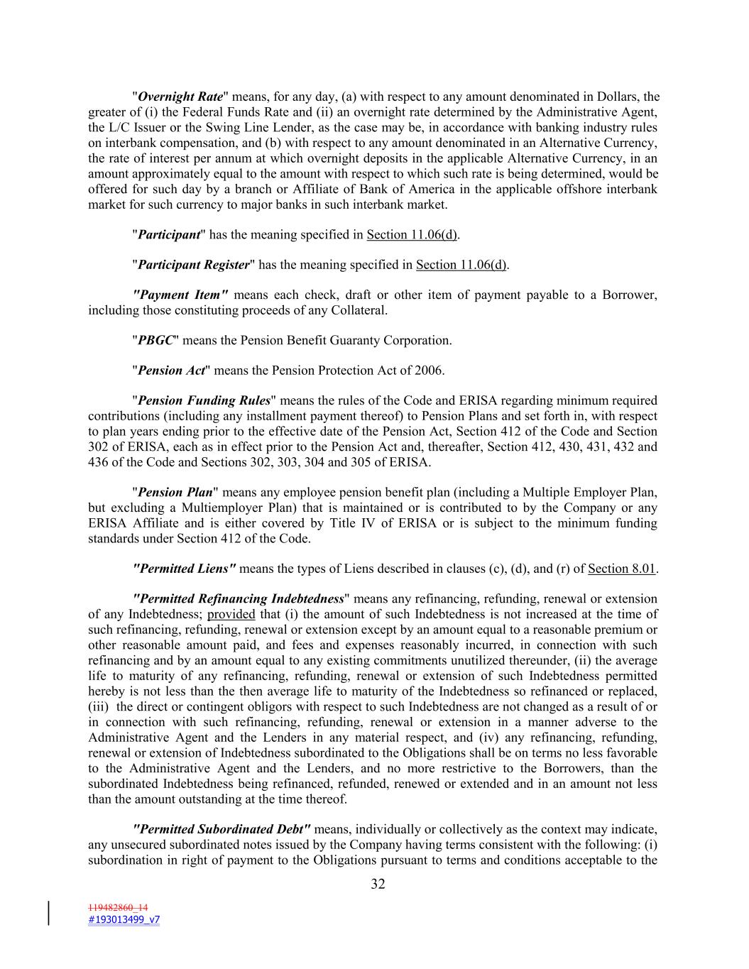 "Overnight Rate" means, for any day, (a) with respect to any amount denominated in Dollars, the greater of (i) the Federal Funds Rate and (ii) an overnight rate determined by the Administrative Agent, the L/C Issuer or the Swing Line Lender, as the case may be, in accordance with banking industry rules on interbank compensation, and (b) with respect to any amount denominated in an Alternative Currency, the rate of interest per annum at which overnight deposits in the applicable Alternative Currency, in an amount approximately equal to the amount with respect to which such rate is being determined, would be offered for such day by a branch or Affiliate of Bank of America in the applicable offshore interbank market for such currency to major banks in such interbank market. "Participant" has the meaning specified in Section 11.06(d). "Participant Register" has the meaning specified in Section 11.06(d). "Payment Item" means each check, draft or other item of payment payable to a Borrower, including those constituting proceeds of any Collateral. "PBGC" means the Pension Benefit Guaranty Corporation. "Pension Act" means the Pension Protection Act of 2006. "Pension Funding Rules" means the rules of the Code and ERISA regarding minimum required contributions (including any installment payment thereof) to Pension Plans and set forth in, with respect to plan years ending prior to the effective date of the Pension Act, Section 412 of the Code and Section 302 of ERISA, each as in effect prior to the Pension Act and, thereafter, Section 412, 430, 431, 432 and 436 of the Code and Sections 302, 303, 304 and 305 of ERISA. "Pension Plan" means any employee pension benefit plan (including a Multiple Employer Plan, but excluding a Multiemployer Plan) that is maintained or is contributed to by the Company or any ERISA Affiliate and is either covered by Title IV of ERISA or is subject to the minimum funding standards under Section 412 of the Code. "Permitted Liens" means the types of Liens described in clauses (c), (d), and (r) of Section 8.01. "Permitted Refinancing Indebtedness" means any refinancing, refunding, renewal or extension of any Indebtedness; provided that (i) the amount of such Indebtedness is not increased at the time of such refinancing, refunding, renewal or extension except by an amount equal to a reasonable premium or other reasonable amount paid, and fees and expenses reasonably incurred, in connection with such refinancing and by an amount equal to any existing commitments unutilized thereunder, (ii) the average life to maturity of any refinancing, refunding, renewal or extension of such Indebtedness permitted hereby is not less than the then average life to maturity of the Indebtedness so refinanced or replaced, (iii) the direct or contingent obligors with respect to such Indebtedness are not changed as a result of or in connection with such refinancing, refunding, renewal or extension in a manner adverse to the Administrative Agent and the Lenders in any material respect, and (iv) any refinancing, refunding, renewal or extension of Indebtedness subordinated to the Obligations shall be on terms no less favorable to the Administrative Agent and the Lenders, and no more restrictive to the Borrowers, than the subordinated Indebtedness being refinanced, refunded, renewed or extended and in an amount not less than the amount outstanding at the time thereof. "Permitted Subordinated Debt" means, individually or collectively as the context may indicate, any unsecured subordinated notes issued by the Company having terms consistent with the following: (i) subordination in right of payment to the Obligations pursuant to terms and conditions acceptable to the 32 119482860_14 #193013499_v7