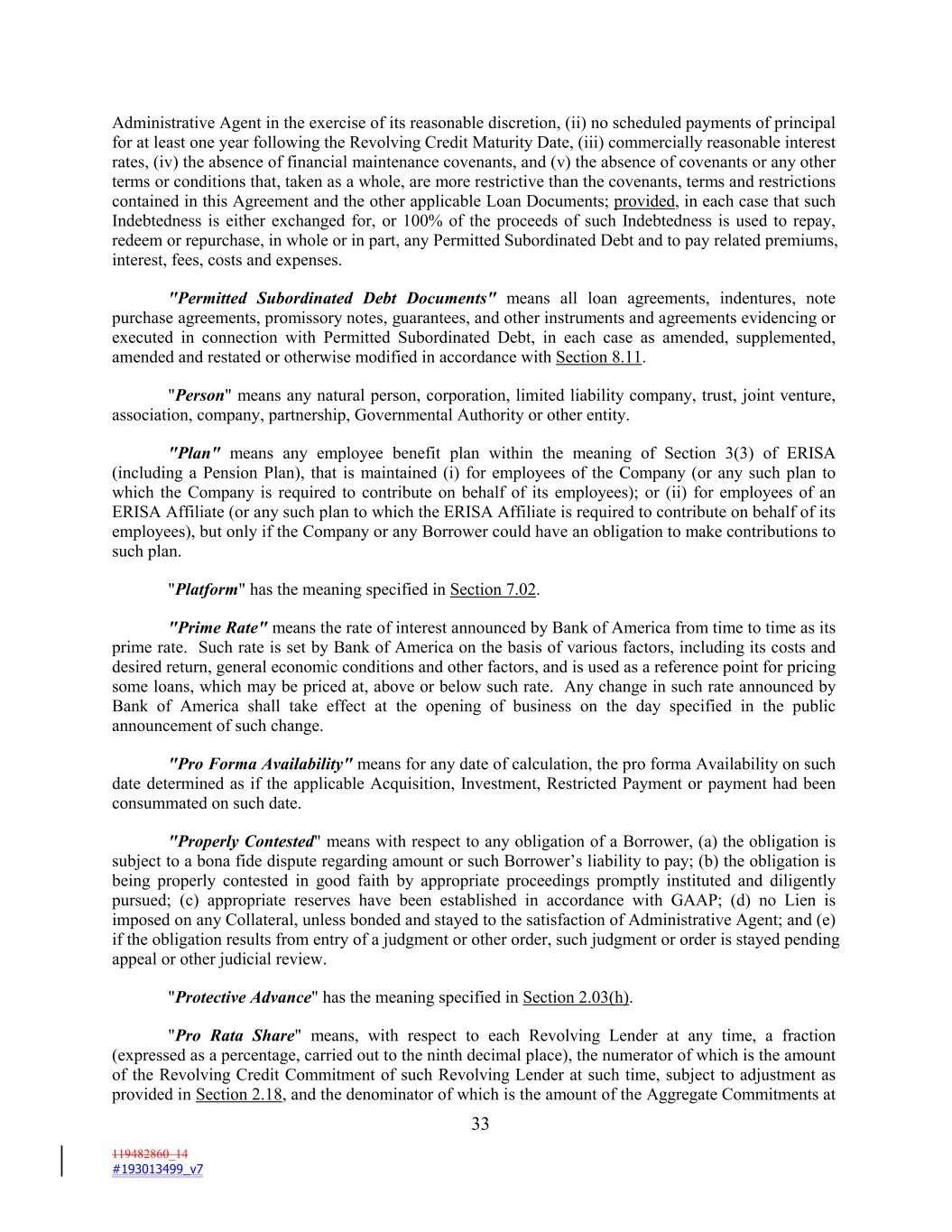 Administrative Agent in the exercise of its reasonable discretion, (ii) no scheduled payments of principal for at least one year following the Revolving Credit Maturity Date, (iii) commercially reasonable interest rates, (iv) the absence of financial maintenance covenants, and (v) the absence of covenants or any other terms or conditions that, taken as a whole, are more restrictive than the covenants, terms and restrictions contained in this Agreement and the other applicable Loan Documents; provided, in each case that such Indebtedness is either exchanged for, or 100% of the proceeds of such Indebtedness is used to repay, redeem or repurchase, in whole or in part, any Permitted Subordinated Debt and to pay related premiums, interest, fees, costs and expenses. "Permitted Subordinated Debt Documents" means all loan agreements, indentures, note purchase agreements, promissory notes, guarantees, and other instruments and agreements evidencing or executed in connection with Permitted Subordinated Debt, in each case as amended, supplemented, amended and restated or otherwise modified in accordance with Section 8.11. "Person" means any natural person, corporation, limited liability company, trust, joint venture, association, company, partnership, Governmental Authority or other entity. "Plan" means any employee benefit plan within the meaning of Section 3(3) of ERISA (including a Pension Plan), that is maintained (i) for employees of the Company (or any such plan to which the Company is required to contribute on behalf of its employees); or (ii) for employees of an ERISA Affiliate (or any such plan to which the ERISA Affiliate is required to contribute on behalf of its employees), but only if the Company or any Borrower could have an obligation to make contributions to such plan. "Platform" has the meaning specified in Section 7.02. "Prime Rate" means the rate of interest announced by Bank of America from time to time as its prime rate. Such rate is set by Bank of America on the basis of various factors, including its costs and desired return, general economic conditions and other factors, and is used as a reference point for pricing some loans, which may be priced at, above or below such rate. Any change in such rate announced by Bank of America shall take effect at the opening of business on the day specified in the public announcement of such change. "Pro Forma Availability" means for any date of calculation, the pro forma Availability on such date determined as if the applicable Acquisition, Investment, Restricted Payment or payment had been consummated on such date. "Properly Contested" means with respect to any obligation of a Borrower, (a) the obligation is subject to a bona fide dispute regarding amount or such Borrower’s liability to pay; (b) the obligation is being properly contested in good faith by appropriate proceedings promptly instituted and diligently pursued; (c) appropriate reserves have been established in accordance with GAAP; (d) no Lien is imposed on any Collateral, unless bonded and stayed to the satisfaction of Administrative Agent; and (e) if the obligation results from entry of a judgment or other order, such judgment or order is stayed pending appeal or other judicial review. "Protective Advance" has the meaning specified in Section 2.03(h). "Pro Rata Share" means, with respect to each Revolving Lender at any time, a fraction (expressed as a percentage, carried out to the ninth decimal place), the numerator of which is the amount of the Revolving Credit Commitment of such Revolving Lender at such time, subject to adjustment as provided in Section 2.18, and the denominator of which is the amount of the Aggregate Commitments at 33 119482860_14 #193013499_v7