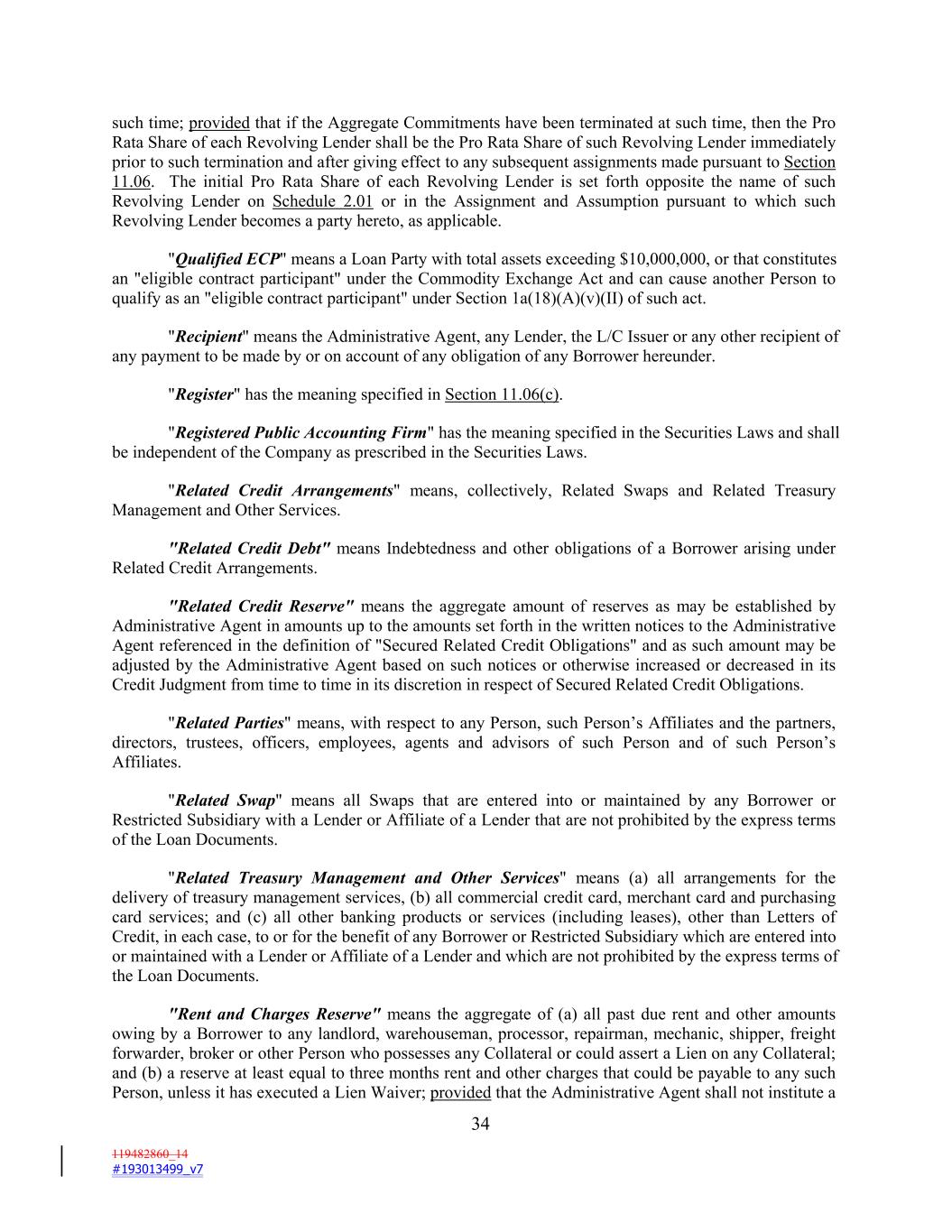 such time; provided that if the Aggregate Commitments have been terminated at such time, then the Pro Rata Share of each Revolving Lender shall be the Pro Rata Share of such Revolving Lender immediately prior to such termination and after giving effect to any subsequent assignments made pursuant to Section 11.06. The initial Pro Rata Share of each Revolving Lender is set forth opposite the name of such Revolving Lender on Schedule 2.01 or in the Assignment and Assumption pursuant to which such Revolving Lender becomes a party hereto, as applicable. "Qualified ECP" means a Loan Party with total assets exceeding $10,000,000, or that constitutes an "eligible contract participant" under the Commodity Exchange Act and can cause another Person to qualify as an "eligible contract participant" under Section 1a(18)(A)(v)(II) of such act. "Recipient" means the Administrative Agent, any Lender, the L/C Issuer or any other recipient of any payment to be made by or on account of any obligation of any Borrower hereunder. "Register" has the meaning specified in Section 11.06(c). "Registered Public Accounting Firm" has the meaning specified in the Securities Laws and shall be independent of the Company as prescribed in the Securities Laws. "Related Credit Arrangements" means, collectively, Related Swaps and Related Treasury Management and Other Services. "Related Credit Debt" means Indebtedness and other obligations of a Borrower arising under Related Credit Arrangements. "Related Credit Reserve" means the aggregate amount of reserves as may be established by Administrative Agent in amounts up to the amounts set forth in the written notices to the Administrative Agent referenced in the definition of "Secured Related Credit Obligations" and as such amount may be adjusted by the Administrative Agent based on such notices or otherwise increased or decreased in its Credit Judgment from time to time in its discretion in respect of Secured Related Credit Obligations. "Related Parties" means, with respect to any Person, such Person’s Affiliates and the partners, directors, trustees, officers, employees, agents and advisors of such Person and of such Person’s Affiliates. "Related Swap" means all Swaps that are entered into or maintained by any Borrower or Restricted Subsidiary with a Lender or Affiliate of a Lender that are not prohibited by the express terms of the Loan Documents. "Related Treasury Management and Other Services" means (a) all arrangements for the delivery of treasury management services, (b) all commercial credit card, merchant card and purchasing card services; and (c) all other banking products or services (including leases), other than Letters of Credit, in each case, to or for the benefit of any Borrower or Restricted Subsidiary which are entered into or maintained with a Lender or Affiliate of a Lender and which are not prohibited by the express terms of the Loan Documents. "Rent and Charges Reserve" means the aggregate of (a) all past due rent and other amounts owing by a Borrower to any landlord, warehouseman, processor, repairman, mechanic, shipper, freight forwarder, broker or other Person who possesses any Collateral or could assert a Lien on any Collateral; and (b) a reserve at least equal to three months rent and other charges that could be payable to any such Person, unless it has executed a Lien Waiver; provided that the Administrative Agent shall not institute a 34 119482860_14 #193013499_v7