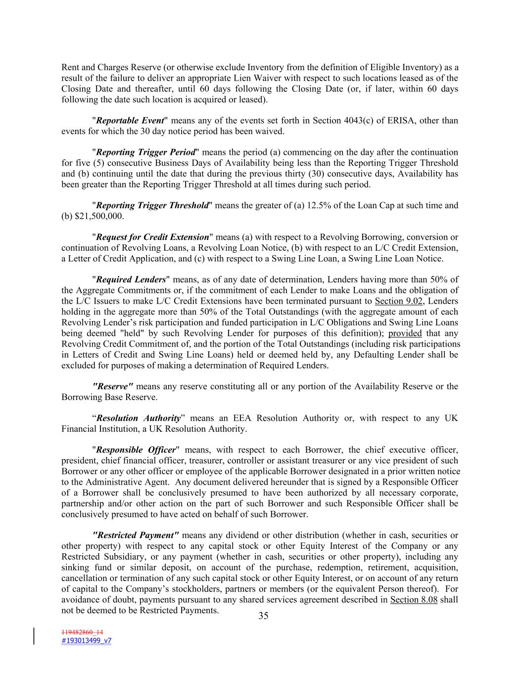 Rent and Charges Reserve (or otherwise exclude Inventory from the definition of Eligible Inventory) as a result of the failure to deliver an appropriate Lien Waiver with respect to such locations leased as of the Closing Date and thereafter, until 60 days following the Closing Date (or, if later, within 60 days following the date such location is acquired or leased). "Reportable Event" means any of the events set forth in Section 4043(c) of ERISA, other than events for which the 30 day notice period has been waived. "Reporting Trigger Period" means the period (a) commencing on the day after the continuation for five (5) consecutive Business Days of Availability being less than the Reporting Trigger Threshold and (b) continuing until the date that during the previous thirty (30) consecutive days, Availability has been greater than the Reporting Trigger Threshold at all times during such period. "Reporting Trigger Threshold" means the greater of (a) 12.5% of the Loan Cap at such time and (b) $21,500,000. "Request for Credit Extension" means (a) with respect to a Revolving Borrowing, conversion or continuation of Revolving Loans, a Revolving Loan Notice, (b) with respect to an L/C Credit Extension, a Letter of Credit Application, and (c) with respect to a Swing Line Loan, a Swing Line Loan Notice. "Required Lenders" means, as of any date of determination, Lenders having more than 50% of the Aggregate Commitments or, if the commitment of each Lender to make Loans and the obligation of the L/C Issuers to make L/C Credit Extensions have been terminated pursuant to Section 9.02, Lenders holding in the aggregate more than 50% of the Total Outstandings (with the aggregate amount of each Revolving Lender’s risk participation and funded participation in L/C Obligations and Swing Line Loans being deemed "held" by such Revolving Lender for purposes of this definition); provided that any Revolving Credit Commitment of, and the portion of the Total Outstandings (including risk participations in Letters of Credit and Swing Line Loans) held or deemed held by, any Defaulting Lender shall be excluded for purposes of making a determination of Required Lenders. "Reserve" means any reserve constituting all or any portion of the Availability Reserve or the Borrowing Base Reserve. “Resolution Authority” means an EEA Resolution Authority or, with respect to any UK Financial Institution, a UK Resolution Authority. "Responsible Officer" means, with respect to each Borrower, the chief executive officer, president, chief financial officer, treasurer, controller or assistant treasurer or any vice president of such Borrower or any other officer or employee of the applicable Borrower designated in a prior written notice to the Administrative Agent. Any document delivered hereunder that is signed by a Responsible Officer of a Borrower shall be conclusively presumed to have been authorized by all necessary corporate, partnership and/or other action on the part of such Borrower and such Responsible Officer shall be conclusively presumed to have acted on behalf of such Borrower. "Restricted Payment" means any dividend or other distribution (whether in cash, securities or other property) with respect to any capital stock or other Equity Interest of the Company or any Restricted Subsidiary, or any payment (whether in cash, securities or other property), including any sinking fund or similar deposit, on account of the purchase, redemption, retirement, acquisition, cancellation or termination of any such capital stock or other Equity Interest, or on account of any return of capital to the Company’s stockholders, partners or members (or the equivalent Person thereof). For avoidance of doubt, payments pursuant to any shared services agreement described in Section 8.08 shall not be deemed to be Restricted Payments. 35 119482860_14 #193013499_v7