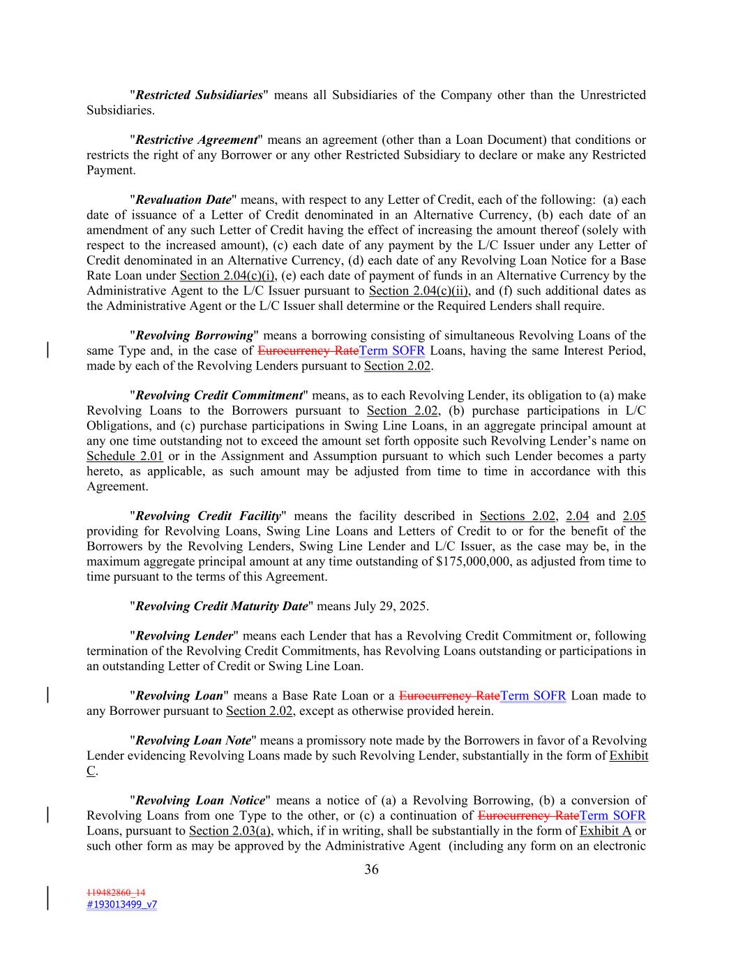 "Restricted Subsidiaries" means all Subsidiaries of the Company other than the Unrestricted Subsidiaries. "Restrictive Agreement" means an agreement (other than a Loan Document) that conditions or restricts the right of any Borrower or any other Restricted Subsidiary to declare or make any Restricted Payment. "Revaluation Date" means, with respect to any Letter of Credit, each of the following: (a) each date of issuance of a Letter of Credit denominated in an Alternative Currency, (b) each date of an amendment of any such Letter of Credit having the effect of increasing the amount thereof (solely with respect to the increased amount), (c) each date of any payment by the L/C Issuer under any Letter of Credit denominated in an Alternative Currency, (d) each date of any Revolving Loan Notice for a Base Rate Loan under Section 2.04(c)(i), (e) each date of payment of funds in an Alternative Currency by the Administrative Agent to the L/C Issuer pursuant to Section 2.04(c)(ii), and (f) such additional dates as the Administrative Agent or the L/C Issuer shall determine or the Required Lenders shall require. "Revolving Borrowing" means a borrowing consisting of simultaneous Revolving Loans of the same Type and, in the case of Eurocurrency RateTerm SOFR Loans, having the same Interest Period, made by each of the Revolving Lenders pursuant to Section 2.02. "Revolving Credit Commitment" means, as to each Revolving Lender, its obligation to (a) make Revolving Loans to the Borrowers pursuant to Section 2.02, (b) purchase participations in L/C Obligations, and (c) purchase participations in Swing Line Loans, in an aggregate principal amount at any one time outstanding not to exceed the amount set forth opposite such Revolving Lender’s name on Schedule 2.01 or in the Assignment and Assumption pursuant to which such Lender becomes a party hereto, as applicable, as such amount may be adjusted from time to time in accordance with this Agreement. "Revolving Credit Facility" means the facility described in Sections 2.02, 2.04 and 2.05 providing for Revolving Loans, Swing Line Loans and Letters of Credit to or for the benefit of the Borrowers by the Revolving Lenders, Swing Line Lender and L/C Issuer, as the case may be, in the maximum aggregate principal amount at any time outstanding of $175,000,000, as adjusted from time to time pursuant to the terms of this Agreement. "Revolving Credit Maturity Date" means July 29, 2025. "Revolving Lender" means each Lender that has a Revolving Credit Commitment or, following termination of the Revolving Credit Commitments, has Revolving Loans outstanding or participations in an outstanding Letter of Credit or Swing Line Loan. "Revolving Loan" means a Base Rate Loan or a Eurocurrency RateTerm SOFR Loan made to any Borrower pursuant to Section 2.02, except as otherwise provided herein. "Revolving Loan Note" means a promissory note made by the Borrowers in favor of a Revolving Lender evidencing Revolving Loans made by such Revolving Lender, substantially in the form of Exhibit C. "Revolving Loan Notice" means a notice of (a) a Revolving Borrowing, (b) a conversion of Revolving Loans from one Type to the other, or (c) a continuation of Eurocurrency RateTerm SOFR Loans, pursuant to Section 2.03(a), which, if in writing, shall be substantially in the form of Exhibit A or such other form as may be approved by the Administrative Agent (including any form on an electronic 36 119482860_14 #193013499_v7