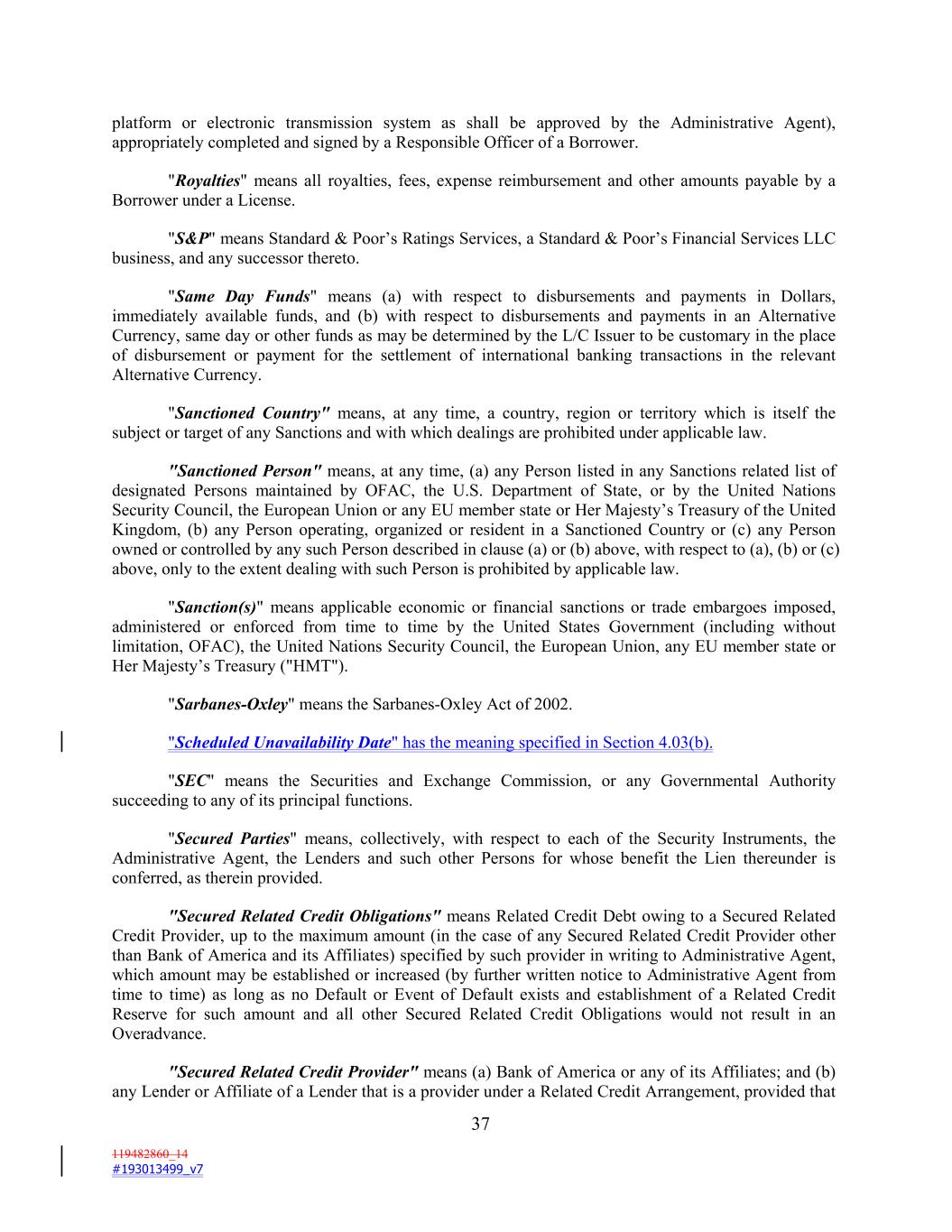 platform or electronic transmission system as shall be approved by the Administrative Agent), appropriately completed and signed by a Responsible Officer of a Borrower. "Royalties" means all royalties, fees, expense reimbursement and other amounts payable by a Borrower under a License. "S&P" means Standard & Poor’s Ratings Services, a Standard & Poor’s Financial Services LLC business, and any successor thereto. "Same Day Funds" means (a) with respect to disbursements and payments in Dollars, immediately available funds, and (b) with respect to disbursements and payments in an Alternative Currency, same day or other funds as may be determined by the L/C Issuer to be customary in the place of disbursement or payment for the settlement of international banking transactions in the relevant Alternative Currency. "Sanctioned Country" means, at any time, a country, region or territory which is itself the subject or target of any Sanctions and with which dealings are prohibited under applicable law. "Sanctioned Person" means, at any time, (a) any Person listed in any Sanctions related list of designated Persons maintained by OFAC, the U.S. Department of State, or by the United Nations Security Council, the European Union or any EU member state or Her Majesty’s Treasury of the United Kingdom, (b) any Person operating, organized or resident in a Sanctioned Country or (c) any Person owned or controlled by any such Person described in clause (a) or (b) above, with respect to (a), (b) or (c) above, only to the extent dealing with such Person is prohibited by applicable law. "Sanction(s)" means applicable economic or financial sanctions or trade embargoes imposed, administered or enforced from time to time by the United States Government (including without limitation, OFAC), the United Nations Security Council, the European Union, any EU member state or Her Majesty’s Treasury ("HMT"). "Sarbanes-Oxley" means the Sarbanes-Oxley Act of 2002. "Scheduled Unavailability Date" has the meaning specified in Section 4.03(b). "SEC" means the Securities and Exchange Commission, or any Governmental Authority succeeding to any of its principal functions. "Secured Parties" means, collectively, with respect to each of the Security Instruments, the Administrative Agent, the Lenders and such other Persons for whose benefit the Lien thereunder is conferred, as therein provided. "Secured Related Credit Obligations" means Related Credit Debt owing to a Secured Related Credit Provider, up to the maximum amount (in the case of any Secured Related Credit Provider other than Bank of America and its Affiliates) specified by such provider in writing to Administrative Agent, which amount may be established or increased (by further written notice to Administrative Agent from time to time) as long as no Default or Event of Default exists and establishment of a Related Credit Reserve for such amount and all other Secured Related Credit Obligations would not result in an Overadvance. "Secured Related Credit Provider" means (a) Bank of America or any of its Affiliates; and (b) any Lender or Affiliate of a Lender that is a provider under a Related Credit Arrangement, provided that 37 119482860_14 #193013499_v7
