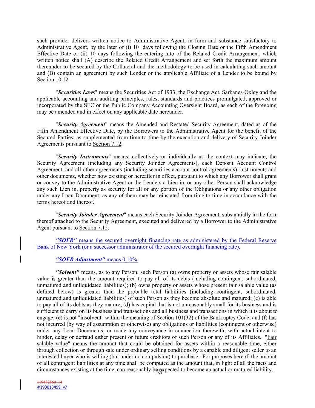 such provider delivers written notice to Administrative Agent, in form and substance satisfactory to Administrative Agent, by the later of (i) 10 days following the Closing Date or the Fifth Amendment Effective Date or (ii) 10 days following the entering into of the Related Credit Arrangement, which written notice shall (A) describe the Related Credit Arrangement and set forth the maximum amount thereunder to be secured by the Collateral and the methodology to be used in calculating such amount and (B) contain an agreement by such Lender or the applicable Affiliate of a Lender to be bound by Section 10.12. "Securities Laws" means the Securities Act of 1933, the Exchange Act, Sarbanes-Oxley and the applicable accounting and auditing principles, rules, standards and practices promulgated, approved or incorporated by the SEC or the Public Company Accounting Oversight Board, as each of the foregoing may be amended and in effect on any applicable date hereunder. "Security Agreement" means the Amended and Restated Security Agreement, dated as of the Fifth Amendment Effective Date, by the Borrowers to the Administrative Agent for the benefit of the Secured Parties, as supplemented from time to time by the execution and delivery of Security Joinder Agreements pursuant to Section 7.12. "Security Instruments" means, collectively or individually as the context may indicate, the Security Agreement (including any Security Joinder Agreements), each Deposit Account Control Agreement, and all other agreements (including securities account control agreements), instruments and other documents, whether now existing or hereafter in effect, pursuant to which any Borrower shall grant or convey to the Administrative Agent or the Lenders a Lien in, or any other Person shall acknowledge any such Lien in, property as security for all or any portion of the Obligations or any other obligation under any Loan Document, as any of them may be reinstated from time to time in accordance with the terms hereof and thereof. "Security Joinder Agreement" means each Security Joinder Agreement, substantially in the form thereof attached to the Security Agreement, executed and delivered by a Borrower to the Administrative Agent pursuant to Section 7.12. "SOFR" means the secured overnight financing rate as administered by the Federal Reserve Bank of New York (or a successor administrator of the secured overnight financing rate). "SOFR Adjustment" means 0.10%. "Solvent" means, as to any Person, such Person (a) owns property or assets whose fair salable value is greater than the amount required to pay all of its debts (including contingent, subordinated, unmatured and unliquidated liabilities); (b) owns property or assets whose present fair salable value (as defined below) is greater than the probable total liabilities (including contingent, subordinated, unmatured and unliquidated liabilities) of such Person as they become absolute and matured; (c) is able to pay all of its debts as they mature; (d) has capital that is not unreasonably small for its business and is sufficient to carry on its business and transactions and all business and transactions in which it is about to engage; (e) is not "insolvent" within the meaning of Section 101(32) of the Bankruptcy Code; and (f) has not incurred (by way of assumption or otherwise) any obligations or liabilities (contingent or otherwise) under any Loan Documents, or made any conveyance in connection therewith, with actual intent to hinder, delay or defraud either present or future creditors of such Person or any of its Affiliates. "Fair salable value" means the amount that could be obtained for assets within a reasonable time, either through collection or through sale under ordinary selling conditions by a capable and diligent seller to an interested buyer who is willing (but under no compulsion) to purchase. For purposes hereof, the amount of all contingent liabilities at any time shall be computed as the amount that, in light of all the facts and circumstances existing at the time, can reasonably be expected to become an actual or matured liability.38 119482860_14 #193013499_v7