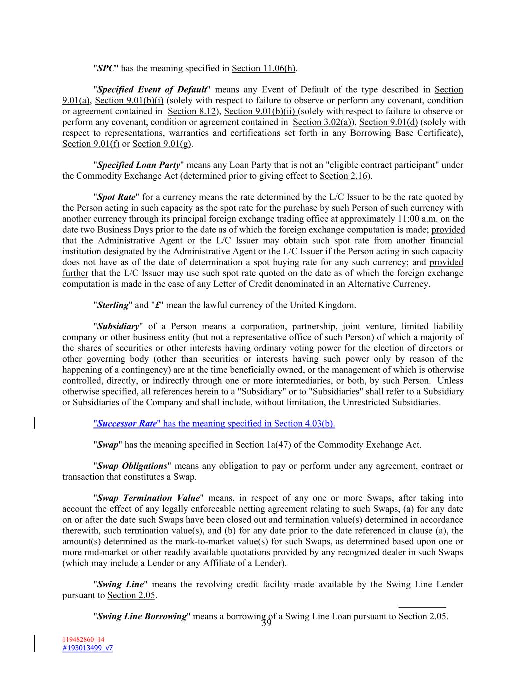 "SPC" has the meaning specified in Section 11.06(h). "Specified Event of Default" means any Event of Default of the type described in Section 9.01(a), Section 9.01(b)(i) (solely with respect to failure to observe or perform any covenant, condition or agreement contained in Section 8.12), Section 9.01(b)(ii) (solely with respect to failure to observe or perform any covenant, condition or agreement contained in Section 3.02(a)), Section 9.01(d) (solely with respect to representations, warranties and certifications set forth in any Borrowing Base Certificate), Section 9.01(f) or Section 9.01(g). "Specified Loan Party" means any Loan Party that is not an "eligible contract participant" under the Commodity Exchange Act (determined prior to giving effect to Section 2.16). "Spot Rate" for a currency means the rate determined by the L/C Issuer to be the rate quoted by the Person acting in such capacity as the spot rate for the purchase by such Person of such currency with another currency through its principal foreign exchange trading office at approximately 11:00 a.m. on the date two Business Days prior to the date as of which the foreign exchange computation is made; provided that the Administrative Agent or the L/C Issuer may obtain such spot rate from another financial institution designated by the Administrative Agent or the L/C Issuer if the Person acting in such capacity does not have as of the date of determination a spot buying rate for any such currency; and provided further that the L/C Issuer may use such spot rate quoted on the date as of which the foreign exchange computation is made in the case of any Letter of Credit denominated in an Alternative Currency. "Sterling" and "£" mean the lawful currency of the United Kingdom. "Subsidiary" of a Person means a corporation, partnership, joint venture, limited liability company or other business entity (but not a representative office of such Person) of which a majority of the shares of securities or other interests having ordinary voting power for the election of directors or other governing body (other than securities or interests having such power only by reason of the happening of a contingency) are at the time beneficially owned, or the management of which is otherwise controlled, directly, or indirectly through one or more intermediaries, or both, by such Person. Unless otherwise specified, all references herein to a "Subsidiary" or to "Subsidiaries" shall refer to a Subsidiary or Subsidiaries of the Company and shall include, without limitation, the Unrestricted Subsidiaries. "Successor Rate" has the meaning specified in Section 4.03(b). "Swap" has the meaning specified in Section 1a(47) of the Commodity Exchange Act. "Swap Obligations" means any obligation to pay or perform under any agreement, contract or transaction that constitutes a Swap. "Swap Termination Value" means, in respect of any one or more Swaps, after taking into account the effect of any legally enforceable netting agreement relating to such Swaps, (a) for any date on or after the date such Swaps have been closed out and termination value(s) determined in accordance therewith, such termination value(s), and (b) for any date prior to the date referenced in clause (a), the amount(s) determined as the mark-to-market value(s) for such Swaps, as determined based upon one or more mid-market or other readily available quotations provided by any recognized dealer in such Swaps (which may include a Lender or any Affiliate of a Lender). "Swing Line" means the revolving credit facility made available by the Swing Line Lender pursuant to Section 2.05. "Swing Line Borrowing" means a borrowing of a Swing Line Loan pursuant to Section 2.05. 39 119482860_14 #193013499_v7