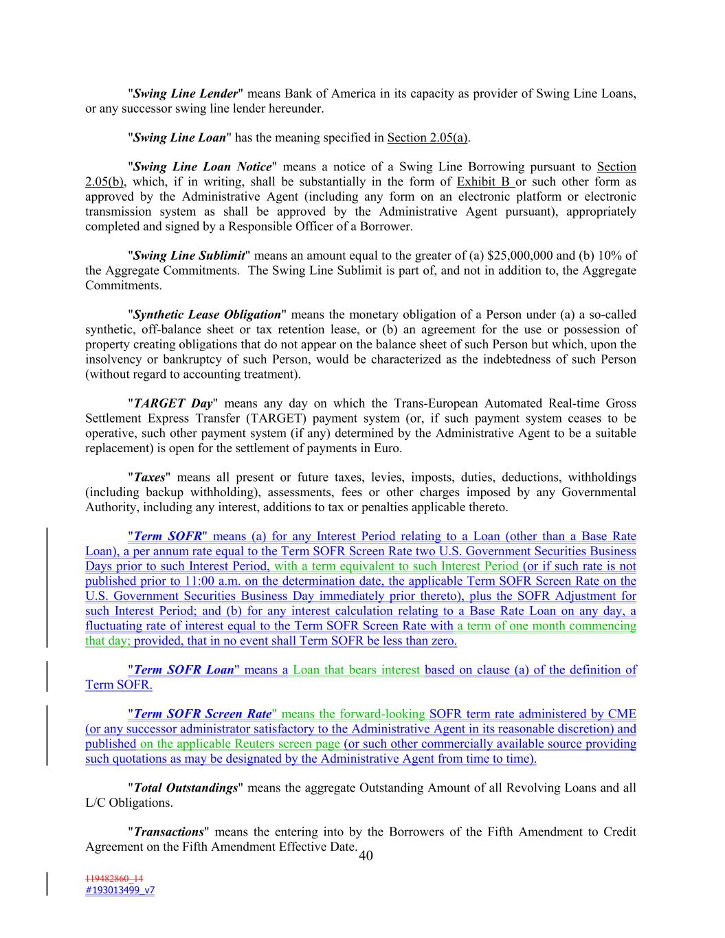 "Swing Line Lender" means Bank of America in its capacity as provider of Swing Line Loans, or any successor swing line lender hereunder. "Swing Line Loan" has the meaning specified in Section 2.05(a). "Swing Line Loan Notice" means a notice of a Swing Line Borrowing pursuant to Section 2.05(b), which, if in writing, shall be substantially in the form of Exhibit B or such other form as approved by the Administrative Agent (including any form on an electronic platform or electronic transmission system as shall be approved by the Administrative Agent pursuant), appropriately completed and signed by a Responsible Officer of a Borrower. "Swing Line Sublimit" means an amount equal to the greater of (a) $25,000,000 and (b) 10% of the Aggregate Commitments. The Swing Line Sublimit is part of, and not in addition to, the Aggregate Commitments. "Synthetic Lease Obligation" means the monetary obligation of a Person under (a) a so-called synthetic, off-balance sheet or tax retention lease, or (b) an agreement for the use or possession of property creating obligations that do not appear on the balance sheet of such Person but which, upon the insolvency or bankruptcy of such Person, would be characterized as the indebtedness of such Person (without regard to accounting treatment). "TARGET Day" means any day on which the Trans-European Automated Real-time Gross Settlement Express Transfer (TARGET) payment system (or, if such payment system ceases to be operative, such other payment system (if any) determined by the Administrative Agent to be a suitable replacement) is open for the settlement of payments in Euro. "Taxes" means all present or future taxes, levies, imposts, duties, deductions, withholdings (including backup withholding), assessments, fees or other charges imposed by any Governmental Authority, including any interest, additions to tax or penalties applicable thereto. "Term SOFR" means (a) for any Interest Period relating to a Loan (other than a Base Rate Loan), a per annum rate equal to the Term SOFR Screen Rate two U.S. Government Securities Business Days prior to such Interest Period, with a term equivalent to such Interest Period (or if such rate is not published prior to 11:00 a.m. on the determination date, the applicable Term SOFR Screen Rate on the U.S. Government Securities Business Day immediately prior thereto), plus the SOFR Adjustment for such Interest Period; and (b) for any interest calculation relating to a Base Rate Loan on any day, a fluctuating rate of interest equal to the Term SOFR Screen Rate with a term of one month commencing that day; provided, that in no event shall Term SOFR be less than zero. "Term SOFR Loan" means a Loan that bears interest based on clause (a) of the definition of Term SOFR. "Term SOFR Screen Rate" means the forward-looking SOFR term rate administered by CME (or any successor administrator satisfactory to the Administrative Agent in its reasonable discretion) and published on the applicable Reuters screen page (or such other commercially available source providing such quotations as may be designated by the Administrative Agent from time to time). "Total Outstandings" means the aggregate Outstanding Amount of all Revolving Loans and all L/C Obligations. "Transactions" means the entering into by the Borrowers of the Fifth Amendment to Credit Agreement on the Fifth Amendment Effective Date. 40 119482860_14 #193013499_v7