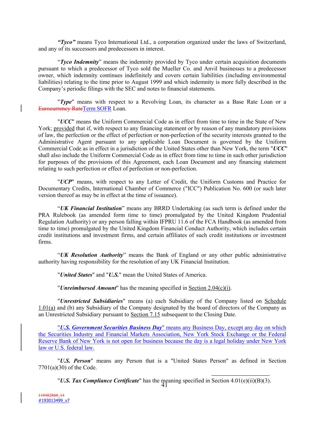 “Tyco” means Tyco International Ltd., a corporation organized under the laws of Switzerland, and any of its successors and predecessors in interest. “Tyco Indemnity” means the indemnity provided by Tyco under certain acquisition documents pursuant to which a predecessor of Tyco sold the Mueller Co. and Anvil businesses to a predecessor owner, which indemnity continues indefinitely and covers certain liabilities (including environmental liabilities) relating to the time prior to August 1999 and which indemnity is more fully described in the Company’s periodic filings with the SEC and notes to financial statements. "Type" means with respect to a Revolving Loan, its character as a Base Rate Loan or a Eurocurrency RateTerm SOFR Loan. "UCC" means the Uniform Commercial Code as in effect from time to time in the State of New York; provided that if, with respect to any financing statement or by reason of any mandatory provisions of law, the perfection or the effect of perfection or non-perfection of the security interests granted to the Administrative Agent pursuant to any applicable Loan Document is governed by the Uniform Commercial Code as in effect in a jurisdiction of the United States other than New York, the term "UCC" shall also include the Uniform Commercial Code as in effect from time to time in such other jurisdiction for purposes of the provisions of this Agreement, each Loan Document and any financing statement relating to such perfection or effect of perfection or non-perfection. "UCP" means, with respect to any Letter of Credit, the Uniform Customs and Practice for Documentary Credits, International Chamber of Commerce ("ICC") Publication No. 600 (or such later version thereof as may be in effect at the time of issuance). “UK Financial Institution” means any BRRD Undertaking (as such term is defined under the PRA Rulebook (as amended form time to time) promulgated by the United Kingdom Prudential Regulation Authority) or any person falling within IFPRU 11.6 of the FCA Handbook (as amended from time to time) promulgated by the United Kingdom Financial Conduct Authority, which includes certain credit institutions and investment firms, and certain affiliates of such credit institutions or investment firms. “UK Resolution Authority” means the Bank of England or any other public administrative authority having responsibility for the resolution of any UK Financial Institution. "United States" and "U.S." mean the United States of America. "Unreimbursed Amount" has the meaning specified in Section 2.04(c)(i). "Unrestricted Subsidiaries" means (a) each Subsidiary of the Company listed on Schedule 1.01(a) and (b) any Subsidiary of the Company designated by the board of directors of the Company as an Unrestricted Subsidiary pursuant to Section 7.15 subsequent to the Closing Date. "U.S. Government Securities Business Day" means any Business Day, except any day on which the Securities Industry and Financial Markets Association, New York Stock Exchange or the Federal Reserve Bank of New York is not open for business because the day is a legal holiday under New York law or U.S. federal law. "U.S. Person" means any Person that is a "United States Person" as defined in Section 7701(a)(30) of the Code. "U.S. Tax Compliance Certificate" has the meaning specified in Section 4.01(e)(ii)(B)(3). 41 119482860_14 #193013499_v7