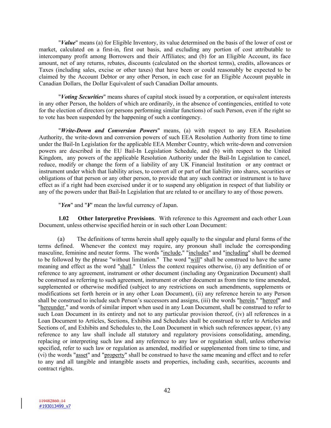 "Value" means (a) for Eligible Inventory, its value determined on the basis of the lower of cost or market, calculated on a first-in, first out basis, and excluding any portion of cost attributable to intercompany profit among Borrowers and their Affiliates; and (b) for an Eligible Account, its face amount, net of any returns, rebates, discounts (calculated on the shortest terms), credits, allowances or Taxes (including sales, excise or other taxes) that have been or could reasonably be expected to be claimed by the Account Debtor or any other Person, in each case for an Eligible Account payable in Canadian Dollars, the Dollar Equivalent of such Canadian Dollar amounts. "Voting Securities" means shares of capital stock issued by a corporation, or equivalent interests in any other Person, the holders of which are ordinarily, in the absence of contingencies, entitled to vote for the election of directors (or persons performing similar functions) of such Person, even if the right so to vote has been suspended by the happening of such a contingency. "Write-Down and Conversion Powers" means, (a) with respect to any EEA Resolution Authority, the write-down and conversion powers of such EEA Resolution Authority from time to time under the Bail-In Legislation for the applicable EEA Member Country, which write-down and conversion powers are described in the EU Bail-In Legislation Schedule, and (b) with respect to the United Kingdom, any powers of the applicable Resolution Authority under the Bail-In Legislation to cancel, reduce, modify or change the form of a liability of any UK Financial Institution or any contract or instrument under which that liability arises, to convert all or part of that liability into shares, securities or obligations of that person or any other person, to provide that any such contract or instrument is to have effect as if a right had been exercised under it or to suspend any obligation in respect of that liability or any of the powers under that Bail-In Legislation that are related to or ancillary to any of those powers. "Yen" and "¥" mean the lawful currency of Japan. 1.02 Other Interpretive Provisions. With reference to this Agreement and each other Loan Document, unless otherwise specified herein or in such other Loan Document: (a) The definitions of terms herein shall apply equally to the singular and plural forms of the terms defined. Whenever the context may require, any pronoun shall include the corresponding masculine, feminine and neuter forms. The words "include," "includes" and "including" shall be deemed to be followed by the phrase "without limitation." The word "will" shall be construed to have the same meaning and effect as the word "shall." Unless the context requires otherwise, (i) any definition of or reference to any agreement, instrument or other document (including any Organization Document) shall be construed as referring to such agreement, instrument or other document as from time to time amended, supplemented or otherwise modified (subject to any restrictions on such amendments, supplements or modifications set forth herein or in any other Loan Document), (ii) any reference herein to any Person shall be construed to include such Person’s successors and assigns, (iii) the words "herein," "hereof" and "hereunder," and words of similar import when used in any Loan Document, shall be construed to refer to such Loan Document in its entirety and not to any particular provision thereof, (iv) all references in a Loan Document to Articles, Sections, Exhibits and Schedules shall be construed to refer to Articles and Sections of, and Exhibits and Schedules to, the Loan Document in which such references appear, (v) any reference to any law shall include all statutory and regulatory provisions consolidating, amending, replacing or interpreting such law and any reference to any law or regulation shall, unless otherwise specified, refer to such law or regulation as amended, modified or supplemented from time to time, and (vi) the words "asset" and "property" shall be construed to have the same meaning and effect and to refer to any and all tangible and intangible assets and properties, including cash, securities, accounts and contract rights. 42 119482860_14 #193013499_v7