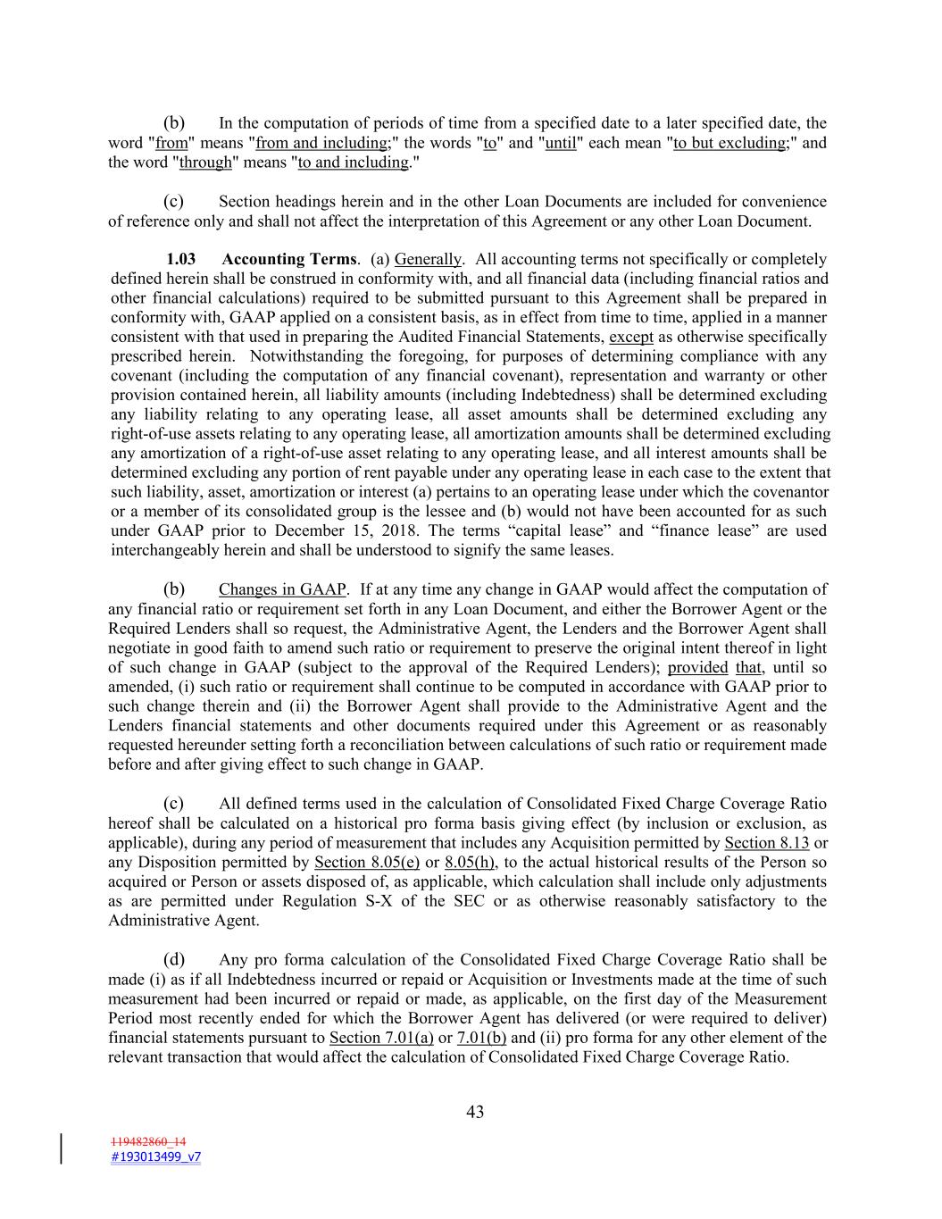 (b) In the computation of periods of time from a specified date to a later specified date, the word "from" means "from and including;" the words "to" and "until" each mean "to but excluding;" and the word "through" means "to and including." (c) Section headings herein and in the other Loan Documents are included for convenience of reference only and shall not affect the interpretation of this Agreement or any other Loan Document. 1.03 Accounting Terms. (a) Generally. All accounting terms not specifically or completely defined herein shall be construed in conformity with, and all financial data (including financial ratios and other financial calculations) required to be submitted pursuant to this Agreement shall be prepared in conformity with, GAAP applied on a consistent basis, as in effect from time to time, applied in a manner consistent with that used in preparing the Audited Financial Statements, except as otherwise specifically prescribed herein. Notwithstanding the foregoing, for purposes of determining compliance with any covenant (including the computation of any financial covenant), representation and warranty or other provision contained herein, all liability amounts (including Indebtedness) shall be determined excluding any liability relating to any operating lease, all asset amounts shall be determined excluding any right-of-use assets relating to any operating lease, all amortization amounts shall be determined excluding any amortization of a right-of-use asset relating to any operating lease, and all interest amounts shall be determined excluding any portion of rent payable under any operating lease in each case to the extent that such liability, asset, amortization or interest (a) pertains to an operating lease under which the covenantor or a member of its consolidated group is the lessee and (b) would not have been accounted for as such under GAAP prior to December 15, 2018. The terms “capital lease” and “finance lease” are used interchangeably herein and shall be understood to signify the same leases. (b) Changes in GAAP. If at any time any change in GAAP would affect the computation of any financial ratio or requirement set forth in any Loan Document, and either the Borrower Agent or the Required Lenders shall so request, the Administrative Agent, the Lenders and the Borrower Agent shall negotiate in good faith to amend such ratio or requirement to preserve the original intent thereof in light of such change in GAAP (subject to the approval of the Required Lenders); provided that, until so amended, (i) such ratio or requirement shall continue to be computed in accordance with GAAP prior to such change therein and (ii) the Borrower Agent shall provide to the Administrative Agent and the Lenders financial statements and other documents required under this Agreement or as reasonably requested hereunder setting forth a reconciliation between calculations of such ratio or requirement made before and after giving effect to such change in GAAP. (c) All defined terms used in the calculation of Consolidated Fixed Charge Coverage Ratio hereof shall be calculated on a historical pro forma basis giving effect (by inclusion or exclusion, as applicable), during any period of measurement that includes any Acquisition permitted by Section 8.13 or any Disposition permitted by Section 8.05(e) or 8.05(h), to the actual historical results of the Person so acquired or Person or assets disposed of, as applicable, which calculation shall include only adjustments as are permitted under Regulation S-X of the SEC or as otherwise reasonably satisfactory to the Administrative Agent. (d) Any pro forma calculation of the Consolidated Fixed Charge Coverage Ratio shall be made (i) as if all Indebtedness incurred or repaid or Acquisition or Investments made at the time of such measurement had been incurred or repaid or made, as applicable, on the first day of the Measurement Period most recently ended for which the Borrower Agent has delivered (or were required to deliver) financial statements pursuant to Section 7.01(a) or 7.01(b) and (ii) pro forma for any other element of the relevant transaction that would affect the calculation of Consolidated Fixed Charge Coverage Ratio. 43 119482860_14 #193013499_v7