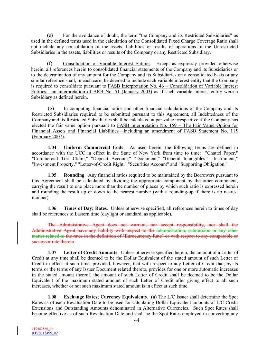(e) For the avoidance of doubt, the term "the Company and its Restricted Subsidiaries" as used in the defined terms used in the calculation of the Consolidated Fixed Charge Coverage Ratio shall not include any consolidation of the assets, liabilities or results of operations of the Unrestricted Subsidiaries in the assets, liabilities or results of the Company or any Restricted Subsidiary. (f) Consolidation of Variable Interest Entities. Except as expressly provided otherwise herein, all references herein to consolidated financial statements of the Company and its Subsidiaries or to the determination of any amount for the Company and its Subsidiaries on a consolidated basis or any similar reference shall, in each case, be deemed to include each variable interest entity that the Company is required to consolidate pursuant to FASB Interpretation No. 46 – Consolidation of Variable Interest Entities: an interpretation of ARB No. 51 (January 2003) as if such variable interest entity were a Subsidiary as defined herein. (g) In computing financial ratios and other financial calculations of the Company and its Restricted Subsidiaries required to be submitted pursuant to this Agreement, all Indebtedness of the Company and its Restricted Subsidiaries shall be calculated at par value irrespective if the Company has elected the fair value option pursuant to FASB Interpretation No. 159 – The Fair Value Option for Financial Assets and Financial Liabilities—Including an amendment of FASB Statement No. 115 (February 2007). 1.04 Uniform Commercial Code. As used herein, the following terms are defined in accordance with the UCC in effect in the State of New York from time to time: "Chattel Paper," "Commercial Tort Claim," "Deposit Account," "Document," "General Intangibles," "Instrument," "Investment Property," "Letter-of-Credit Right," "Securities Account" and "Supporting Obligation." 1.05 Rounding. Any financial ratios required to be maintained by the Borrowers pursuant to this Agreement shall be calculated by dividing the appropriate component by the other component, carrying the result to one place more than the number of places by which such ratio is expressed herein and rounding the result up or down to the nearest number (with a rounding-up if there is no nearest number). 1.06 Times of Day; Rates. Unless otherwise specified, all references herein to times of day shall be references to Eastern time (daylight or standard, as applicable). The Administrative Agent does not warrant, nor accept responsibility, nor shall the Administrative Agent have any liability with respect to the administration, submission or any other matter related to the rates in the definition of "Eurocurrency Rate" or with respect to any comparable or successor rate thereto. 1.07 Letter of Credit Amounts. Unless otherwise specified herein, the amount of a Letter of Credit at any time shall be deemed to be the Dollar Equivalent of the stated amount of such Letter of Credit in effect at such time; provided, however, that with respect to any Letter of Credit that, by its terms or the terms of any Issuer Document related thereto, provides for one or more automatic increases in the stated amount thereof, the amount of such Letter of Credit shall be deemed to be the Dollar Equivalent of the maximum stated amount of such Letter of Credit after giving effect to all such increases, whether or not such maximum stated amount is in effect at such time. 1.08 Exchange Rates; Currency Equivalents. (a) The L/C Issuer shall determine the Spot Rates as of each Revaluation Date to be used for calculating Dollar Equivalent amounts of L/C Credit Extensions and Outstanding Amounts denominated in Alternative Currencies. Such Spot Rates shall become effective as of such Revaluation Date and shall be the Spot Rates employed in converting any 44 119482860_14 #193013499_v7