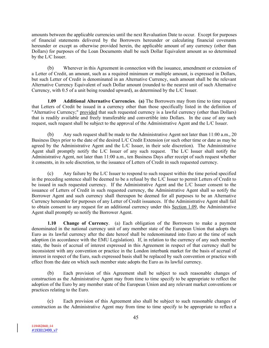 amounts between the applicable currencies until the next Revaluation Date to occur. Except for purposes of financial statements delivered by the Borrowers hereunder or calculating financial covenants hereunder or except as otherwise provided herein, the applicable amount of any currency (other than Dollars) for purposes of the Loan Documents shall be such Dollar Equivalent amount as so determined by the L/C Issuer. (b) Wherever in this Agreement in connection with the issuance, amendment or extension of a Letter of Credit, an amount, such as a required minimum or multiple amount, is expressed in Dollars, but such Letter of Credit is denominated in an Alternative Currency, such amount shall be the relevant Alternative Currency Equivalent of such Dollar amount (rounded to the nearest unit of such Alternative Currency, with 0.5 of a unit being rounded upward), as determined by the L/C Issuer. 1.09 Additional Alternative Currencies. (a) The Borrowers may from time to time request that Letters of Credit be issued in a currency other than those specifically listed in the definition of "Alternative Currency;" provided that such requested currency is a lawful currency (other than Dollars) that is readily available and freely transferable and convertible into Dollars. In the case of any such request, such request shall be subject to the approval of the Administrative Agent and the L/C Issuer. (b) Any such request shall be made to the Administrative Agent not later than 11:00 a.m., 20 Business Days prior to the date of the desired L/C Credit Extension (or such other time or date as may be agreed by the Administrative Agent and the L/C Issuer, in their sole discretion). The Administrative Agent shall promptly notify the L/C Issuer of any such request. The L/C Issuer shall notify the Administrative Agent, not later than 11:00 a.m., ten Business Days after receipt of such request whether it consents, in its sole discretion, to the issuance of Letters of Credit in such requested currency. (c) Any failure by the L/C Issuer to respond to such request within the time period specified in the preceding sentence shall be deemed to be a refusal by the L/C Issuer to permit Letters of Credit to be issued in such requested currency. If the Administrative Agent and the L/C Issuer consent to the issuance of Letters of Credit in such requested currency, the Administrative Agent shall so notify the Borrower Agent and such currency shall thereupon be deemed for all purposes to be an Alternative Currency hereunder for purposes of any Letter of Credit issuances. If the Administrative Agent shall fail to obtain consent to any request for an additional currency under this Section 1.09, the Administrative Agent shall promptly so notify the Borrower Agent. 1.10 Change of Currency. (a) Each obligation of the Borrowers to make a payment denominated in the national currency unit of any member state of the European Union that adopts the Euro as its lawful currency after the date hereof shall be redenominated into Euro at the time of such adoption (in accordance with the EMU Legislation). If, in relation to the currency of any such member state, the basis of accrual of interest expressed in this Agreement in respect of that currency shall be inconsistent with any convention or practice in the London interbank market for the basis of accrual of interest in respect of the Euro, such expressed basis shall be replaced by such convention or practice with effect from the date on which such member state adopts the Euro as its lawful currency. (b) Each provision of this Agreement shall be subject to such reasonable changes of construction as the Administrative Agent may from time to time specify to be appropriate to reflect the adoption of the Euro by any member state of the European Union and any relevant market conventions or practices relating to the Euro. (c) Each provision of this Agreement also shall be subject to such reasonable changes of construction as the Administrative Agent may from time to time specify to be appropriate to reflect a 45 119482860_14 #193013499_v7