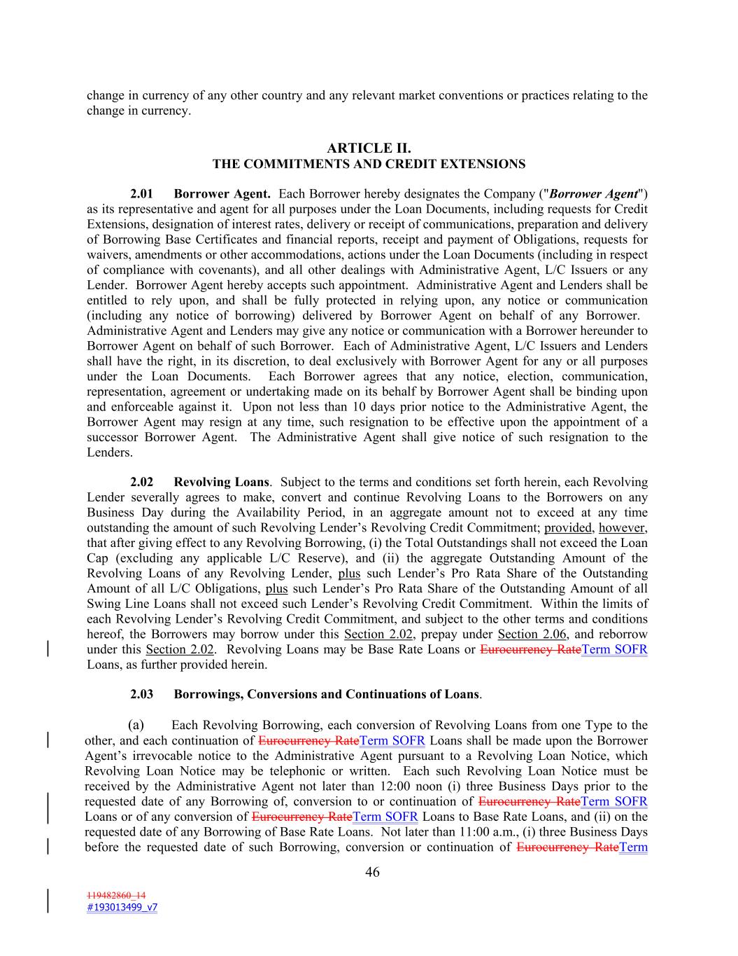 change in currency of any other country and any relevant market conventions or practices relating to the change in currency. ARTICLE II. THE COMMITMENTS AND CREDIT EXTENSIONS 2.01 Borrower Agent. Each Borrower hereby designates the Company ("Borrower Agent") as its representative and agent for all purposes under the Loan Documents, including requests for Credit Extensions, designation of interest rates, delivery or receipt of communications, preparation and delivery of Borrowing Base Certificates and financial reports, receipt and payment of Obligations, requests for waivers, amendments or other accommodations, actions under the Loan Documents (including in respect of compliance with covenants), and all other dealings with Administrative Agent, L/C Issuers or any Lender. Borrower Agent hereby accepts such appointment. Administrative Agent and Lenders shall be entitled to rely upon, and shall be fully protected in relying upon, any notice or communication (including any notice of borrowing) delivered by Borrower Agent on behalf of any Borrower. Administrative Agent and Lenders may give any notice or communication with a Borrower hereunder to Borrower Agent on behalf of such Borrower. Each of Administrative Agent, L/C Issuers and Lenders shall have the right, in its discretion, to deal exclusively with Borrower Agent for any or all purposes under the Loan Documents. Each Borrower agrees that any notice, election, communication, representation, agreement or undertaking made on its behalf by Borrower Agent shall be binding upon and enforceable against it. Upon not less than 10 days prior notice to the Administrative Agent, the Borrower Agent may resign at any time, such resignation to be effective upon the appointment of a successor Borrower Agent. The Administrative Agent shall give notice of such resignation to the Lenders. 2.02 Revolving Loans. Subject to the terms and conditions set forth herein, each Revolving Lender severally agrees to make, convert and continue Revolving Loans to the Borrowers on any Business Day during the Availability Period, in an aggregate amount not to exceed at any time outstanding the amount of such Revolving Lender’s Revolving Credit Commitment; provided, however, that after giving effect to any Revolving Borrowing, (i) the Total Outstandings shall not exceed the Loan Cap (excluding any applicable L/C Reserve), and (ii) the aggregate Outstanding Amount of the Revolving Loans of any Revolving Lender, plus such Lender’s Pro Rata Share of the Outstanding Amount of all L/C Obligations, plus such Lender’s Pro Rata Share of the Outstanding Amount of all Swing Line Loans shall not exceed such Lender’s Revolving Credit Commitment. Within the limits of each Revolving Lender’s Revolving Credit Commitment, and subject to the other terms and conditions hereof, the Borrowers may borrow under this Section 2.02, prepay under Section 2.06, and reborrow under this Section 2.02. Revolving Loans may be Base Rate Loans or Eurocurrency RateTerm SOFR Loans, as further provided herein. 2.03 Borrowings, Conversions and Continuations of Loans. (a) Each Revolving Borrowing, each conversion of Revolving Loans from one Type to the other, and each continuation of Eurocurrency RateTerm SOFR Loans shall be made upon the Borrower Agent’s irrevocable notice to the Administrative Agent pursuant to a Revolving Loan Notice, which Revolving Loan Notice may be telephonic or written. Each such Revolving Loan Notice must be received by the Administrative Agent not later than 12:00 noon (i) three Business Days prior to the requested date of any Borrowing of, conversion to or continuation of Eurocurrency RateTerm SOFR Loans or of any conversion of Eurocurrency RateTerm SOFR Loans to Base Rate Loans, and (ii) on the requested date of any Borrowing of Base Rate Loans. Not later than 11:00 a.m., (i) three Business Days before the requested date of such Borrowing, conversion or continuation of Eurocurrency RateTerm 46 119482860_14 #193013499_v7