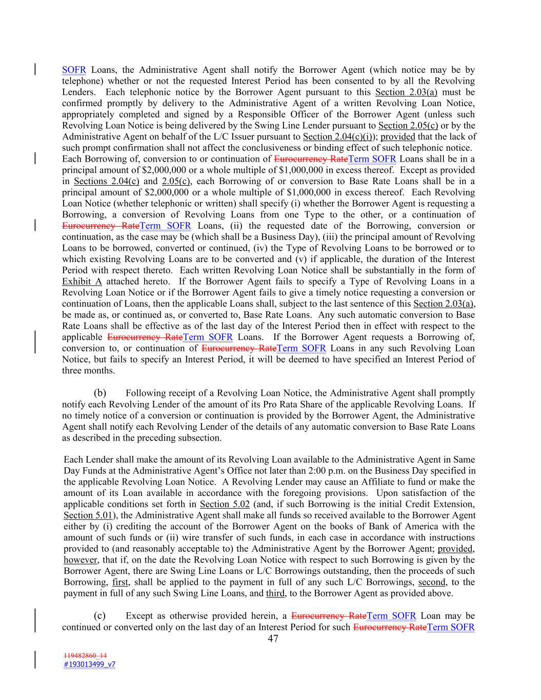 SOFR Loans, the Administrative Agent shall notify the Borrower Agent (which notice may be by telephone) whether or not the requested Interest Period has been consented to by all the Revolving Lenders. Each telephonic notice by the Borrower Agent pursuant to this Section 2.03(a) must be confirmed promptly by delivery to the Administrative Agent of a written Revolving Loan Notice, appropriately completed and signed by a Responsible Officer of the Borrower Agent (unless such Revolving Loan Notice is being delivered by the Swing Line Lender pursuant to Section 2.05(c) or by the Administrative Agent on behalf of the L/C Issuer pursuant to Section 2.04(c)(i)); provided that the lack of such prompt confirmation shall not affect the conclusiveness or binding effect of such telephonic notice. Each Borrowing of, conversion to or continuation of Eurocurrency RateTerm SOFR Loans shall be in a principal amount of $2,000,000 or a whole multiple of $1,000,000 in excess thereof. Except as provided in Sections 2.04(c) and 2.05(c), each Borrowing of or conversion to Base Rate Loans shall be in a principal amount of $2,000,000 or a whole multiple of $1,000,000 in excess thereof. Each Revolving Loan Notice (whether telephonic or written) shall specify (i) whether the Borrower Agent is requesting a Borrowing, a conversion of Revolving Loans from one Type to the other, or a continuation of Eurocurrency RateTerm SOFR Loans, (ii) the requested date of the Borrowing, conversion or continuation, as the case may be (which shall be a Business Day), (iii) the principal amount of Revolving Loans to be borrowed, converted or continued, (iv) the Type of Revolving Loans to be borrowed or to which existing Revolving Loans are to be converted and (v) if applicable, the duration of the Interest Period with respect thereto. Each written Revolving Loan Notice shall be substantially in the form of Exhibit A attached hereto. If the Borrower Agent fails to specify a Type of Revolving Loans in a Revolving Loan Notice or if the Borrower Agent fails to give a timely notice requesting a conversion or continuation of Loans, then the applicable Loans shall, subject to the last sentence of this Section 2.03(a), be made as, or continued as, or converted to, Base Rate Loans. Any such automatic conversion to Base Rate Loans shall be effective as of the last day of the Interest Period then in effect with respect to the applicable Eurocurrency RateTerm SOFR Loans. If the Borrower Agent requests a Borrowing of, conversion to, or continuation of Eurocurrency RateTerm SOFR Loans in any such Revolving Loan Notice, but fails to specify an Interest Period, it will be deemed to have specified an Interest Period of three months. (b) Following receipt of a Revolving Loan Notice, the Administrative Agent shall promptly notify each Revolving Lender of the amount of its Pro Rata Share of the applicable Revolving Loans. If no timely notice of a conversion or continuation is provided by the Borrower Agent, the Administrative Agent shall notify each Revolving Lender of the details of any automatic conversion to Base Rate Loans as described in the preceding subsection. Each Lender shall make the amount of its Revolving Loan available to the Administrative Agent in Same Day Funds at the Administrative Agent’s Office not later than 2:00 p.m. on the Business Day specified in the applicable Revolving Loan Notice. A Revolving Lender may cause an Affiliate to fund or make the amount of its Loan available in accordance with the foregoing provisions. Upon satisfaction of the applicable conditions set forth in Section 5.02 (and, if such Borrowing is the initial Credit Extension, Section 5.01), the Administrative Agent shall make all funds so received available to the Borrower Agent either by (i) crediting the account of the Borrower Agent on the books of Bank of America with the amount of such funds or (ii) wire transfer of such funds, in each case in accordance with instructions provided to (and reasonably acceptable to) the Administrative Agent by the Borrower Agent; provided, however, that if, on the date the Revolving Loan Notice with respect to such Borrowing is given by the Borrower Agent, there are Swing Line Loans or L/C Borrowings outstanding, then the proceeds of such Borrowing, first, shall be applied to the payment in full of any such L/C Borrowings, second, to the payment in full of any such Swing Line Loans, and third, to the Borrower Agent as provided above. (c) Except as otherwise provided herein, a Eurocurrency RateTerm SOFR Loan may be continued or converted only on the last day of an Interest Period for such Eurocurrency RateTerm SOFR 47 119482860_14 #193013499_v7
