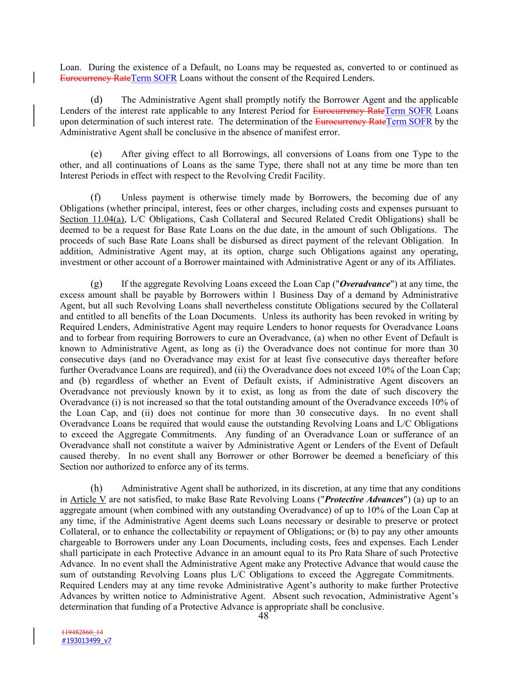 Loan. During the existence of a Default, no Loans may be requested as, converted to or continued as Eurocurrency RateTerm SOFR Loans without the consent of the Required Lenders. (d) The Administrative Agent shall promptly notify the Borrower Agent and the applicable Lenders of the interest rate applicable to any Interest Period for Eurocurrency RateTerm SOFR Loans upon determination of such interest rate. The determination of the Eurocurrency RateTerm SOFR by the Administrative Agent shall be conclusive in the absence of manifest error. (e) After giving effect to all Borrowings, all conversions of Loans from one Type to the other, and all continuations of Loans as the same Type, there shall not at any time be more than ten Interest Periods in effect with respect to the Revolving Credit Facility. (f) Unless payment is otherwise timely made by Borrowers, the becoming due of any Obligations (whether principal, interest, fees or other charges, including costs and expenses pursuant to Section 11.04(a), L/C Obligations, Cash Collateral and Secured Related Credit Obligations) shall be deemed to be a request for Base Rate Loans on the due date, in the amount of such Obligations. The proceeds of such Base Rate Loans shall be disbursed as direct payment of the relevant Obligation. In addition, Administrative Agent may, at its option, charge such Obligations against any operating, investment or other account of a Borrower maintained with Administrative Agent or any of its Affiliates. (g) If the aggregate Revolving Loans exceed the Loan Cap ("Overadvance") at any time, the excess amount shall be payable by Borrowers within 1 Business Day of a demand by Administrative Agent, but all such Revolving Loans shall nevertheless constitute Obligations secured by the Collateral and entitled to all benefits of the Loan Documents. Unless its authority has been revoked in writing by Required Lenders, Administrative Agent may require Lenders to honor requests for Overadvance Loans and to forbear from requiring Borrowers to cure an Overadvance, (a) when no other Event of Default is known to Administrative Agent, as long as (i) the Overadvance does not continue for more than 30 consecutive days (and no Overadvance may exist for at least five consecutive days thereafter before further Overadvance Loans are required), and (ii) the Overadvance does not exceed 10% of the Loan Cap; and (b) regardless of whether an Event of Default exists, if Administrative Agent discovers an Overadvance not previously known by it to exist, as long as from the date of such discovery the Overadvance (i) is not increased so that the total outstanding amount of the Overadvance exceeds 10% of the Loan Cap, and (ii) does not continue for more than 30 consecutive days. In no event shall Overadvance Loans be required that would cause the outstanding Revolving Loans and L/C Obligations to exceed the Aggregate Commitments. Any funding of an Overadvance Loan or sufferance of an Overadvance shall not constitute a waiver by Administrative Agent or Lenders of the Event of Default caused thereby. In no event shall any Borrower or other Borrower be deemed a beneficiary of this Section nor authorized to enforce any of its terms. (h) Administrative Agent shall be authorized, in its discretion, at any time that any conditions in Article V are not satisfied, to make Base Rate Revolving Loans ("Protective Advances") (a) up to an aggregate amount (when combined with any outstanding Overadvance) of up to 10% of the Loan Cap at any time, if the Administrative Agent deems such Loans necessary or desirable to preserve or protect Collateral, or to enhance the collectability or repayment of Obligations; or (b) to pay any other amounts chargeable to Borrowers under any Loan Documents, including costs, fees and expenses. Each Lender shall participate in each Protective Advance in an amount equal to its Pro Rata Share of such Protective Advance. In no event shall the Administrative Agent make any Protective Advance that would cause the sum of outstanding Revolving Loans plus L/C Obligations to exceed the Aggregate Commitments. Required Lenders may at any time revoke Administrative Agent’s authority to make further Protective Advances by written notice to Administrative Agent. Absent such revocation, Administrative Agent’s determination that funding of a Protective Advance is appropriate shall be conclusive. 48 119482860_14 #193013499_v7