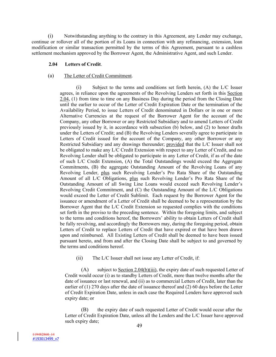 (i) Notwithstanding anything to the contrary in this Agreement, any Lender may exchange, continue or rollover all of the portion of its Loans in connection with any refinancing, extension, loan modification or similar transaction permitted by the terms of this Agreement, pursuant to a cashless settlement mechanism approved by the Borrower Agent, the Administrative Agent, and such Lender. 2.04 Letters of Credit. (a) The Letter of Credit Commitment. (i) Subject to the terms and conditions set forth herein, (A) the L/C Issuer agrees, in reliance upon the agreements of the Revolving Lenders set forth in this Section 2.04, (1) from time to time on any Business Day during the period from the Closing Date until the earlier to occur of the Letter of Credit Expiration Date or the termination of the Availability Period, to issue Letters of Credit denominated in Dollars or in one or more Alternative Currencies at the request of the Borrower Agent for the account of the Company, any other Borrower or any Restricted Subsidiary and to amend Letters of Credit previously issued by it, in accordance with subsection (b) below, and (2) to honor drafts under the Letters of Credit; and (B) the Revolving Lenders severally agree to participate in Letters of Credit issued for the account of the Company, any other Borrower or any Restricted Subsidiary and any drawings thereunder; provided that the L/C Issuer shall not be obligated to make any L/C Credit Extension with respect to any Letter of Credit, and no Revolving Lender shall be obligated to participate in any Letter of Credit, if as of the date of such L/C Credit Extension, (A) the Total Outstandings would exceed the Aggregate Commitments, (B) the aggregate Outstanding Amount of the Revolving Loans of any Revolving Lender, plus such Revolving Lender’s Pro Rata Share of the Outstanding Amount of all L/C Obligations, plus such Revolving Lender’s Pro Rata Share of the Outstanding Amount of all Swing Line Loans would exceed such Revolving Lender’s Revolving Credit Commitment, and (C) the Outstanding Amount of the L/C Obligations would exceed the Letter of Credit Sublimit. Each request by the Borrower Agent for the issuance or amendment of a Letter of Credit shall be deemed to be a representation by the Borrower Agent that the L/C Credit Extension so requested complies with the conditions set forth in the proviso to the preceding sentence. Within the foregoing limits, and subject to the terms and conditions hereof, the Borrowers’ ability to obtain Letters of Credit shall be fully revolving, and accordingly the Borrowers may, during the foregoing period, obtain Letters of Credit to replace Letters of Credit that have expired or that have been drawn upon and reimbursed. All Existing Letters of Credit shall be deemed to have been issued pursuant hereto, and from and after the Closing Date shall be subject to and governed by the terms and conditions hereof. (ii) The L/C Issuer shall not issue any Letter of Credit, if: (A) subject to Section 2.04(b)(iii), the expiry date of such requested Letter of Credit would occur (i) as to standby Letters of Credit, more than twelve months after the date of issuance or last renewal, and (ii) as to commercial Letters of Credit, later than the earlier of (1) 270 days after the date of issuance thereof and (2) 60 days before the Letter of Credit Expiration Date, unless in each case the Required Lenders have approved such expiry date; or (B) the expiry date of such requested Letter of Credit would occur after the Letter of Credit Expiration Date, unless all the Lenders and the L/C Issuer have approved such expiry date; 49 119482860_14 #193013499_v7