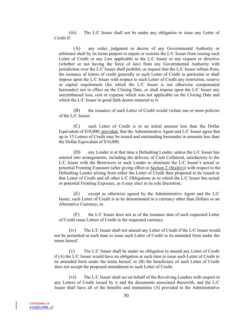 (iii) The L/C Issuer shall not be under any obligation to issue any Letter of Credit if: (A) any order, judgment or decree of any Governmental Authority or arbitrator shall by its terms purport to enjoin or restrain the L/C Issuer from issuing such Letter of Credit or any Law applicable to the L/C Issuer or any request or directive (whether or not having the force of law) from any Governmental Authority with jurisdiction over the L/C Issuer shall prohibit, or request that the L/C Issuer refrain from, the issuance of letters of credit generally or such Letter of Credit in particular or shall impose upon the L/C Issuer with respect to such Letter of Credit any restriction, reserve or capital requirement (for which the L/C Issuer is not otherwise compensated hereunder) not in effect on the Closing Date, or shall impose upon the L/C Issuer any unreimbursed loss, cost or expense which was not applicable on the Closing Date and which the L/C Issuer in good faith deems material to it; (B) the issuance of such Letter of Credit would violate one or more policies of the L/C Issuer; (C) such Letter of Credit is in an initial amount less than the Dollar Equivalent of $10,000; provided, that the Administrative Agent and L/C Issuer agree that up to 15 Letters of Credit may be issued and outstanding hereunder in amounts less than the Dollar Equivalent of $10,000; (D) any Lender is at that time a Defaulting Lender, unless the L/C Issuer has entered into arrangements, including the delivery of Cash Collateral, satisfactory to the L/C Issuer with the Borrowers or such Lender to eliminate the L/C Issuer’s actual or potential Fronting Exposure (after giving effect to Section 2.18(a)(iv)) with respect to the Defaulting Lender arising from either the Letter of Credit then proposed to be issued or that Letter of Credit and all other L/C Obligations as to which the L/C Issuer has actual or potential Fronting Exposure, as it may elect in its sole discretion; (E) except as otherwise agreed by the Administrative Agent and the L/C Issuer, such Letter of Credit is to be denominated in a currency other than Dollars or an Alternative Currency; or (F) the L/C Issuer does not as of the issuance date of such requested Letter of Credit issue Letters of Credit in the requested currency. (iv) The L/C Issuer shall not amend any Letter of Credit if the L/C Issuer would not be permitted at such time to issue such Letter of Credit in its amended form under the terms hereof. (v) The L/C Issuer shall be under no obligation to amend any Letter of Credit if (A) the L/C Issuer would have no obligation at such time to issue such Letter of Credit in its amended form under the terms hereof, or (B) the beneficiary of such Letter of Credit does not accept the proposed amendment to such Letter of Credit. (vi) The L/C Issuer shall act on behalf of the Revolving Lenders with respect to any Letters of Credit issued by it and the documents associated therewith, and the L/C Issuer shall have all of the benefits and immunities (A) provided to the Administrative 50 119482860_14 #193013499_v7