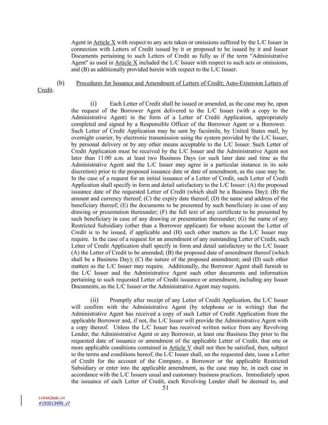 Agent in Article X with respect to any acts taken or omissions suffered by the L/C Issuer in connection with Letters of Credit issued by it or proposed to be issued by it and Issuer Documents pertaining to such Letters of Credit as fully as if the term "Administrative Agent" as used in Article X included the L/C Issuer with respect to such acts or omissions, and (B) as additionally provided herein with respect to the L/C Issuer. (b) Procedures for Issuance and Amendment of Letters of Credit; Auto-Extension Letters of Credit. (i) Each Letter of Credit shall be issued or amended, as the case may be, upon the request of the Borrower Agent delivered to the L/C Issuer (with a copy to the Administrative Agent) in the form of a Letter of Credit Application, appropriately completed and signed by a Responsible Officer of the Borrower Agent or a Borrower. Such Letter of Credit Application may be sent by facsimile, by United States mail, by overnight courier, by electronic transmission using the system provided by the L/C Issuer, by personal delivery or by any other means acceptable to the L/C Issuer. Such Letter of Credit Application must be received by the L/C Issuer and the Administrative Agent not later than 11:00 a.m. at least two Business Days (or such later date and time as the Administrative Agent and the L/C Issuer may agree in a particular instance in its sole discretion) prior to the proposed issuance date or date of amendment, as the case may be. In the case of a request for an initial issuance of a Letter of Credit, such Letter of Credit Application shall specify in form and detail satisfactory to the L/C Issuer: (A) the proposed issuance date of the requested Letter of Credit (which shall be a Business Day); (B) the amount and currency thereof; (C) the expiry date thereof; (D) the name and address of the beneficiary thereof; (E) the documents to be presented by such beneficiary in case of any drawing or presentation thereunder; (F) the full text of any certificate to be presented by such beneficiary in case of any drawing or presentation thereunder; (G) the name of any Restricted Subsidiary (other than a Borrower applicant) for whose account the Letter of Credit is to be issued, if applicable and (H) such other matters as the L/C Issuer may require. In the case of a request for an amendment of any outstanding Letter of Credit, such Letter of Credit Application shall specify in form and detail satisfactory to the L/C Issuer (A) the Letter of Credit to be amended; (B) the proposed date of amendment thereof (which shall be a Business Day); (C) the nature of the proposed amendment; and (D) such other matters as the L/C Issuer may require. Additionally, the Borrower Agent shall furnish to the L/C Issuer and the Administrative Agent such other documents and information pertaining to such requested Letter of Credit issuance or amendment, including any Issuer Documents, as the L/C Issuer or the Administrative Agent may require. (ii) Promptly after receipt of any Letter of Credit Application, the L/C Issuer will confirm with the Administrative Agent (by telephone or in writing) that the Administrative Agent has received a copy of such Letter of Credit Application from the applicable Borrower and, if not, the L/C Issuer will provide the Administrative Agent with a copy thereof. Unless the L/C Issuer has received written notice from any Revolving Lender, the Administrative Agent or any Borrower, at least one Business Day prior to the requested date of issuance or amendment of the applicable Letter of Credit, that one or more applicable conditions contained in Article V shall not then be satisfied, then, subject to the terms and conditions hereof, the L/C Issuer shall, on the requested date, issue a Letter of Credit for the account of the Company, a Borrower or the applicable Restricted Subsidiary or enter into the applicable amendment, as the case may be, in each case in accordance with the L/C Issuers usual and customary business practices. Immediately upon the issuance of each Letter of Credit, each Revolving Lender shall be deemed to, and 51 119482860_14 #193013499_v7