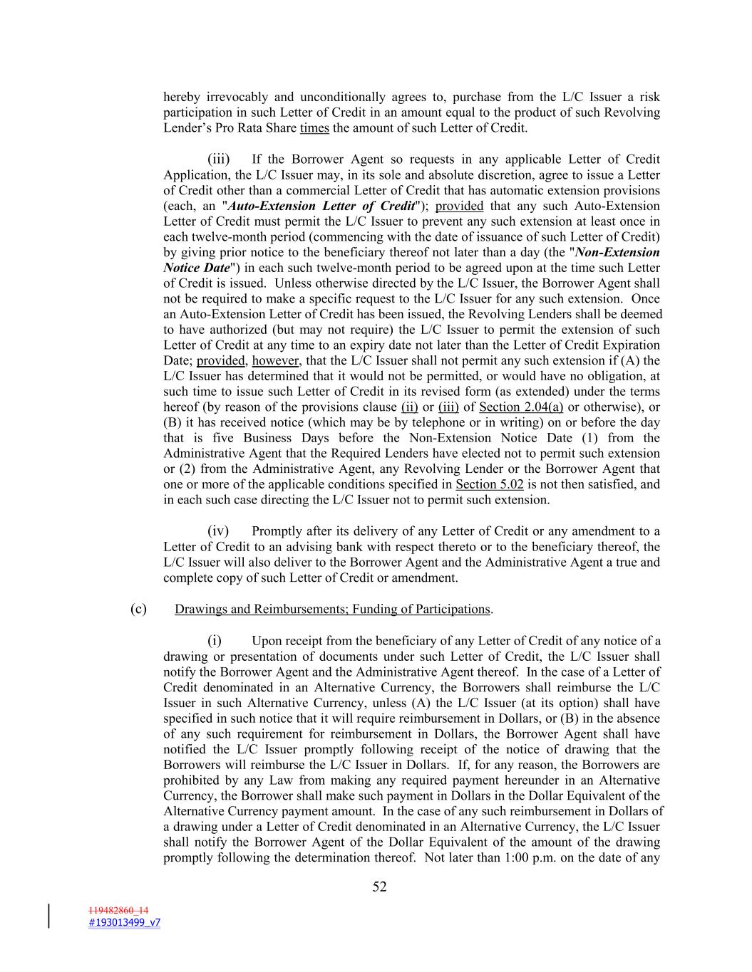 hereby irrevocably and unconditionally agrees to, purchase from the L/C Issuer a risk participation in such Letter of Credit in an amount equal to the product of such Revolving Lender’s Pro Rata Share times the amount of such Letter of Credit. (iii) If the Borrower Agent so requests in any applicable Letter of Credit Application, the L/C Issuer may, in its sole and absolute discretion, agree to issue a Letter of Credit other than a commercial Letter of Credit that has automatic extension provisions (each, an "Auto-Extension Letter of Credit"); provided that any such Auto-Extension Letter of Credit must permit the L/C Issuer to prevent any such extension at least once in each twelve-month period (commencing with the date of issuance of such Letter of Credit) by giving prior notice to the beneficiary thereof not later than a day (the "Non-Extension Notice Date") in each such twelve-month period to be agreed upon at the time such Letter of Credit is issued. Unless otherwise directed by the L/C Issuer, the Borrower Agent shall not be required to make a specific request to the L/C Issuer for any such extension. Once an Auto-Extension Letter of Credit has been issued, the Revolving Lenders shall be deemed to have authorized (but may not require) the L/C Issuer to permit the extension of such Letter of Credit at any time to an expiry date not later than the Letter of Credit Expiration Date; provided, however, that the L/C Issuer shall not permit any such extension if (A) the L/C Issuer has determined that it would not be permitted, or would have no obligation, at such time to issue such Letter of Credit in its revised form (as extended) under the terms hereof (by reason of the provisions clause (ii) or (iii) of Section 2.04(a) or otherwise), or (B) it has received notice (which may be by telephone or in writing) on or before the day that is five Business Days before the Non-Extension Notice Date (1) from the Administrative Agent that the Required Lenders have elected not to permit such extension or (2) from the Administrative Agent, any Revolving Lender or the Borrower Agent that one or more of the applicable conditions specified in Section 5.02 is not then satisfied, and in each such case directing the L/C Issuer not to permit such extension. (iv) Promptly after its delivery of any Letter of Credit or any amendment to a Letter of Credit to an advising bank with respect thereto or to the beneficiary thereof, the L/C Issuer will also deliver to the Borrower Agent and the Administrative Agent a true and complete copy of such Letter of Credit or amendment. (c) Drawings and Reimbursements; Funding of Participations. (i) Upon receipt from the beneficiary of any Letter of Credit of any notice of a drawing or presentation of documents under such Letter of Credit, the L/C Issuer shall notify the Borrower Agent and the Administrative Agent thereof. In the case of a Letter of Credit denominated in an Alternative Currency, the Borrowers shall reimburse the L/C Issuer in such Alternative Currency, unless (A) the L/C Issuer (at its option) shall have specified in such notice that it will require reimbursement in Dollars, or (B) in the absence of any such requirement for reimbursement in Dollars, the Borrower Agent shall have notified the L/C Issuer promptly following receipt of the notice of drawing that the Borrowers will reimburse the L/C Issuer in Dollars. If, for any reason, the Borrowers are prohibited by any Law from making any required payment hereunder in an Alternative Currency, the Borrower shall make such payment in Dollars in the Dollar Equivalent of the Alternative Currency payment amount. In the case of any such reimbursement in Dollars of a drawing under a Letter of Credit denominated in an Alternative Currency, the L/C Issuer shall notify the Borrower Agent of the Dollar Equivalent of the amount of the drawing promptly following the determination thereof. Not later than 1:00 p.m. on the date of any 52 119482860_14 #193013499_v7