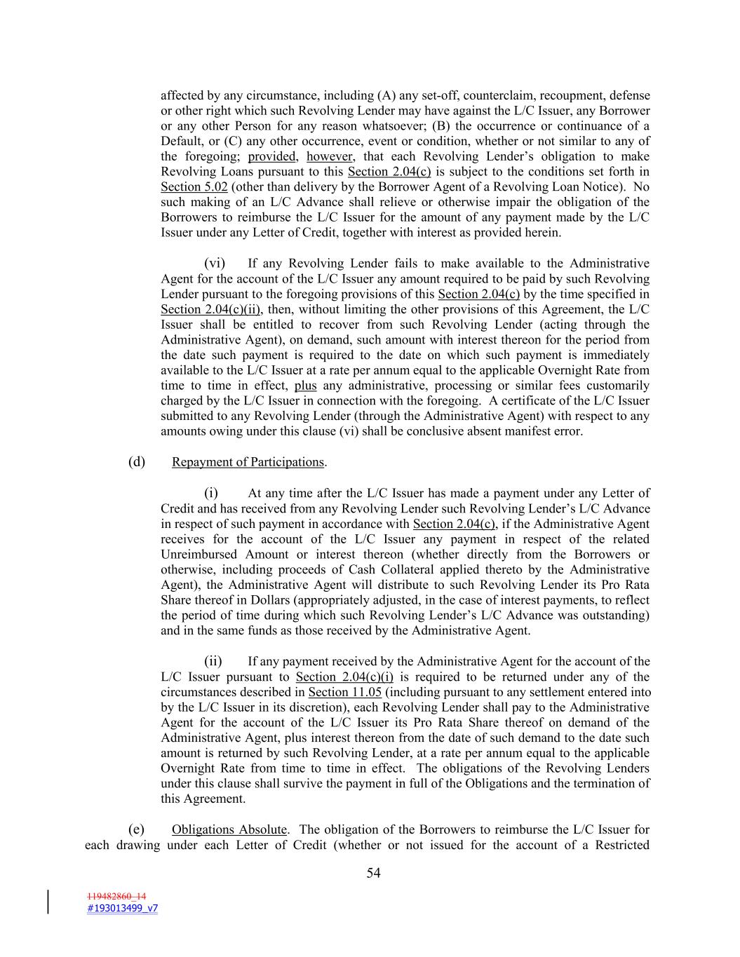 affected by any circumstance, including (A) any set-off, counterclaim, recoupment, defense or other right which such Revolving Lender may have against the L/C Issuer, any Borrower or any other Person for any reason whatsoever; (B) the occurrence or continuance of a Default, or (C) any other occurrence, event or condition, whether or not similar to any of the foregoing; provided, however, that each Revolving Lender’s obligation to make Revolving Loans pursuant to this Section 2.04(c) is subject to the conditions set forth in Section 5.02 (other than delivery by the Borrower Agent of a Revolving Loan Notice). No such making of an L/C Advance shall relieve or otherwise impair the obligation of the Borrowers to reimburse the L/C Issuer for the amount of any payment made by the L/C Issuer under any Letter of Credit, together with interest as provided herein. (vi) If any Revolving Lender fails to make available to the Administrative Agent for the account of the L/C Issuer any amount required to be paid by such Revolving Lender pursuant to the foregoing provisions of this Section 2.04(c) by the time specified in Section 2.04(c)(ii), then, without limiting the other provisions of this Agreement, the L/C Issuer shall be entitled to recover from such Revolving Lender (acting through the Administrative Agent), on demand, such amount with interest thereon for the period from the date such payment is required to the date on which such payment is immediately available to the L/C Issuer at a rate per annum equal to the applicable Overnight Rate from time to time in effect, plus any administrative, processing or similar fees customarily charged by the L/C Issuer in connection with the foregoing. A certificate of the L/C Issuer submitted to any Revolving Lender (through the Administrative Agent) with respect to any amounts owing under this clause (vi) shall be conclusive absent manifest error. (d) Repayment of Participations. (i) At any time after the L/C Issuer has made a payment under any Letter of Credit and has received from any Revolving Lender such Revolving Lender’s L/C Advance in respect of such payment in accordance with Section 2.04(c), if the Administrative Agent receives for the account of the L/C Issuer any payment in respect of the related Unreimbursed Amount or interest thereon (whether directly from the Borrowers or otherwise, including proceeds of Cash Collateral applied thereto by the Administrative Agent), the Administrative Agent will distribute to such Revolving Lender its Pro Rata Share thereof in Dollars (appropriately adjusted, in the case of interest payments, to reflect the period of time during which such Revolving Lender’s L/C Advance was outstanding) and in the same funds as those received by the Administrative Agent. (ii) If any payment received by the Administrative Agent for the account of the L/C Issuer pursuant to Section 2.04(c)(i) is required to be returned under any of the circumstances described in Section 11.05 (including pursuant to any settlement entered into by the L/C Issuer in its discretion), each Revolving Lender shall pay to the Administrative Agent for the account of the L/C Issuer its Pro Rata Share thereof on demand of the Administrative Agent, plus interest thereon from the date of such demand to the date such amount is returned by such Revolving Lender, at a rate per annum equal to the applicable Overnight Rate from time to time in effect. The obligations of the Revolving Lenders under this clause shall survive the payment in full of the Obligations and the termination of this Agreement. (e) Obligations Absolute. The obligation of the Borrowers to reimburse the L/C Issuer for each drawing under each Letter of Credit (whether or not issued for the account of a Restricted 54 119482860_14 #193013499_v7