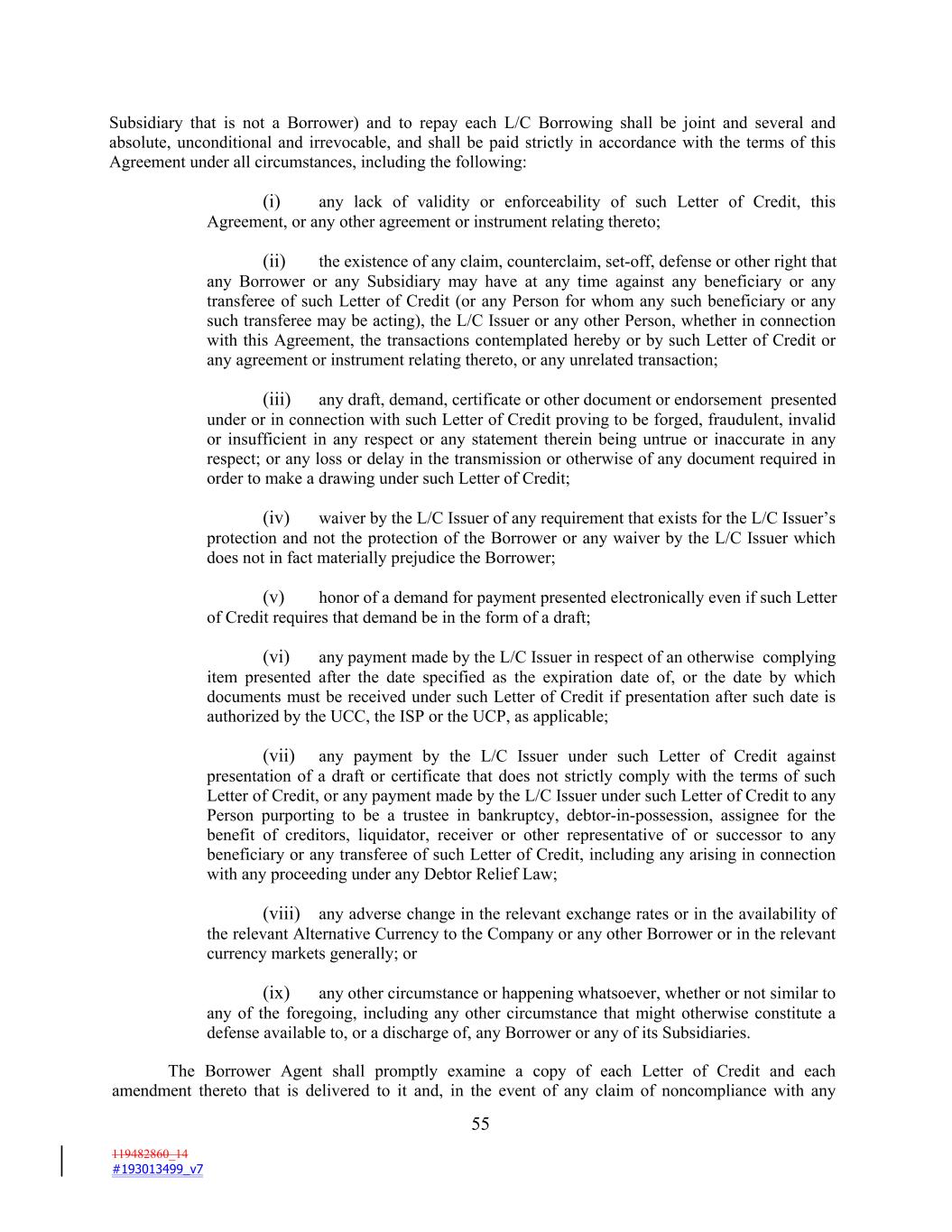 Subsidiary that is not a Borrower) and to repay each L/C Borrowing shall be joint and several and absolute, unconditional and irrevocable, and shall be paid strictly in accordance with the terms of this Agreement under all circumstances, including the following: (i) any lack of validity or enforceability of such Letter of Credit, this Agreement, or any other agreement or instrument relating thereto; (ii) the existence of any claim, counterclaim, set-off, defense or other right that any Borrower or any Subsidiary may have at any time against any beneficiary or any transferee of such Letter of Credit (or any Person for whom any such beneficiary or any such transferee may be acting), the L/C Issuer or any other Person, whether in connection with this Agreement, the transactions contemplated hereby or by such Letter of Credit or any agreement or instrument relating thereto, or any unrelated transaction; (iii) any draft, demand, certificate or other document or endorsement presented under or in connection with such Letter of Credit proving to be forged, fraudulent, invalid or insufficient in any respect or any statement therein being untrue or inaccurate in any respect; or any loss or delay in the transmission or otherwise of any document required in order to make a drawing under such Letter of Credit; (iv) waiver by the L/C Issuer of any requirement that exists for the L/C Issuer’s protection and not the protection of the Borrower or any waiver by the L/C Issuer which does not in fact materially prejudice the Borrower; (v) honor of a demand for payment presented electronically even if such Letter of Credit requires that demand be in the form of a draft; (vi) any payment made by the L/C Issuer in respect of an otherwise complying item presented after the date specified as the expiration date of, or the date by which documents must be received under such Letter of Credit if presentation after such date is authorized by the UCC, the ISP or the UCP, as applicable; (vii) any payment by the L/C Issuer under such Letter of Credit against presentation of a draft or certificate that does not strictly comply with the terms of such Letter of Credit, or any payment made by the L/C Issuer under such Letter of Credit to any Person purporting to be a trustee in bankruptcy, debtor-in-possession, assignee for the benefit of creditors, liquidator, receiver or other representative of or successor to any beneficiary or any transferee of such Letter of Credit, including any arising in connection with any proceeding under any Debtor Relief Law; (viii) any adverse change in the relevant exchange rates or in the availability of the relevant Alternative Currency to the Company or any other Borrower or in the relevant currency markets generally; or (ix) any other circumstance or happening whatsoever, whether or not similar to any of the foregoing, including any other circumstance that might otherwise constitute a defense available to, or a discharge of, any Borrower or any of its Subsidiaries. The Borrower Agent shall promptly examine a copy of each Letter of Credit and each amendment thereto that is delivered to it and, in the event of any claim of noncompliance with any 55 119482860_14 #193013499_v7