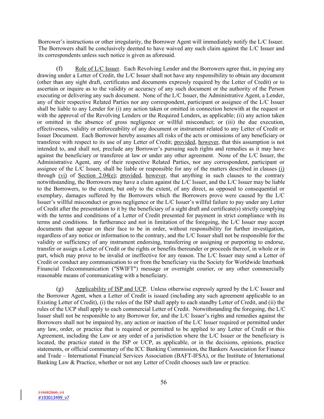 Borrower’s instructions or other irregularity, the Borrower Agent will immediately notify the L/C Issuer. The Borrowers shall be conclusively deemed to have waived any such claim against the L/C Issuer and its correspondents unless such notice is given as aforesaid. (f) Role of L/C Issuer. Each Revolving Lender and the Borrowers agree that, in paying any drawing under a Letter of Credit, the L/C Issuer shall not have any responsibility to obtain any document (other than any sight draft, certificates and documents expressly required by the Letter of Credit) or to ascertain or inquire as to the validity or accuracy of any such document or the authority of the Person executing or delivering any such document. None of the L/C Issuer, the Administrative Agent, a Lender, any of their respective Related Parties nor any correspondent, participant or assignee of the L/C Issuer shall be liable to any Lender for (i) any action taken or omitted in connection herewith at the request or with the approval of the Revolving Lenders or the Required Lenders, as applicable; (ii) any action taken or omitted in the absence of gross negligence or willful misconduct; or (iii) the due execution, effectiveness, validity or enforceability of any document or instrument related to any Letter of Credit or Issuer Document. Each Borrower hereby assumes all risks of the acts or omissions of any beneficiary or transferee with respect to its use of any Letter of Credit; provided, however, that this assumption is not intended to, and shall not, preclude any Borrower’s pursuing such rights and remedies as it may have against the beneficiary or transferee at law or under any other agreement. None of the L/C Issuer, the Administrative Agent, any of their respective Related Parties, nor any correspondent, participant or assignee of the L/C Issuer, shall be liable or responsible for any of the matters described in clauses (i) through (vi) of Section 2.04(e); provided, however, that anything in such clauses to the contrary notwithstanding, the Borrowers may have a claim against the L/C Issuer, and the L/C Issuer may be liable to the Borrowers, to the extent, but only to the extent, of any direct, as opposed to consequential or exemplary, damages suffered by the Borrowers which the Borrowers prove were caused by the L/C Issuer’s willful misconduct or gross negligence or the L/C Issuer’s willful failure to pay under any Letter of Credit after the presentation to it by the beneficiary of a sight draft and certificate(s) strictly complying with the terms and conditions of a Letter of Credit presented for payment in strict compliance with its terms and conditions. In furtherance and not in limitation of the foregoing, the L/C Issuer may accept documents that appear on their face to be in order, without responsibility for further investigation, regardless of any notice or information to the contrary, and the L/C Issuer shall not be responsible for the validity or sufficiency of any instrument endorsing, transferring or assigning or purporting to endorse, transfer or assign a Letter of Credit or the rights or benefits thereunder or proceeds thereof, in whole or in part, which may prove to be invalid or ineffective for any reason. The L/C Issuer may send a Letter of Credit or conduct any communication to or from the beneficiary via the Society for Worldwide Interbank Financial Telecommunication ("SWIFT") message or overnight courier, or any other commercially reasonable means of communicating with a beneficiary. (g) Applicability of ISP and UCP. Unless otherwise expressly agreed by the L/C Issuer and the Borrower Agent, when a Letter of Credit is issued (including any such agreement applicable to an Existing Letter of Credit), (i) the rules of the ISP shall apply to each standby Letter of Credit, and (ii) the rules of the UCP shall apply to each commercial Letter of Credit. Notwithstanding the foregoing, the L/C Issuer shall not be responsible to any Borrower for, and the L/C Issuer’s rights and remedies against the Borrowers shall not be impaired by, any action or inaction of the L/C Issuer required or permitted under any law, order, or practice that is required or permitted to be applied to any Letter of Credit or this Agreement, including the Law or any order of a jurisdiction where the L/C Issuer or the beneficiary is located, the practice stated in the ISP or UCP, as applicable, or in the decisions, opinions, practice statements, or official commentary of the ICC Banking Commission, the Bankers Association for Finance and Trade – International Financial Services Association (BAFT-IFSA), or the Institute of International Banking Law & Practice, whether or not any Letter of Credit chooses such law or practice. 56 119482860_14 #193013499_v7