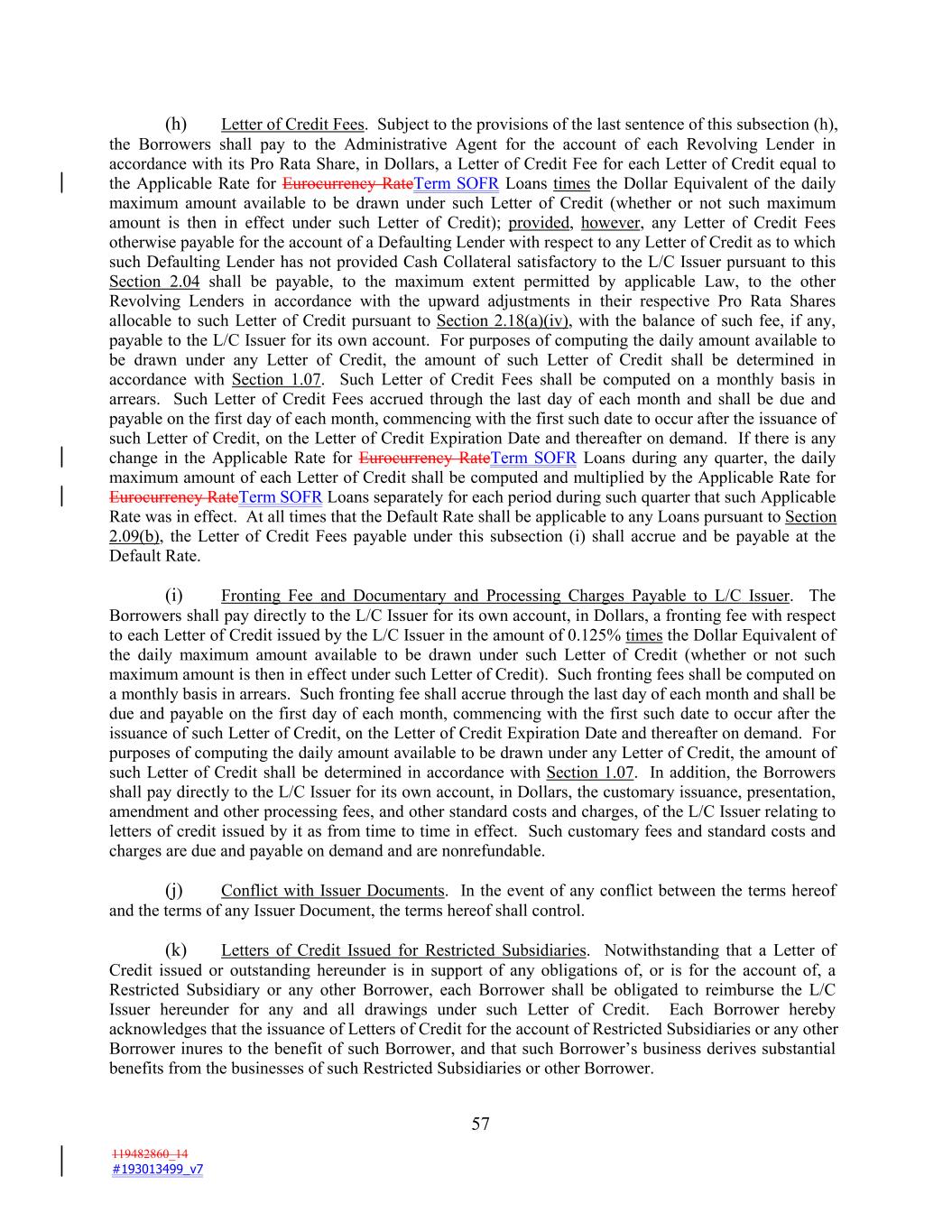 (h) Letter of Credit Fees. Subject to the provisions of the last sentence of this subsection (h), the Borrowers shall pay to the Administrative Agent for the account of each Revolving Lender in accordance with its Pro Rata Share, in Dollars, a Letter of Credit Fee for each Letter of Credit equal to the Applicable Rate for Eurocurrency RateTerm SOFR Loans times the Dollar Equivalent of the daily maximum amount available to be drawn under such Letter of Credit (whether or not such maximum amount is then in effect under such Letter of Credit); provided, however, any Letter of Credit Fees otherwise payable for the account of a Defaulting Lender with respect to any Letter of Credit as to which such Defaulting Lender has not provided Cash Collateral satisfactory to the L/C Issuer pursuant to this Section 2.04 shall be payable, to the maximum extent permitted by applicable Law, to the other Revolving Lenders in accordance with the upward adjustments in their respective Pro Rata Shares allocable to such Letter of Credit pursuant to Section 2.18(a)(iv), with the balance of such fee, if any, payable to the L/C Issuer for its own account. For purposes of computing the daily amount available to be drawn under any Letter of Credit, the amount of such Letter of Credit shall be determined in accordance with Section 1.07. Such Letter of Credit Fees shall be computed on a monthly basis in arrears. Such Letter of Credit Fees accrued through the last day of each month and shall be due and payable on the first day of each month, commencing with the first such date to occur after the issuance of such Letter of Credit, on the Letter of Credit Expiration Date and thereafter on demand. If there is any change in the Applicable Rate for Eurocurrency RateTerm SOFR Loans during any quarter, the daily maximum amount of each Letter of Credit shall be computed and multiplied by the Applicable Rate for Eurocurrency RateTerm SOFR Loans separately for each period during such quarter that such Applicable Rate was in effect. At all times that the Default Rate shall be applicable to any Loans pursuant to Section 2.09(b), the Letter of Credit Fees payable under this subsection (i) shall accrue and be payable at the Default Rate. (i) Fronting Fee and Documentary and Processing Charges Payable to L/C Issuer. The Borrowers shall pay directly to the L/C Issuer for its own account, in Dollars, a fronting fee with respect to each Letter of Credit issued by the L/C Issuer in the amount of 0.125% times the Dollar Equivalent of the daily maximum amount available to be drawn under such Letter of Credit (whether or not such maximum amount is then in effect under such Letter of Credit). Such fronting fees shall be computed on a monthly basis in arrears. Such fronting fee shall accrue through the last day of each month and shall be due and payable on the first day of each month, commencing with the first such date to occur after the issuance of such Letter of Credit, on the Letter of Credit Expiration Date and thereafter on demand. For purposes of computing the daily amount available to be drawn under any Letter of Credit, the amount of such Letter of Credit shall be determined in accordance with Section 1.07. In addition, the Borrowers shall pay directly to the L/C Issuer for its own account, in Dollars, the customary issuance, presentation, amendment and other processing fees, and other standard costs and charges, of the L/C Issuer relating to letters of credit issued by it as from time to time in effect. Such customary fees and standard costs and charges are due and payable on demand and are nonrefundable. (j) Conflict with Issuer Documents. In the event of any conflict between the terms hereof and the terms of any Issuer Document, the terms hereof shall control. (k) Letters of Credit Issued for Restricted Subsidiaries. Notwithstanding that a Letter of Credit issued or outstanding hereunder is in support of any obligations of, or is for the account of, a Restricted Subsidiary or any other Borrower, each Borrower shall be obligated to reimburse the L/C Issuer hereunder for any and all drawings under such Letter of Credit. Each Borrower hereby acknowledges that the issuance of Letters of Credit for the account of Restricted Subsidiaries or any other Borrower inures to the benefit of such Borrower, and that such Borrower’s business derives substantial benefits from the businesses of such Restricted Subsidiaries or other Borrower. 57 119482860_14 #193013499_v7