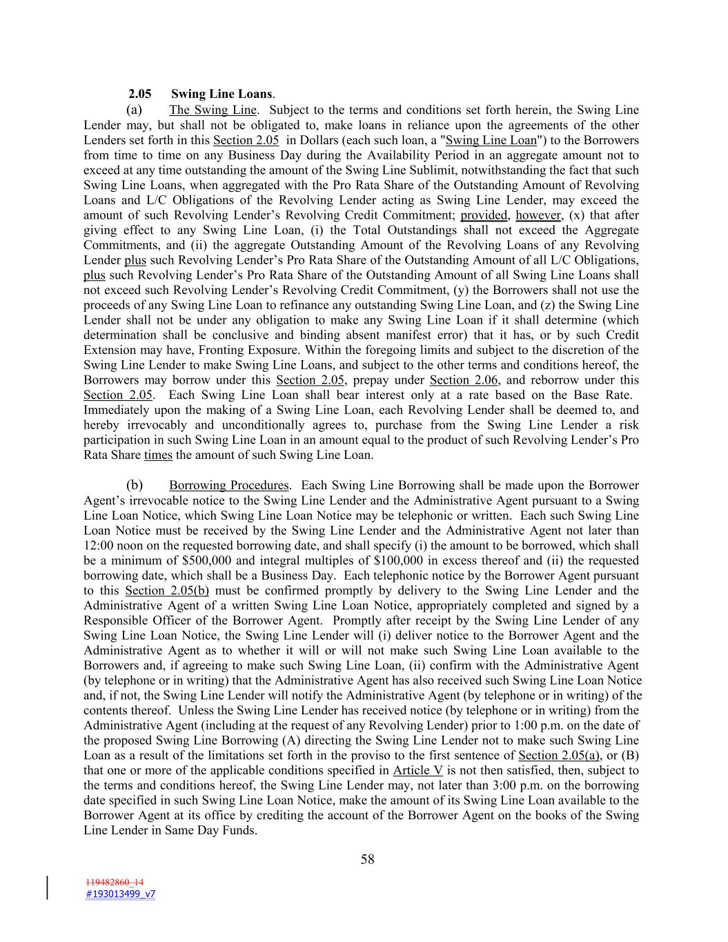 2.05 Swing Line Loans. (a) The Swing Line. Subject to the terms and conditions set forth herein, the Swing Line Lender may, but shall not be obligated to, make loans in reliance upon the agreements of the other Lenders set forth in this Section 2.05 in Dollars (each such loan, a "Swing Line Loan") to the Borrowers from time to time on any Business Day during the Availability Period in an aggregate amount not to exceed at any time outstanding the amount of the Swing Line Sublimit, notwithstanding the fact that such Swing Line Loans, when aggregated with the Pro Rata Share of the Outstanding Amount of Revolving Loans and L/C Obligations of the Revolving Lender acting as Swing Line Lender, may exceed the amount of such Revolving Lender’s Revolving Credit Commitment; provided, however, (x) that after giving effect to any Swing Line Loan, (i) the Total Outstandings shall not exceed the Aggregate Commitments, and (ii) the aggregate Outstanding Amount of the Revolving Loans of any Revolving Lender plus such Revolving Lender’s Pro Rata Share of the Outstanding Amount of all L/C Obligations, plus such Revolving Lender’s Pro Rata Share of the Outstanding Amount of all Swing Line Loans shall not exceed such Revolving Lender’s Revolving Credit Commitment, (y) the Borrowers shall not use the proceeds of any Swing Line Loan to refinance any outstanding Swing Line Loan, and (z) the Swing Line Lender shall not be under any obligation to make any Swing Line Loan if it shall determine (which determination shall be conclusive and binding absent manifest error) that it has, or by such Credit Extension may have, Fronting Exposure. Within the foregoing limits and subject to the discretion of the Swing Line Lender to make Swing Line Loans, and subject to the other terms and conditions hereof, the Borrowers may borrow under this Section 2.05, prepay under Section 2.06, and reborrow under this Section 2.05. Each Swing Line Loan shall bear interest only at a rate based on the Base Rate. Immediately upon the making of a Swing Line Loan, each Revolving Lender shall be deemed to, and hereby irrevocably and unconditionally agrees to, purchase from the Swing Line Lender a risk participation in such Swing Line Loan in an amount equal to the product of such Revolving Lender’s Pro Rata Share times the amount of such Swing Line Loan. (b) Borrowing Procedures. Each Swing Line Borrowing shall be made upon the Borrower Agent’s irrevocable notice to the Swing Line Lender and the Administrative Agent pursuant to a Swing Line Loan Notice, which Swing Line Loan Notice may be telephonic or written. Each such Swing Line Loan Notice must be received by the Swing Line Lender and the Administrative Agent not later than 12:00 noon on the requested borrowing date, and shall specify (i) the amount to be borrowed, which shall be a minimum of $500,000 and integral multiples of $100,000 in excess thereof and (ii) the requested borrowing date, which shall be a Business Day. Each telephonic notice by the Borrower Agent pursuant to this Section 2.05(b) must be confirmed promptly by delivery to the Swing Line Lender and the Administrative Agent of a written Swing Line Loan Notice, appropriately completed and signed by a Responsible Officer of the Borrower Agent. Promptly after receipt by the Swing Line Lender of any Swing Line Loan Notice, the Swing Line Lender will (i) deliver notice to the Borrower Agent and the Administrative Agent as to whether it will or will not make such Swing Line Loan available to the Borrowers and, if agreeing to make such Swing Line Loan, (ii) confirm with the Administrative Agent (by telephone or in writing) that the Administrative Agent has also received such Swing Line Loan Notice and, if not, the Swing Line Lender will notify the Administrative Agent (by telephone or in writing) of the contents thereof. Unless the Swing Line Lender has received notice (by telephone or in writing) from the Administrative Agent (including at the request of any Revolving Lender) prior to 1:00 p.m. on the date of the proposed Swing Line Borrowing (A) directing the Swing Line Lender not to make such Swing Line Loan as a result of the limitations set forth in the proviso to the first sentence of Section 2.05(a), or (B) that one or more of the applicable conditions specified in Article V is not then satisfied, then, subject to the terms and conditions hereof, the Swing Line Lender may, not later than 3:00 p.m. on the borrowing date specified in such Swing Line Loan Notice, make the amount of its Swing Line Loan available to the Borrower Agent at its office by crediting the account of the Borrower Agent on the books of the Swing Line Lender in Same Day Funds. 58 119482860_14 #193013499_v7