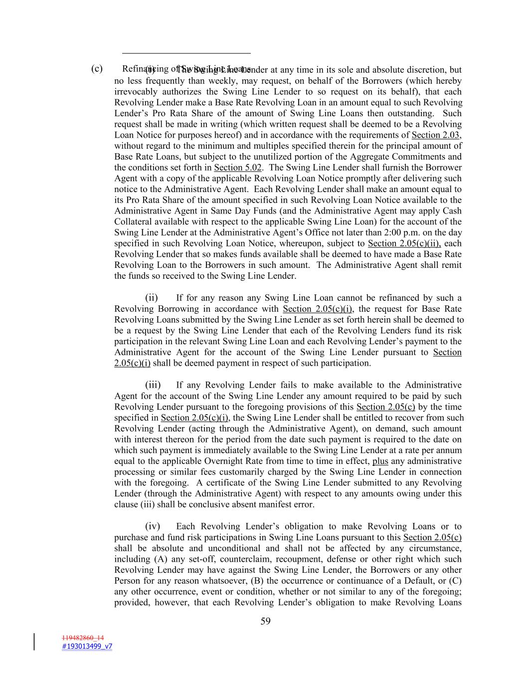 (c) Refinancing of Swing Line Loans.(i) The Swing Line Lender at any time in its sole and absolute discretion, but no less frequently than weekly, may request, on behalf of the Borrowers (which hereby irrevocably authorizes the Swing Line Lender to so request on its behalf), that each Revolving Lender make a Base Rate Revolving Loan in an amount equal to such Revolving Lender’s Pro Rata Share of the amount of Swing Line Loans then outstanding. Such request shall be made in writing (which written request shall be deemed to be a Revolving Loan Notice for purposes hereof) and in accordance with the requirements of Section 2.03, without regard to the minimum and multiples specified therein for the principal amount of Base Rate Loans, but subject to the unutilized portion of the Aggregate Commitments and the conditions set forth in Section 5.02. The Swing Line Lender shall furnish the Borrower Agent with a copy of the applicable Revolving Loan Notice promptly after delivering such notice to the Administrative Agent. Each Revolving Lender shall make an amount equal to its Pro Rata Share of the amount specified in such Revolving Loan Notice available to the Administrative Agent in Same Day Funds (and the Administrative Agent may apply Cash Collateral available with respect to the applicable Swing Line Loan) for the account of the Swing Line Lender at the Administrative Agent’s Office not later than 2:00 p.m. on the day specified in such Revolving Loan Notice, whereupon, subject to Section 2.05(c)(ii), each Revolving Lender that so makes funds available shall be deemed to have made a Base Rate Revolving Loan to the Borrowers in such amount. The Administrative Agent shall remit the funds so received to the Swing Line Lender. (ii) If for any reason any Swing Line Loan cannot be refinanced by such a Revolving Borrowing in accordance with Section 2.05(c)(i), the request for Base Rate Revolving Loans submitted by the Swing Line Lender as set forth herein shall be deemed to be a request by the Swing Line Lender that each of the Revolving Lenders fund its risk participation in the relevant Swing Line Loan and each Revolving Lender’s payment to the Administrative Agent for the account of the Swing Line Lender pursuant to Section 2.05(c)(i) shall be deemed payment in respect of such participation. (iii) If any Revolving Lender fails to make available to the Administrative Agent for the account of the Swing Line Lender any amount required to be paid by such Revolving Lender pursuant to the foregoing provisions of this Section 2.05(c) by the time specified in Section 2.05(c)(i), the Swing Line Lender shall be entitled to recover from such Revolving Lender (acting through the Administrative Agent), on demand, such amount with interest thereon for the period from the date such payment is required to the date on which such payment is immediately available to the Swing Line Lender at a rate per annum equal to the applicable Overnight Rate from time to time in effect, plus any administrative processing or similar fees customarily charged by the Swing Line Lender in connection with the foregoing. A certificate of the Swing Line Lender submitted to any Revolving Lender (through the Administrative Agent) with respect to any amounts owing under this clause (iii) shall be conclusive absent manifest error. (iv) Each Revolving Lender’s obligation to make Revolving Loans or to purchase and fund risk participations in Swing Line Loans pursuant to this Section 2.05(c) shall be absolute and unconditional and shall not be affected by any circumstance, including (A) any set-off, counterclaim, recoupment, defense or other right which such Revolving Lender may have against the Swing Line Lender, the Borrowers or any other Person for any reason whatsoever, (B) the occurrence or continuance of a Default, or (C) any other occurrence, event or condition, whether or not similar to any of the foregoing; provided, however, that each Revolving Lender’s obligation to make Revolving Loans 59 119482860_14 #193013499_v7