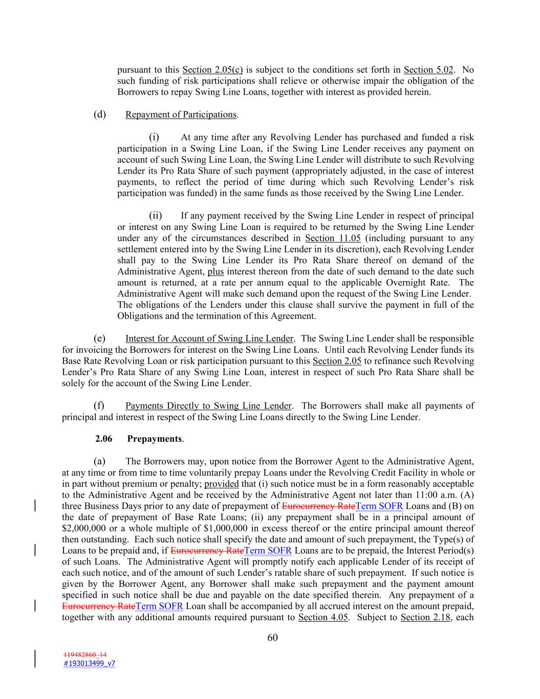 pursuant to this Section 2.05(c) is subject to the conditions set forth in Section 5.02. No such funding of risk participations shall relieve or otherwise impair the obligation of the Borrowers to repay Swing Line Loans, together with interest as provided herein. (d) Repayment of Participations. (i) At any time after any Revolving Lender has purchased and funded a risk participation in a Swing Line Loan, if the Swing Line Lender receives any payment on account of such Swing Line Loan, the Swing Line Lender will distribute to such Revolving Lender its Pro Rata Share of such payment (appropriately adjusted, in the case of interest payments, to reflect the period of time during which such Revolving Lender’s risk participation was funded) in the same funds as those received by the Swing Line Lender. (ii) If any payment received by the Swing Line Lender in respect of principal or interest on any Swing Line Loan is required to be returned by the Swing Line Lender under any of the circumstances described in Section 11.05 (including pursuant to any settlement entered into by the Swing Line Lender in its discretion), each Revolving Lender shall pay to the Swing Line Lender its Pro Rata Share thereof on demand of the Administrative Agent, plus interest thereon from the date of such demand to the date such amount is returned, at a rate per annum equal to the applicable Overnight Rate. The Administrative Agent will make such demand upon the request of the Swing Line Lender. The obligations of the Lenders under this clause shall survive the payment in full of the Obligations and the termination of this Agreement. (e) Interest for Account of Swing Line Lender. The Swing Line Lender shall be responsible for invoicing the Borrowers for interest on the Swing Line Loans. Until each Revolving Lender funds its Base Rate Revolving Loan or risk participation pursuant to this Section 2.05 to refinance such Revolving Lender’s Pro Rata Share of any Swing Line Loan, interest in respect of such Pro Rata Share shall be solely for the account of the Swing Line Lender. (f) Payments Directly to Swing Line Lender. The Borrowers shall make all payments of principal and interest in respect of the Swing Line Loans directly to the Swing Line Lender. 2.06 Prepayments. (a) The Borrowers may, upon notice from the Borrower Agent to the Administrative Agent, at any time or from time to time voluntarily prepay Loans under the Revolving Credit Facility in whole or in part without premium or penalty; provided that (i) such notice must be in a form reasonably acceptable to the Administrative Agent and be received by the Administrative Agent not later than 11:00 a.m. (A) three Business Days prior to any date of prepayment of Eurocurrency RateTerm SOFR Loans and (B) on the date of prepayment of Base Rate Loans; (ii) any prepayment shall be in a principal amount of $2,000,000 or a whole multiple of $1,000,000 in excess thereof or the entire principal amount thereof then outstanding. Each such notice shall specify the date and amount of such prepayment, the Type(s) of Loans to be prepaid and, if Eurocurrency RateTerm SOFR Loans are to be prepaid, the Interest Period(s) of such Loans. The Administrative Agent will promptly notify each applicable Lender of its receipt of each such notice, and of the amount of such Lender’s ratable share of such prepayment. If such notice is given by the Borrower Agent, any Borrower shall make such prepayment and the payment amount specified in such notice shall be due and payable on the date specified therein. Any prepayment of a Eurocurrency RateTerm SOFR Loan shall be accompanied by all accrued interest on the amount prepaid, together with any additional amounts required pursuant to Section 4.05. Subject to Section 2.18, each 60 119482860_14 #193013499_v7