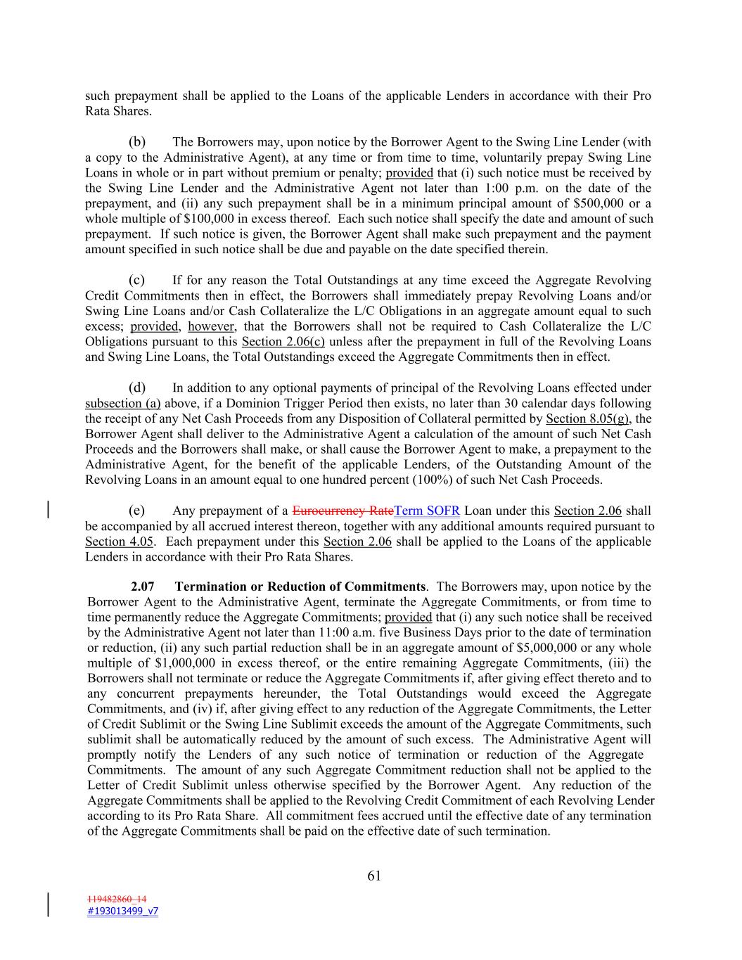 such prepayment shall be applied to the Loans of the applicable Lenders in accordance with their Pro Rata Shares. (b) The Borrowers may, upon notice by the Borrower Agent to the Swing Line Lender (with a copy to the Administrative Agent), at any time or from time to time, voluntarily prepay Swing Line Loans in whole or in part without premium or penalty; provided that (i) such notice must be received by the Swing Line Lender and the Administrative Agent not later than 1:00 p.m. on the date of the prepayment, and (ii) any such prepayment shall be in a minimum principal amount of $500,000 or a whole multiple of $100,000 in excess thereof. Each such notice shall specify the date and amount of such prepayment. If such notice is given, the Borrower Agent shall make such prepayment and the payment amount specified in such notice shall be due and payable on the date specified therein. (c) If for any reason the Total Outstandings at any time exceed the Aggregate Revolving Credit Commitments then in effect, the Borrowers shall immediately prepay Revolving Loans and/or Swing Line Loans and/or Cash Collateralize the L/C Obligations in an aggregate amount equal to such excess; provided, however, that the Borrowers shall not be required to Cash Collateralize the L/C Obligations pursuant to this Section 2.06(c) unless after the prepayment in full of the Revolving Loans and Swing Line Loans, the Total Outstandings exceed the Aggregate Commitments then in effect. (d) In addition to any optional payments of principal of the Revolving Loans effected under subsection (a) above, if a Dominion Trigger Period then exists, no later than 30 calendar days following the receipt of any Net Cash Proceeds from any Disposition of Collateral permitted by Section 8.05(g), the Borrower Agent shall deliver to the Administrative Agent a calculation of the amount of such Net Cash Proceeds and the Borrowers shall make, or shall cause the Borrower Agent to make, a prepayment to the Administrative Agent, for the benefit of the applicable Lenders, of the Outstanding Amount of the Revolving Loans in an amount equal to one hundred percent (100%) of such Net Cash Proceeds. (e) Any prepayment of a Eurocurrency RateTerm SOFR Loan under this Section 2.06 shall be accompanied by all accrued interest thereon, together with any additional amounts required pursuant to Section 4.05. Each prepayment under this Section 2.06 shall be applied to the Loans of the applicable Lenders in accordance with their Pro Rata Shares. 2.07 Termination or Reduction of Commitments. The Borrowers may, upon notice by the Borrower Agent to the Administrative Agent, terminate the Aggregate Commitments, or from time to time permanently reduce the Aggregate Commitments; provided that (i) any such notice shall be received by the Administrative Agent not later than 11:00 a.m. five Business Days prior to the date of termination or reduction, (ii) any such partial reduction shall be in an aggregate amount of $5,000,000 or any whole multiple of $1,000,000 in excess thereof, or the entire remaining Aggregate Commitments, (iii) the Borrowers shall not terminate or reduce the Aggregate Commitments if, after giving effect thereto and to any concurrent prepayments hereunder, the Total Outstandings would exceed the Aggregate Commitments, and (iv) if, after giving effect to any reduction of the Aggregate Commitments, the Letter of Credit Sublimit or the Swing Line Sublimit exceeds the amount of the Aggregate Commitments, such sublimit shall be automatically reduced by the amount of such excess. The Administrative Agent will promptly notify the Lenders of any such notice of termination or reduction of the Aggregate Commitments. The amount of any such Aggregate Commitment reduction shall not be applied to the Letter of Credit Sublimit unless otherwise specified by the Borrower Agent. Any reduction of the Aggregate Commitments shall be applied to the Revolving Credit Commitment of each Revolving Lender according to its Pro Rata Share. All commitment fees accrued until the effective date of any termination of the Aggregate Commitments shall be paid on the effective date of such termination. 61 119482860_14 #193013499_v7